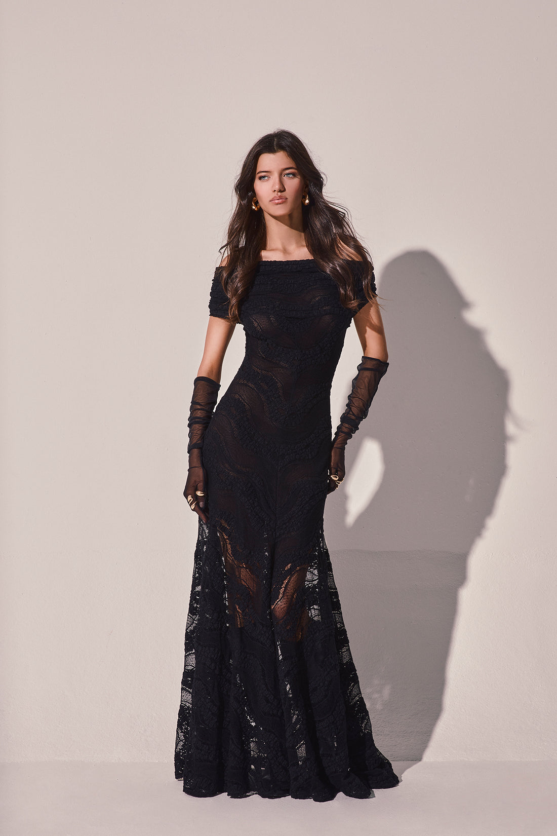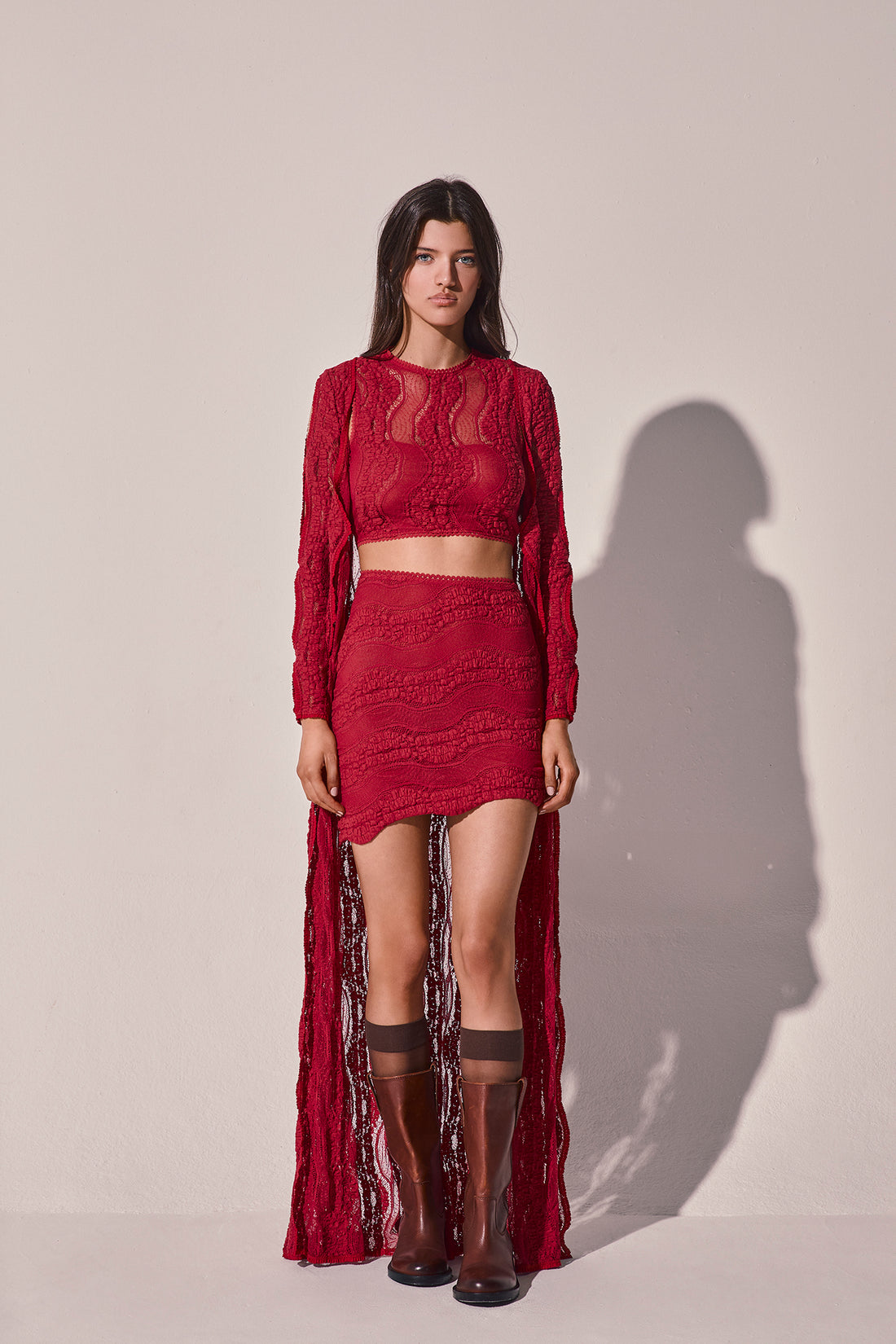 Nace del movimiento de las olas del mar: relieves ondulantes, transparencias y una paleta que viaja al misterio del fondo marino. Confeccionada en Mesh con dibujo en forma de ola, la colección esculpe volúmenes ceñidos que abrazan el cuerpo y propone faldas con caída y movimiento.