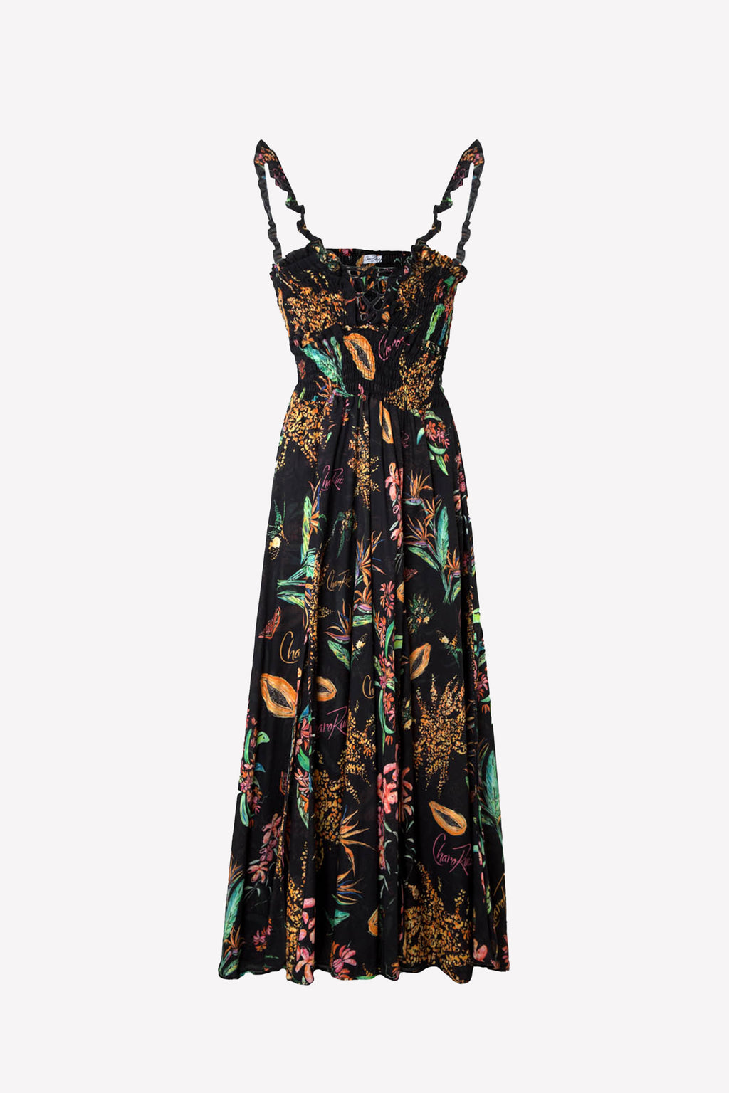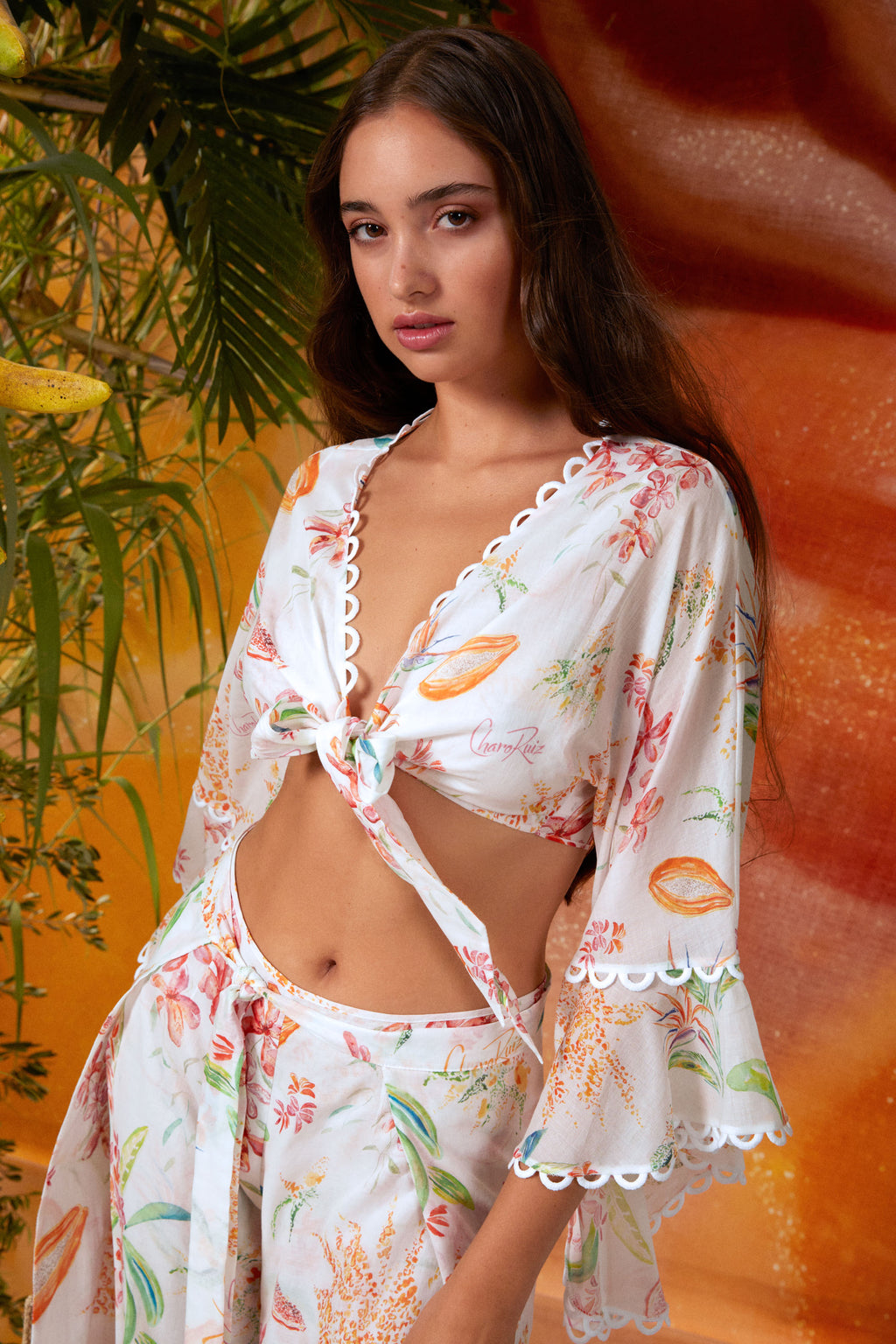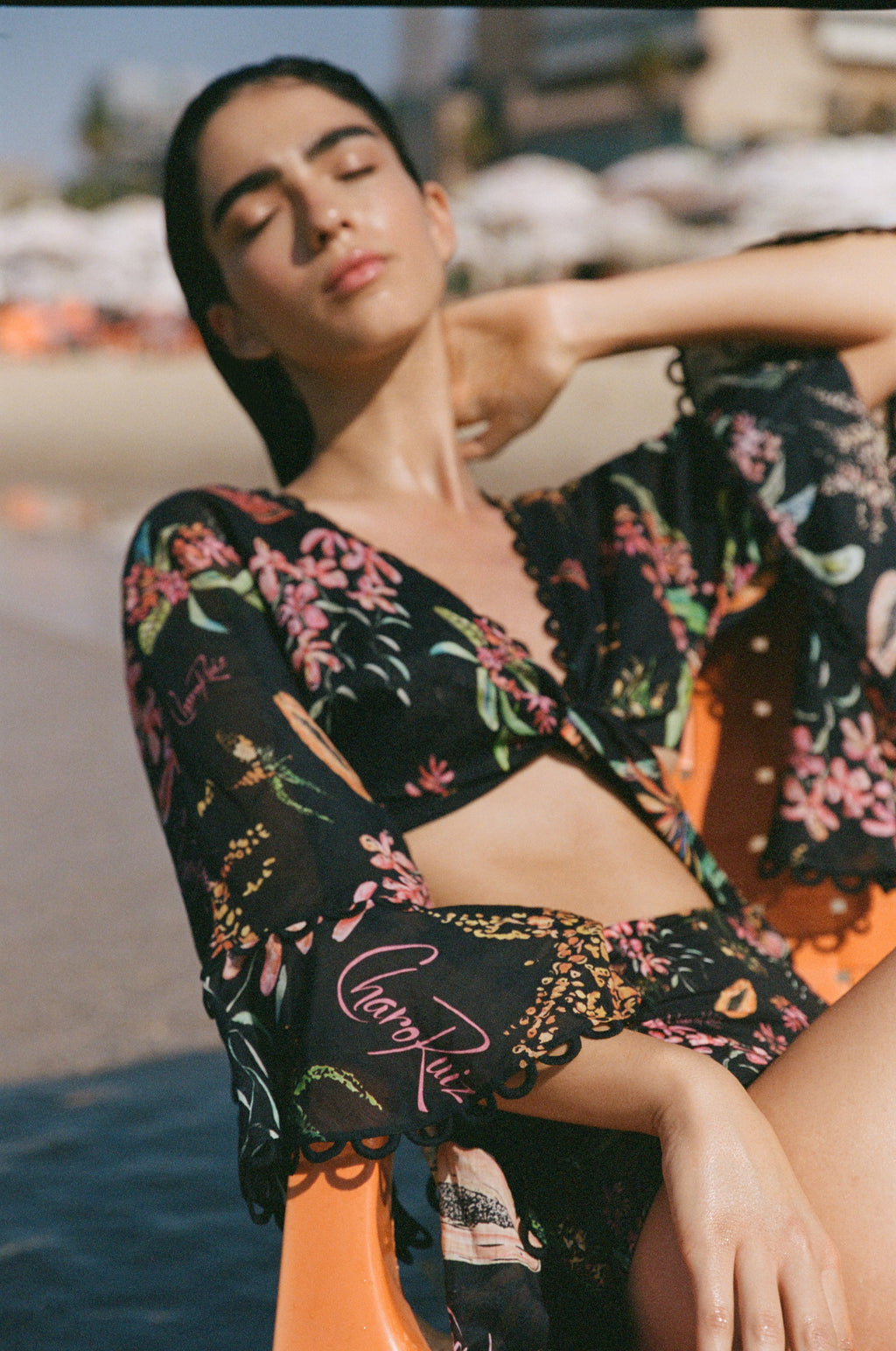 A La Fresca defines the celebration of a moment of taste and joy. The scents, flavours and textures of summer are represented in a print signed by Charo herself and surrounded by symbols of harmony and beauty; orchids, birds of paradise, mimosas, papayas and petals dedicated to all women who understand the divine sense of freedom.