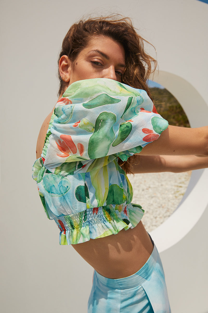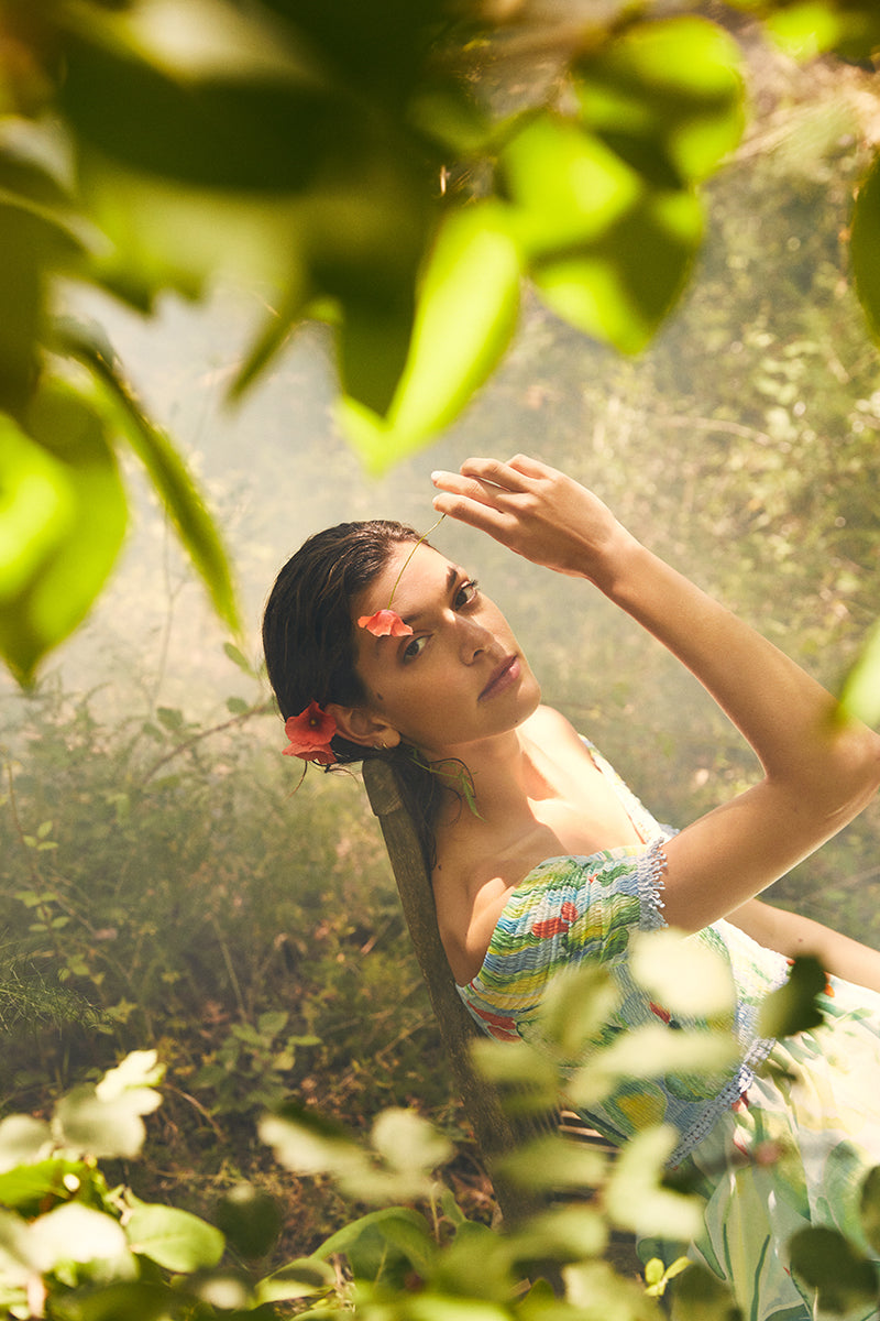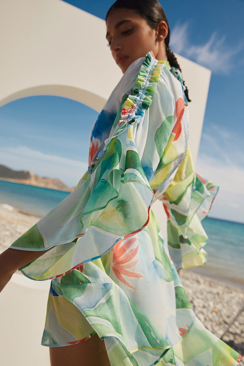Gathered puff sleeves, draping, smocking, and bluish guipure finishes turn this collection into a tribute to the encounter between Mediterranean freshness and the manifestation of art in its most physical form.