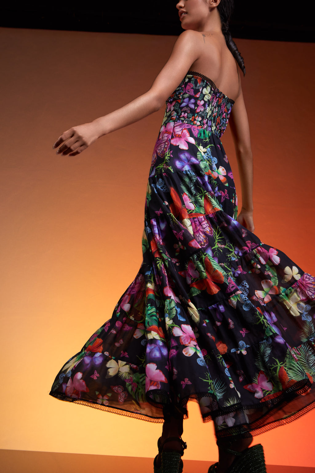 Our cotton voile once again becomes the perfect canvas for this vibrant hand-painted watercolor and gouache print. The ephemeral fluttering of the butterfly inspires this collection and gives it a fresh sense of freedom and femininity. The sinuous movements and fluid structures of this springtime drop make the pieces in this collection the epitome of beauty.