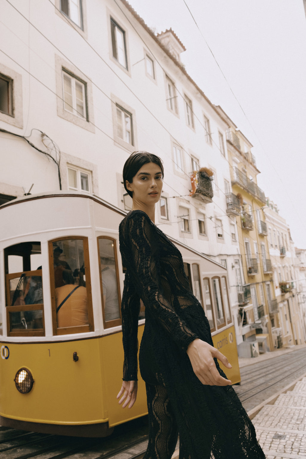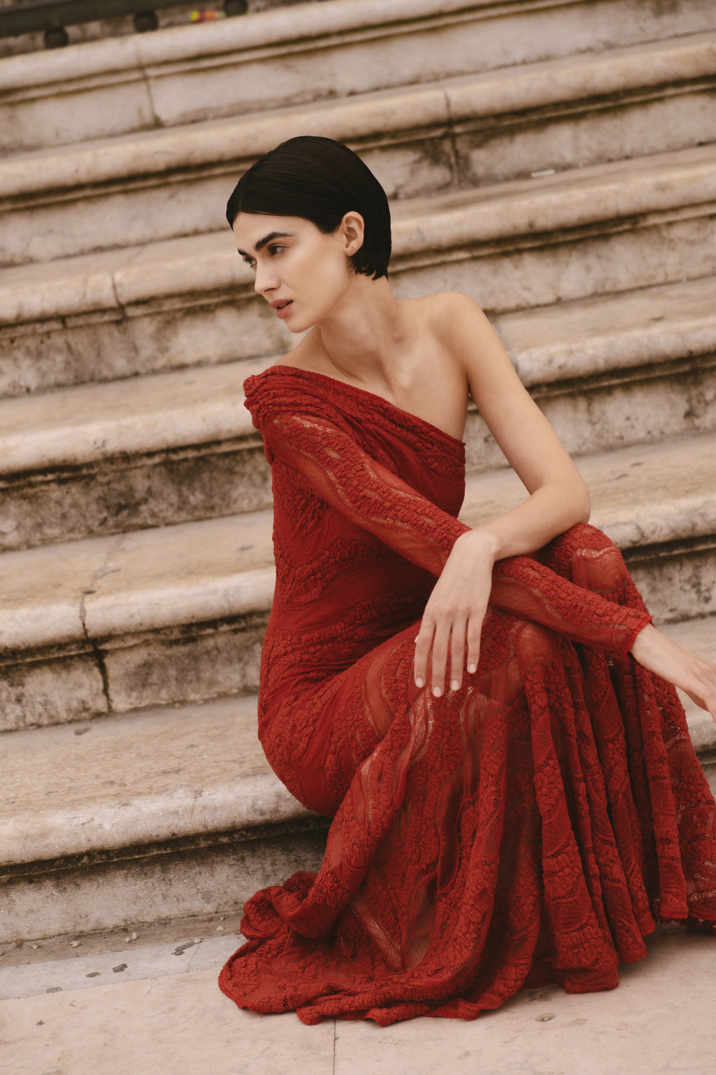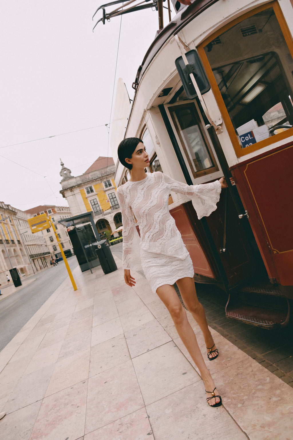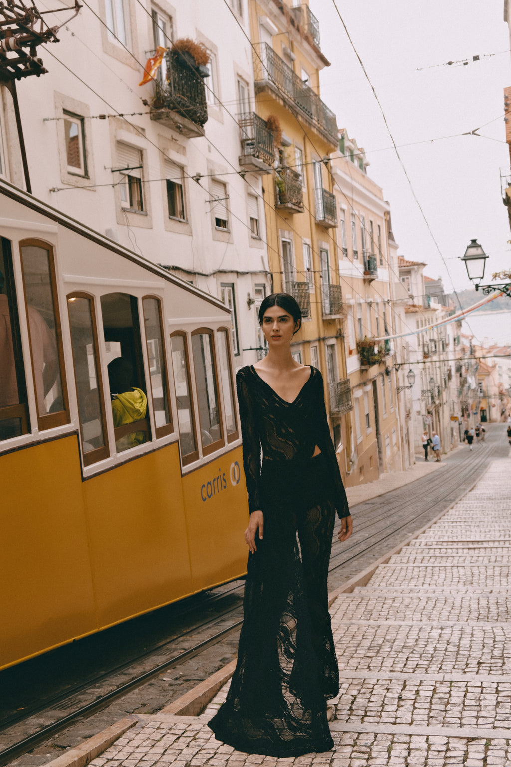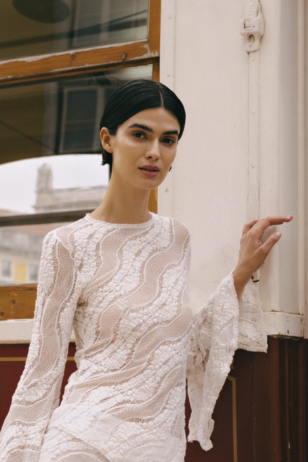 Born from the movement of the ocean waves: undulating textures, sheer effects, and a palette that dives into the mystery of the seabed. Crafted in mesh with a wave-shaped pattern, the collection sculpts form-fitting volumes that embrace the body and offers skirts with graceful drape and movement.