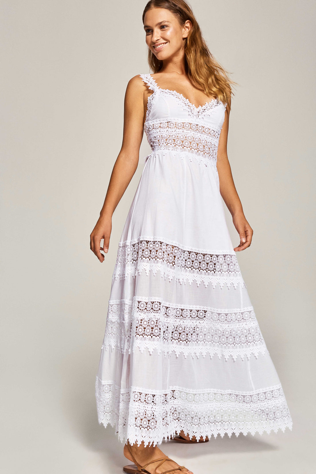 Intricate guipure panels and detailed straps, the maxi style of Sophia would be perfectly styled...