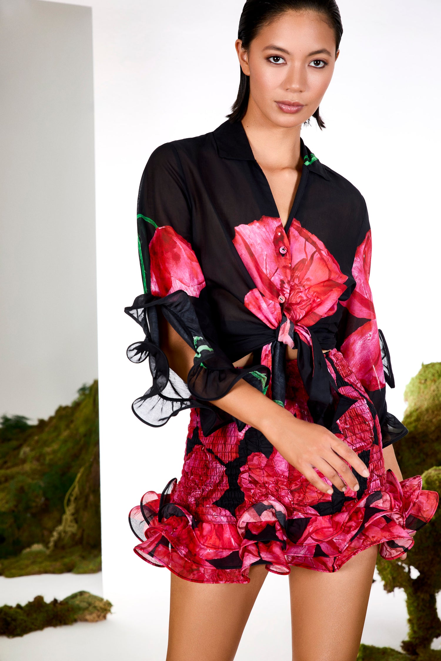 The success and magnificent result of the technique of watercolor and gouache by hand on our cotton voile is not a secret, but it is a novelty that the motifs come to life in 3D through the continuity of the ruffles on shirts, dresses and skirts of this vibrant collection. The symbolism of the ephemeral nature of a petal is the main message for this season; the joy of feeling alive and free in every moment through the light and vaporous structures that create striking and fluid movements to welcome spring 2025 as it deserves.
