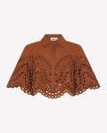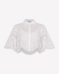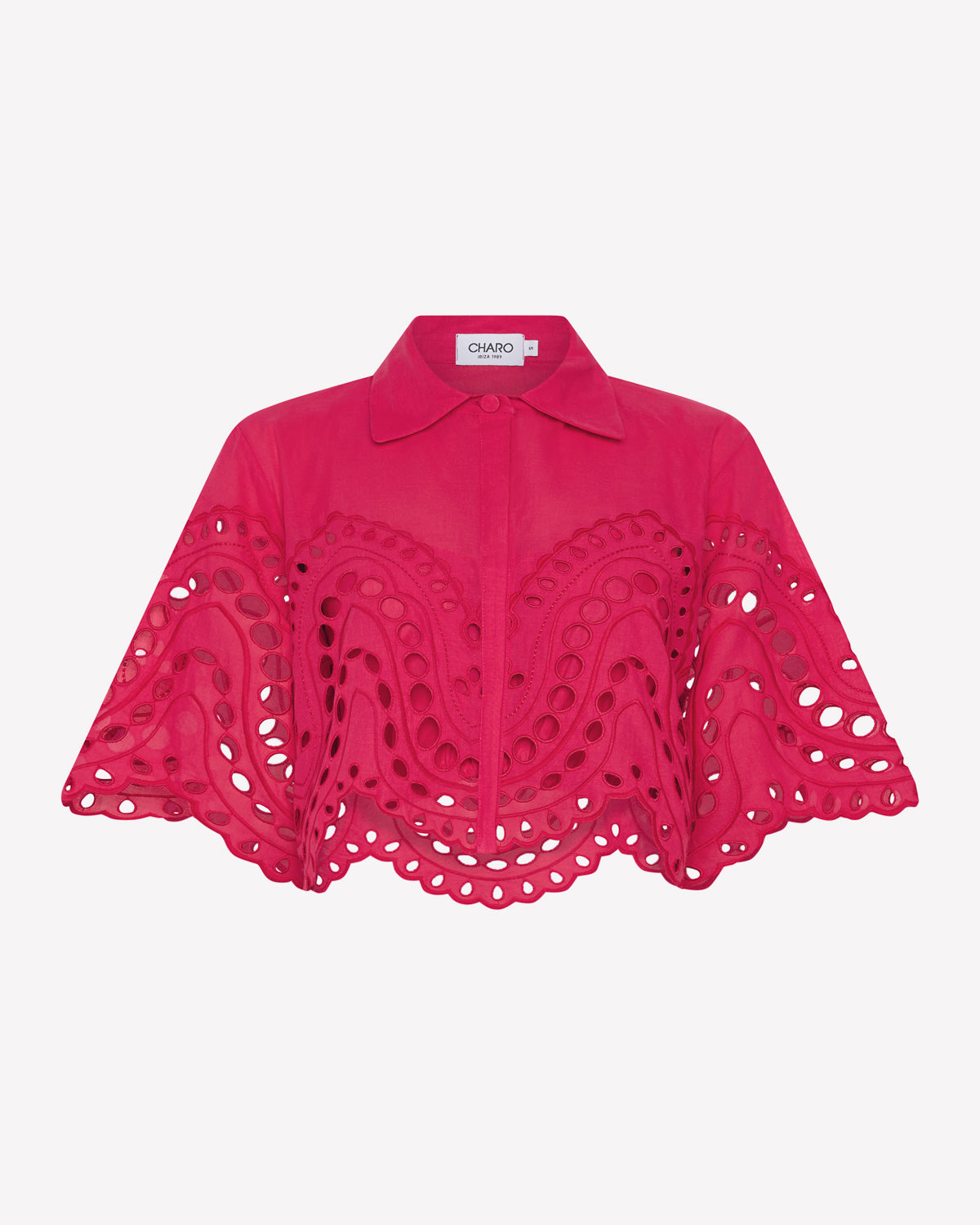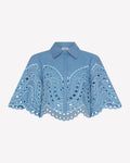 Its structured shirt collar and scallop-aligned sleeves create a harmonious, flattering silhouette. A versatile and distinctive piece, designed to pair effortlessly and elevate any outfit with timeless charm.