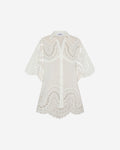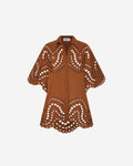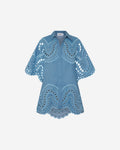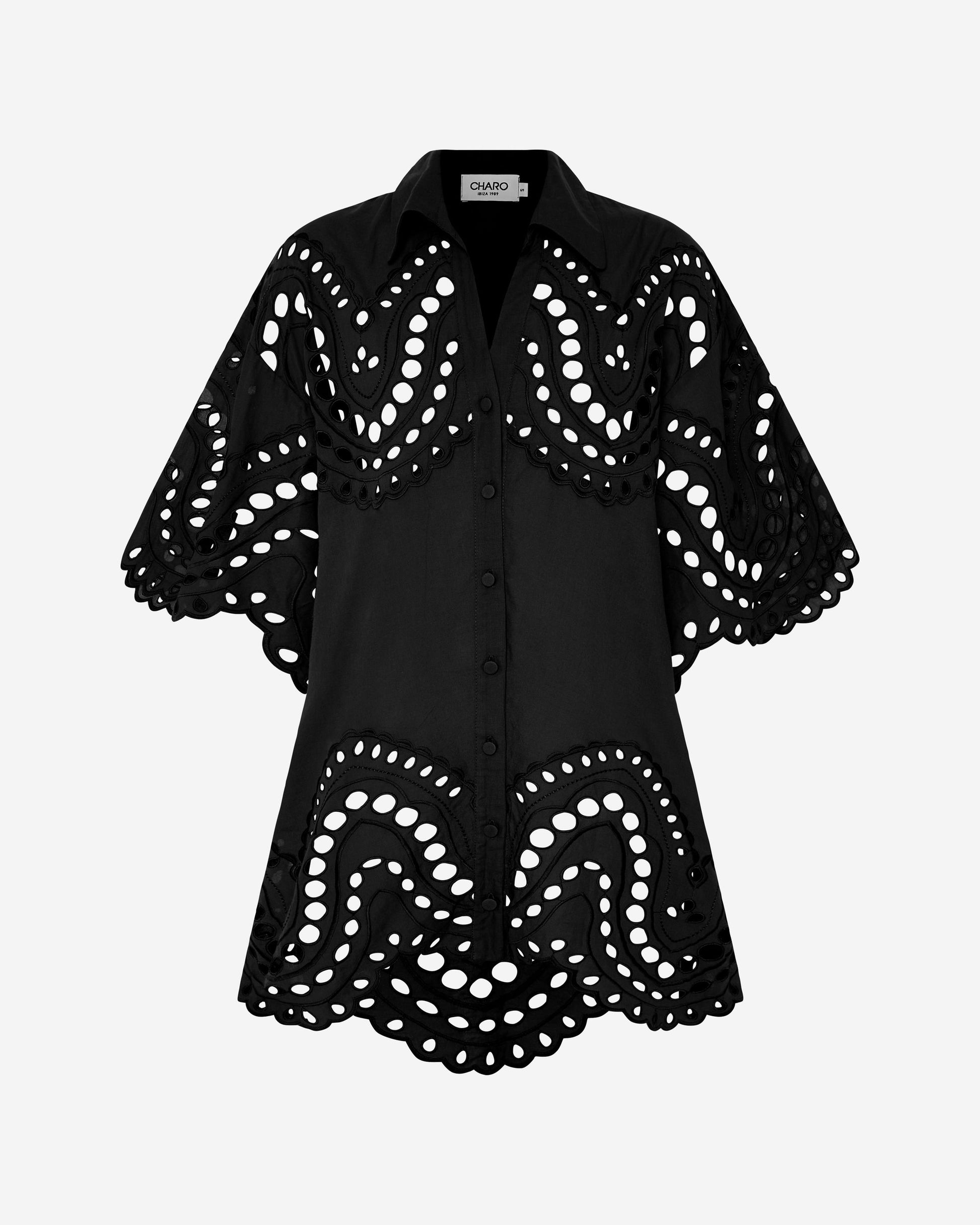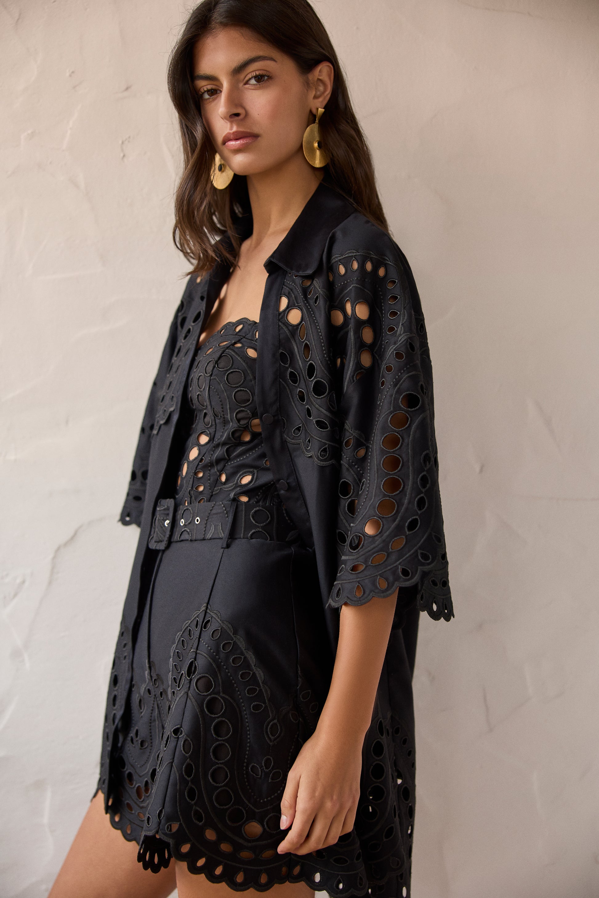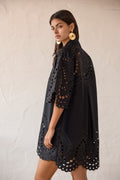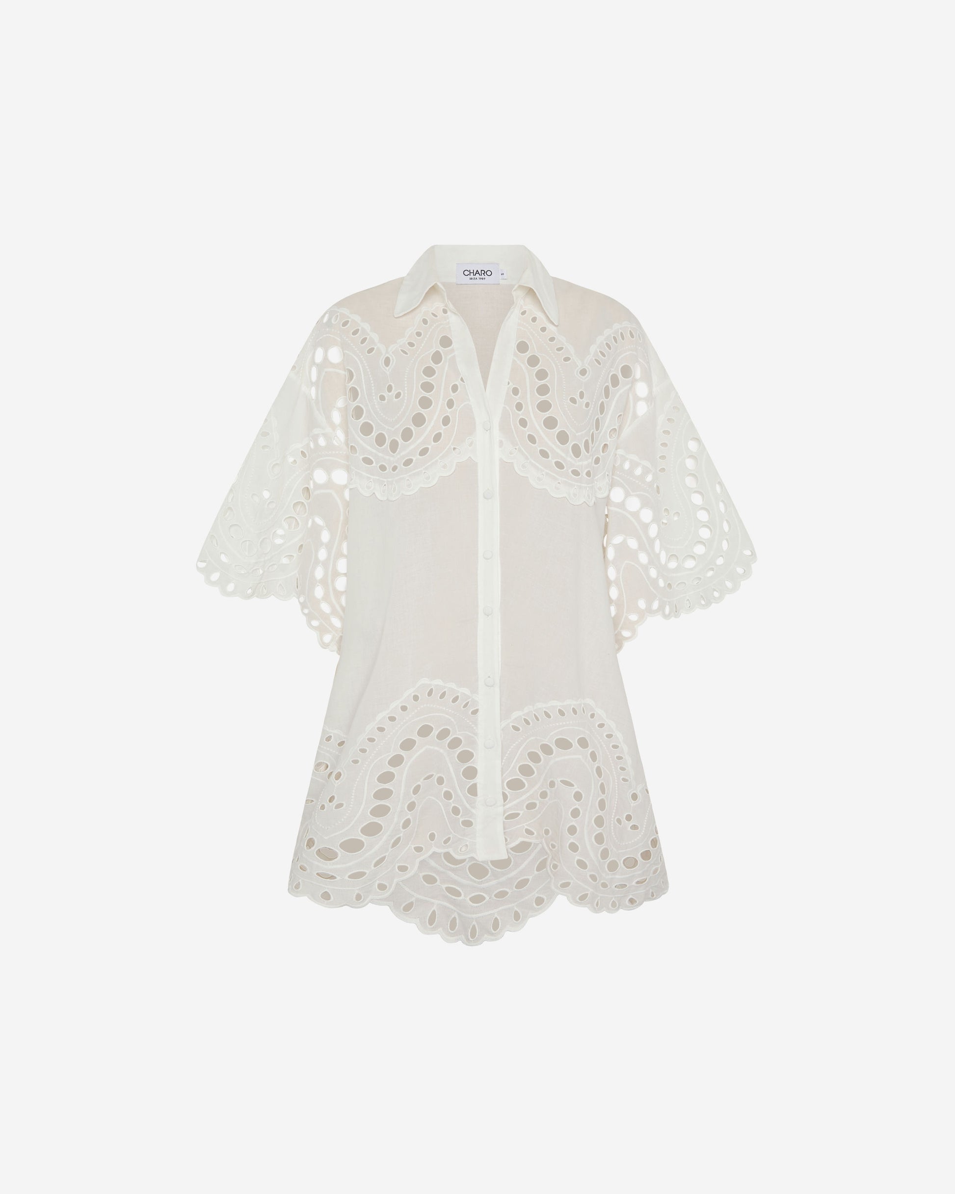 The TAO blouse blends comfort and sophistication in a breezy, relaxed silhouette. Crafted from embroidered cotton, it features artisanal cutwork flowing across the chest, sleeves, and hem in a graceful, wave-like pattern.