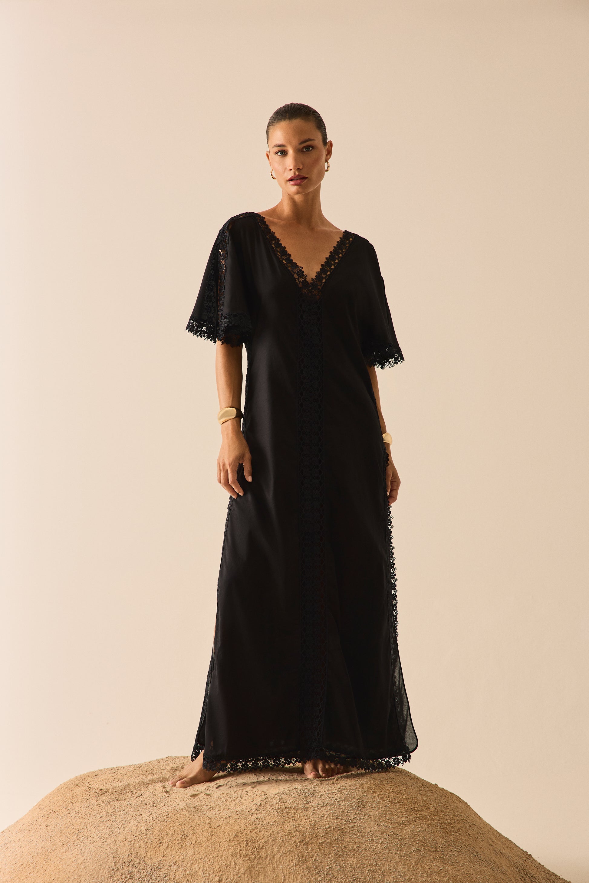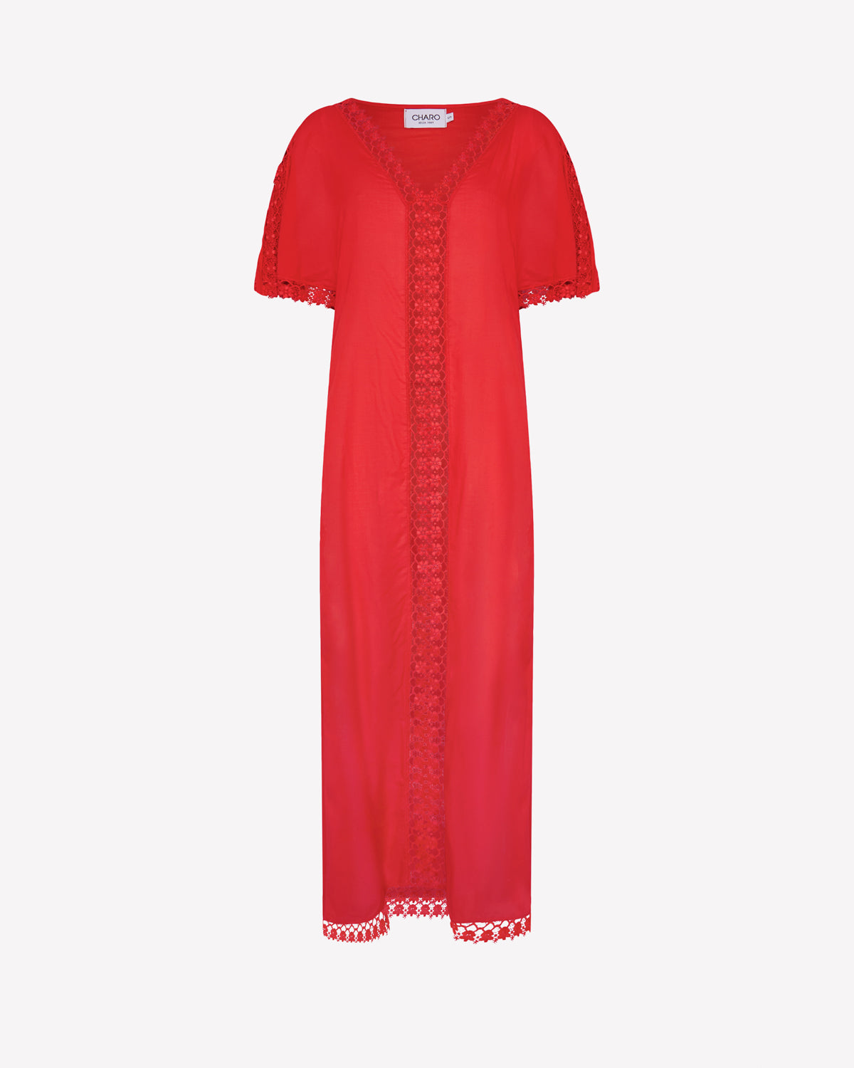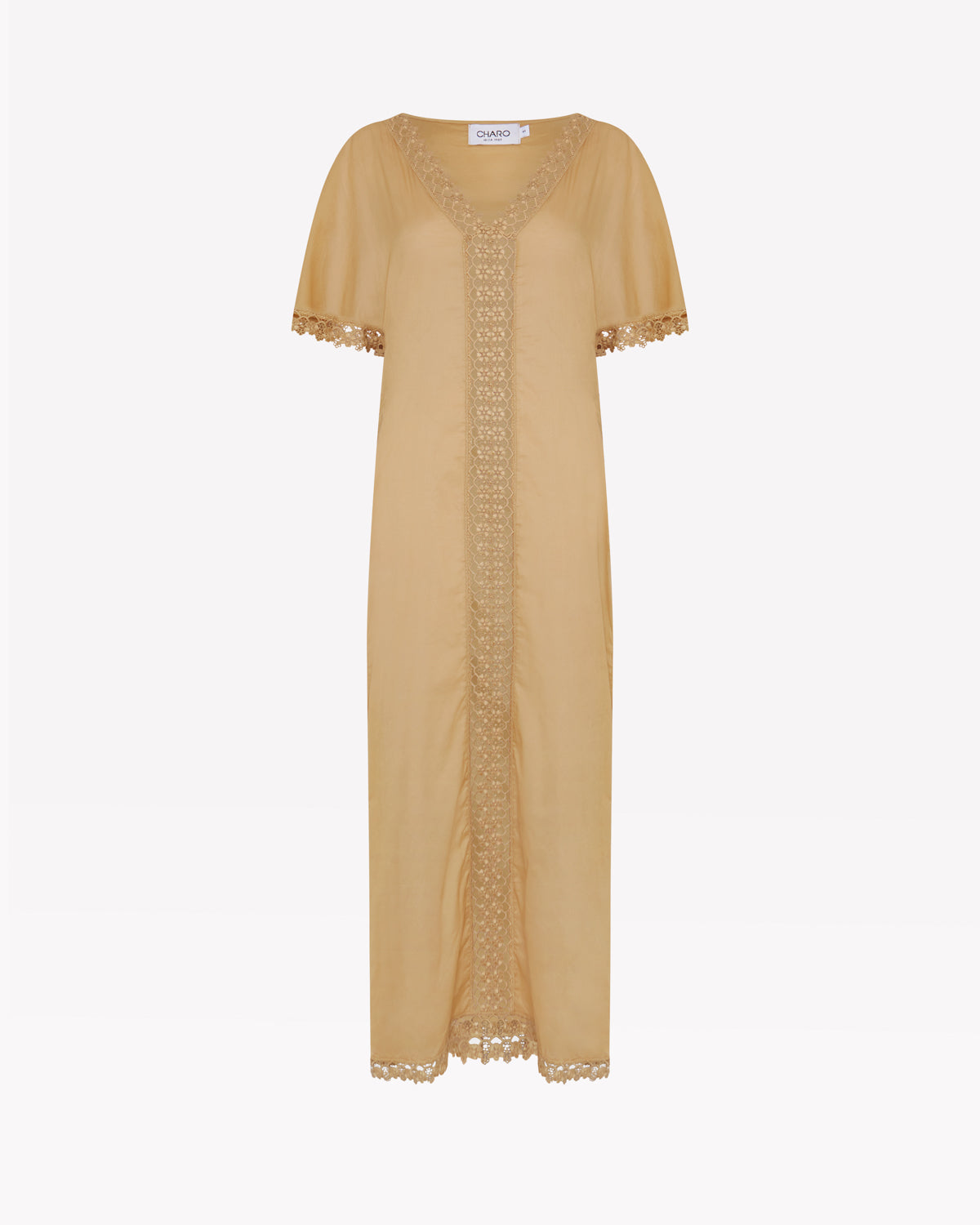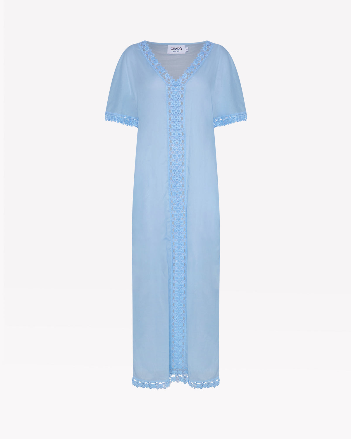 Discover the lightness and relaxed style of the SAENA kaftan, a versatile piece crafted from cotton that blends comfort and elegance. Its flowing design is adorned with delicate lace trims along the V-neckline, sleeves, and hem, adding an artisanal and feminine touch. Short sleeves and a straight cut make it perfect to wear over swimwear or as a breezy summer dress. A sophisticated essential for warm-weather looks with a natural, effortless charm.