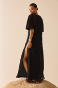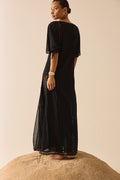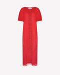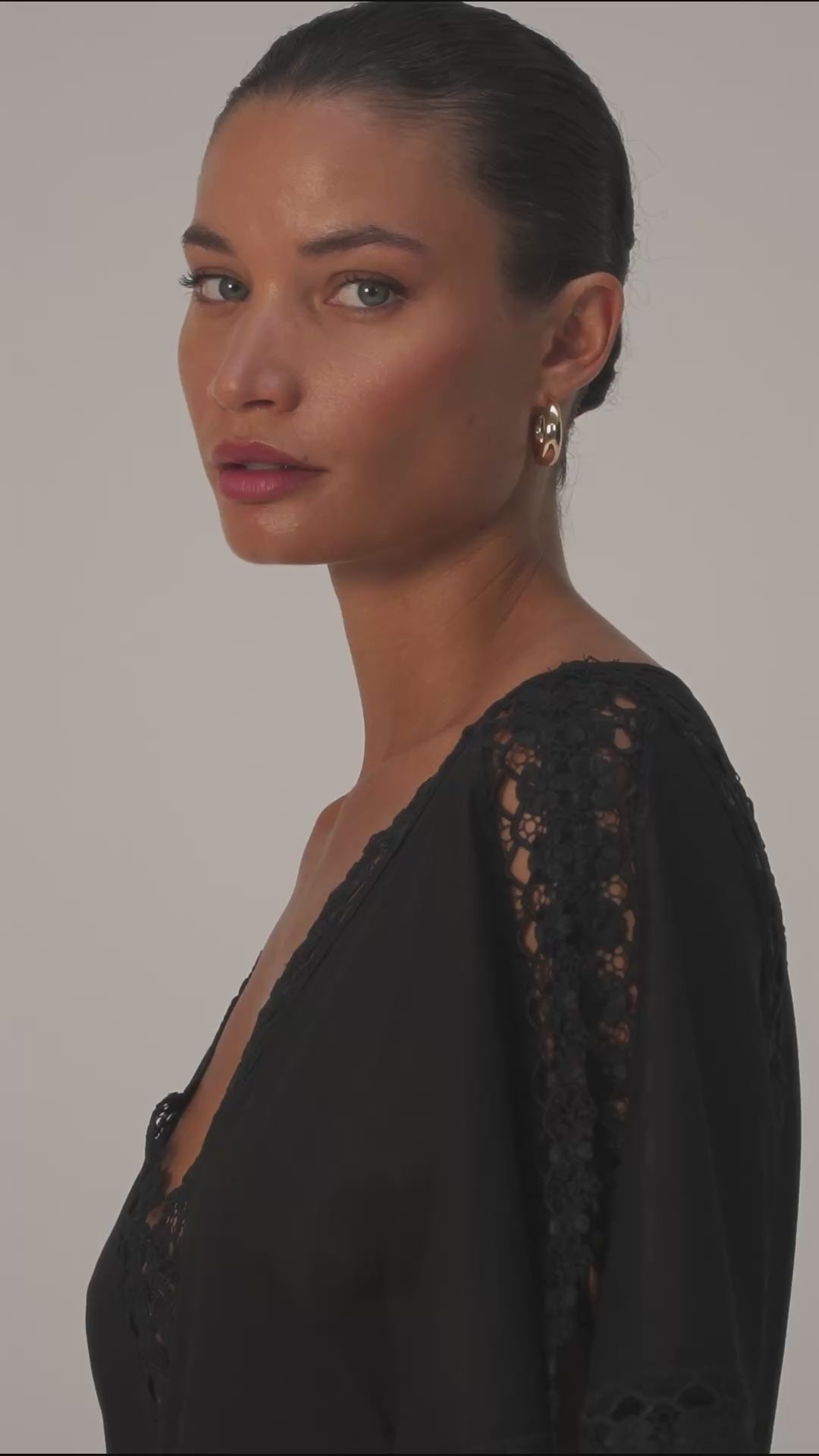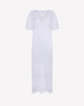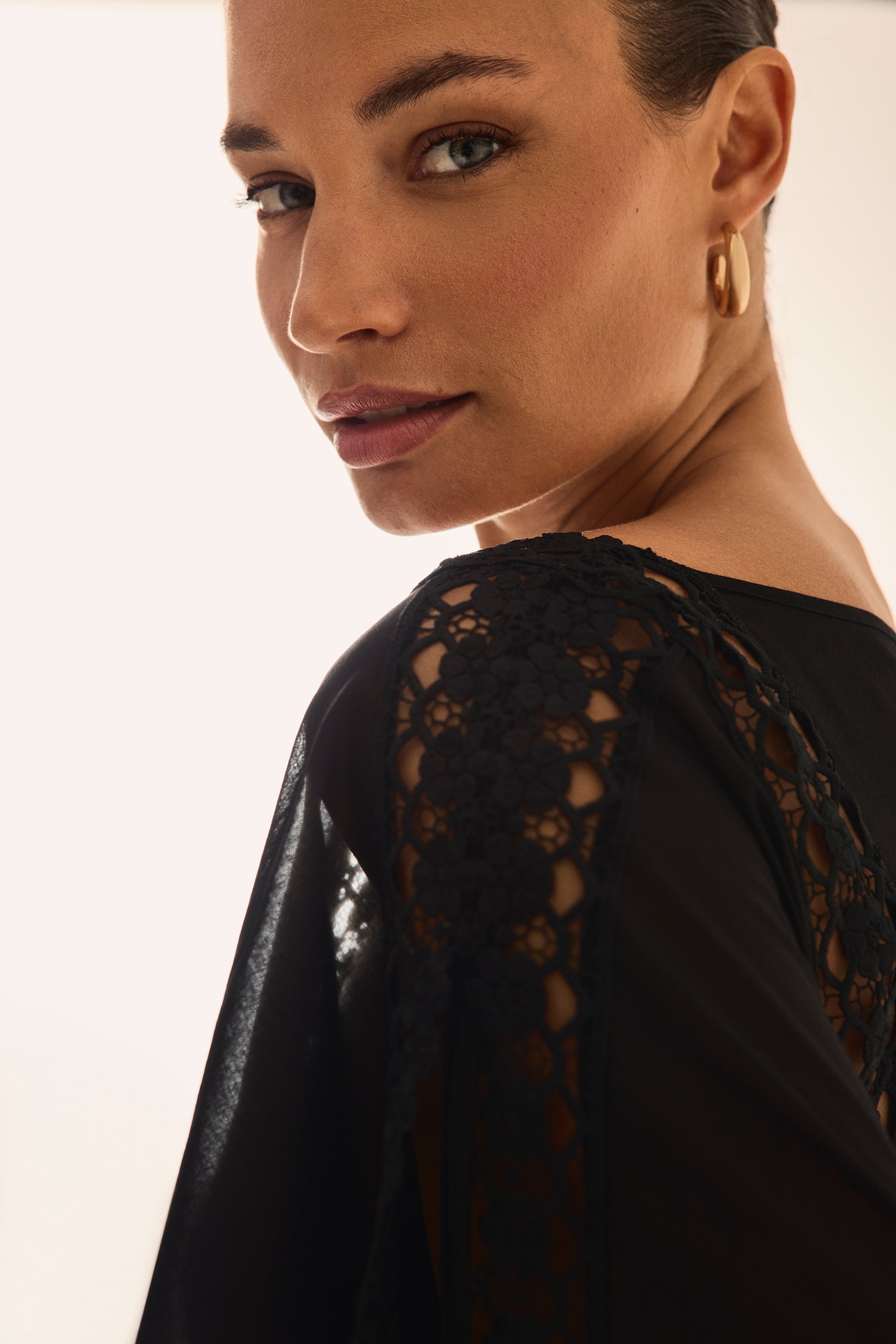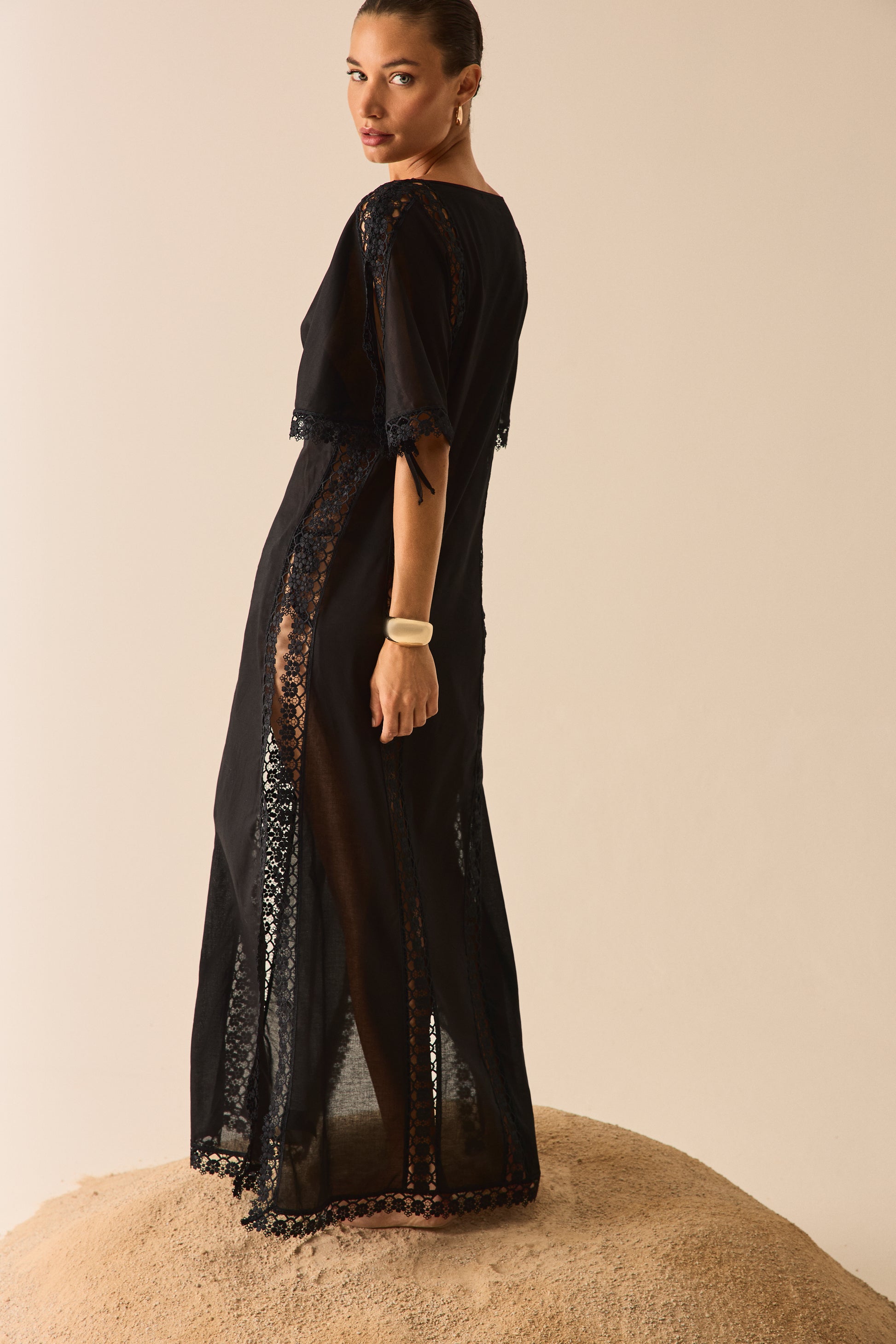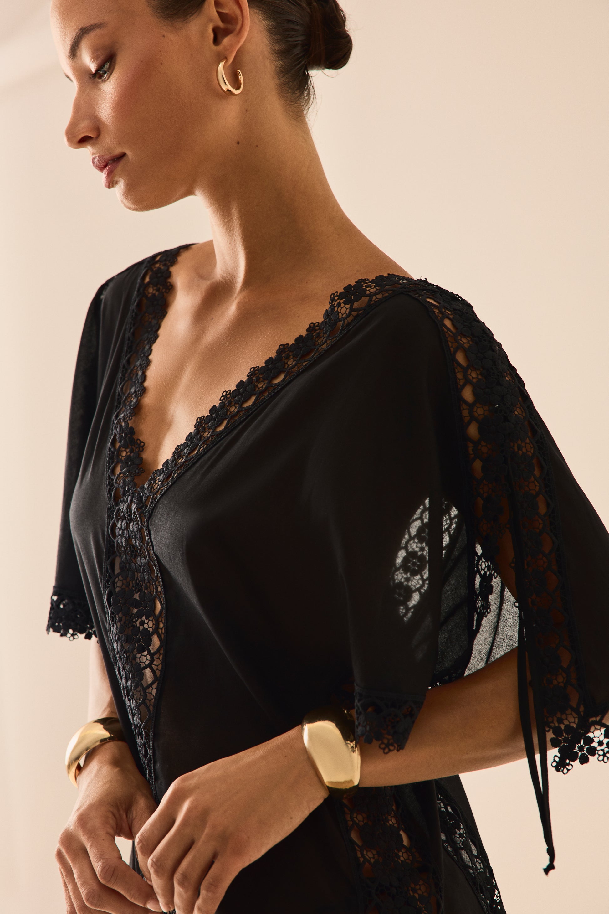 Discover the lightness and relaxed style of the SAENA kaftan, a versatile piece crafted from cotton that blends comfort and elegance. Its flowing design is adorned with delicate lace trims along the V-neckline, sleeves, and hem, adding an artisanal and feminine touch. Short sleeves and a straight cut make it perfect to wear over swimwear or as a breezy summer dress. A sophisticated essential for warm-weather looks with a natural, effortless charm.