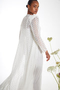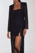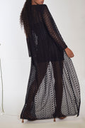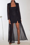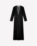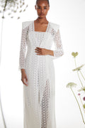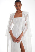 Introducing our stunning NILERE long jacket, crafted in guipure, designed to make a statement of elegance and sophistication. The jacket features a long, flowing cut with shoulder pads, offering a wrap look that complements any silhouette. Its V neckline adds a flattering touch. This versatile piece is perfect for a variety of events, as it can be worn as outerwear, a dress, or a kaftan.