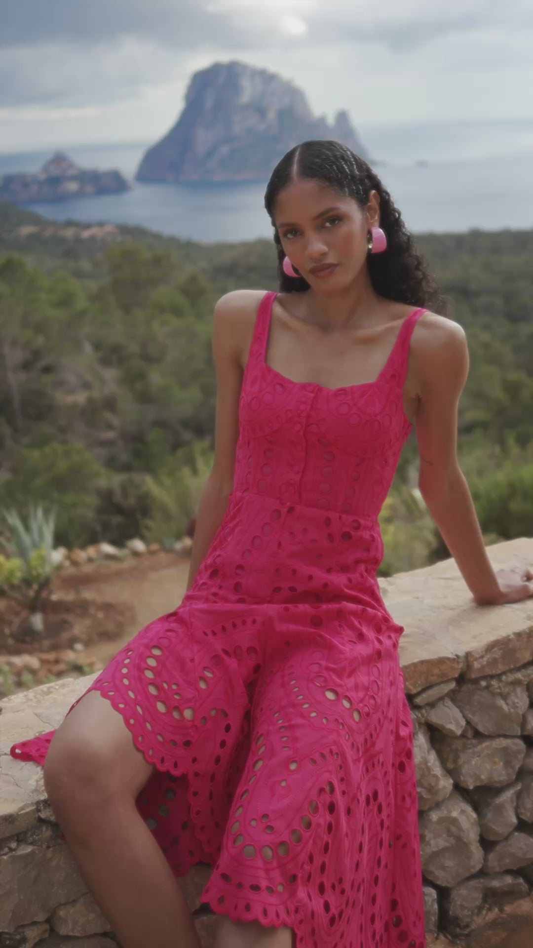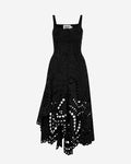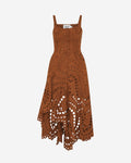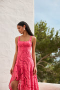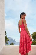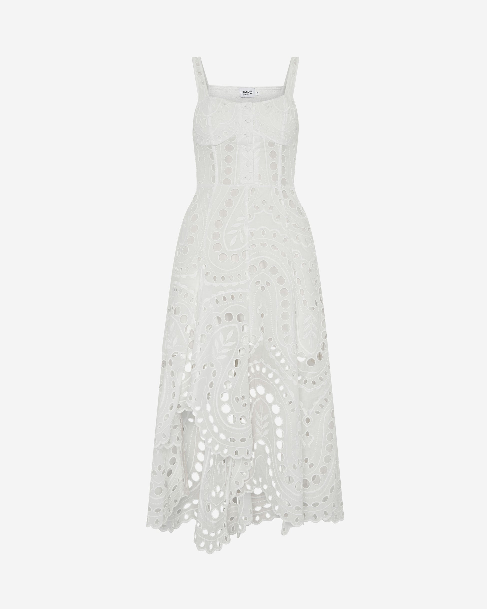 Our AYLA midi dress is a delicate piece that blends the structure of corsetry with the lightness of artisanal embroidery. Its straight neckline and fine straps enhance the upper body, while a row of covered buttons runs down the bodice, adding a subtle, classic touch.