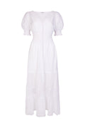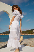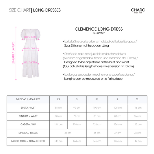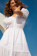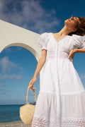 The central clasp closure makes our Clemence dress a versatile piece that can either be worn open or closed. The beautiful puffed sleeves and flattering V-neckline framed with beautiful guipure detailing creates the perfect balance between sweet and sensual. A key piece for summer that reflects the easy-going nature of Ibiza.