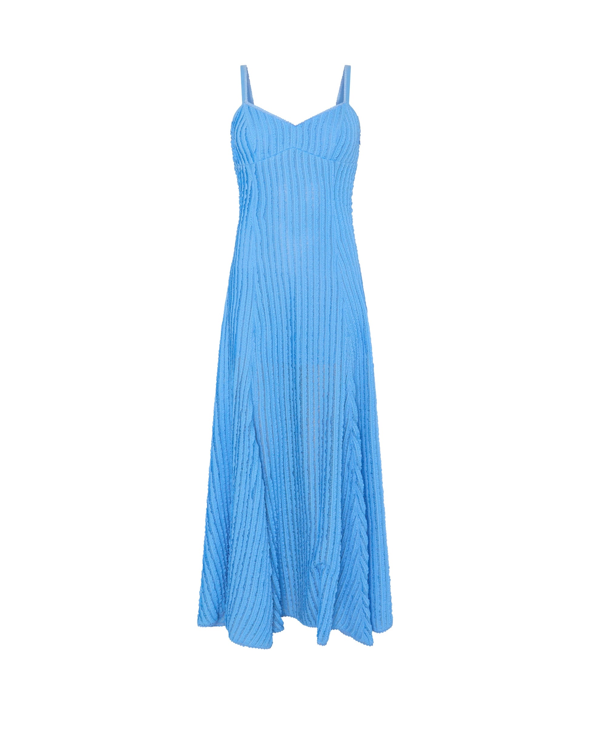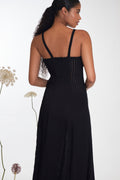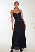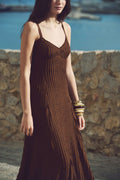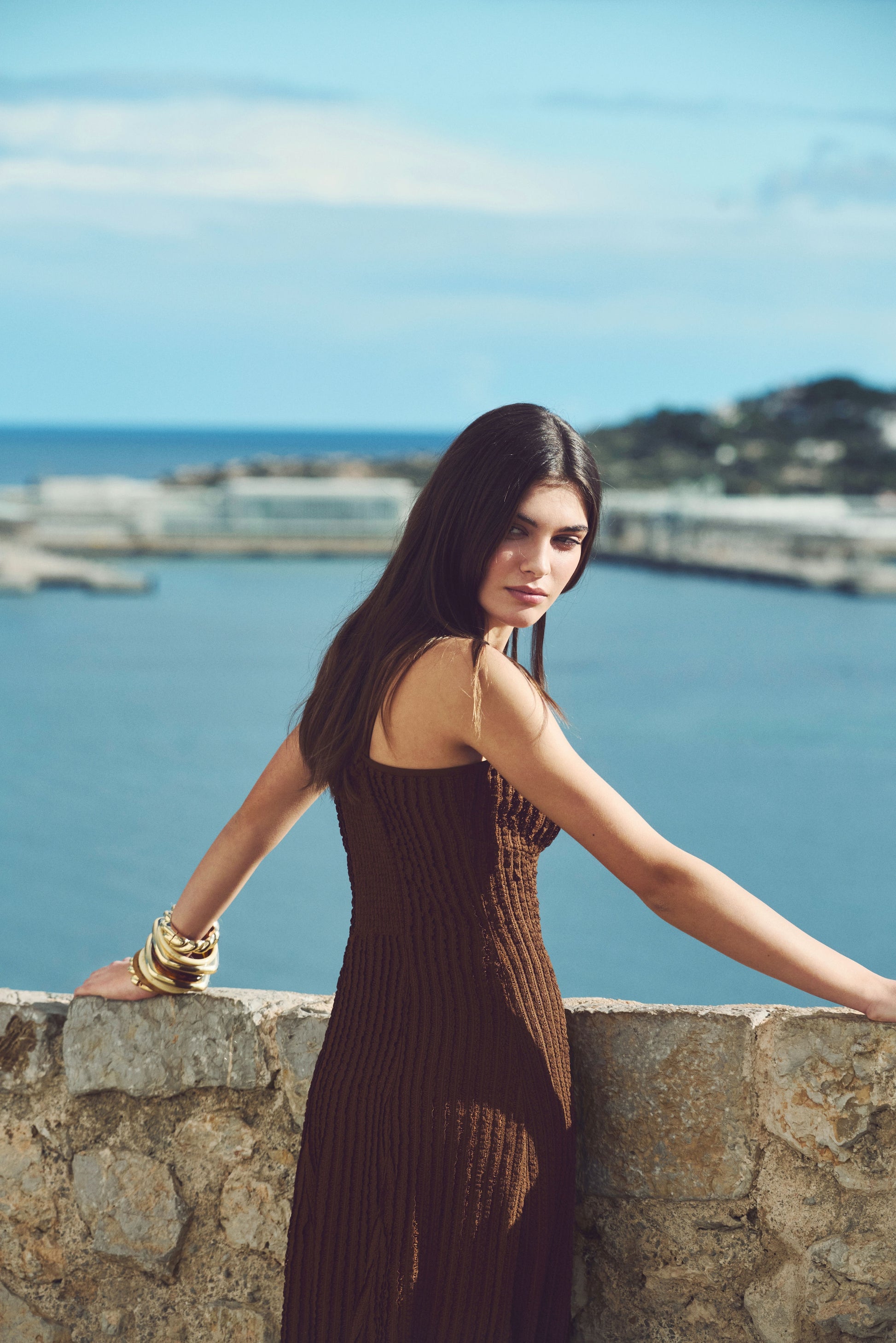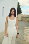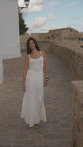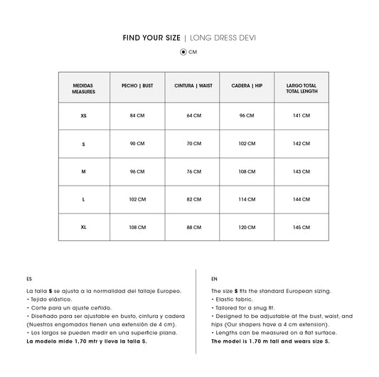 The long DEVI dress will be the centre of attention this season. Its flattering delicate vneckline is supported by straps to create a beautiful bustline. The bottom part consists of a gorgeous long skirt that follows the verticality of the mesh fabric with cotton to create a spectacular movement when walking.