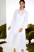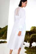 The ELESA long dress will be the star of your most important events. Its cotton voile is embroidered with 3D technique that, together with its central guipures, elevates the piece thanks to its sculptural silhouettes. It comes with a separate undergarment for you to feel more comfortable.