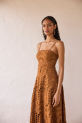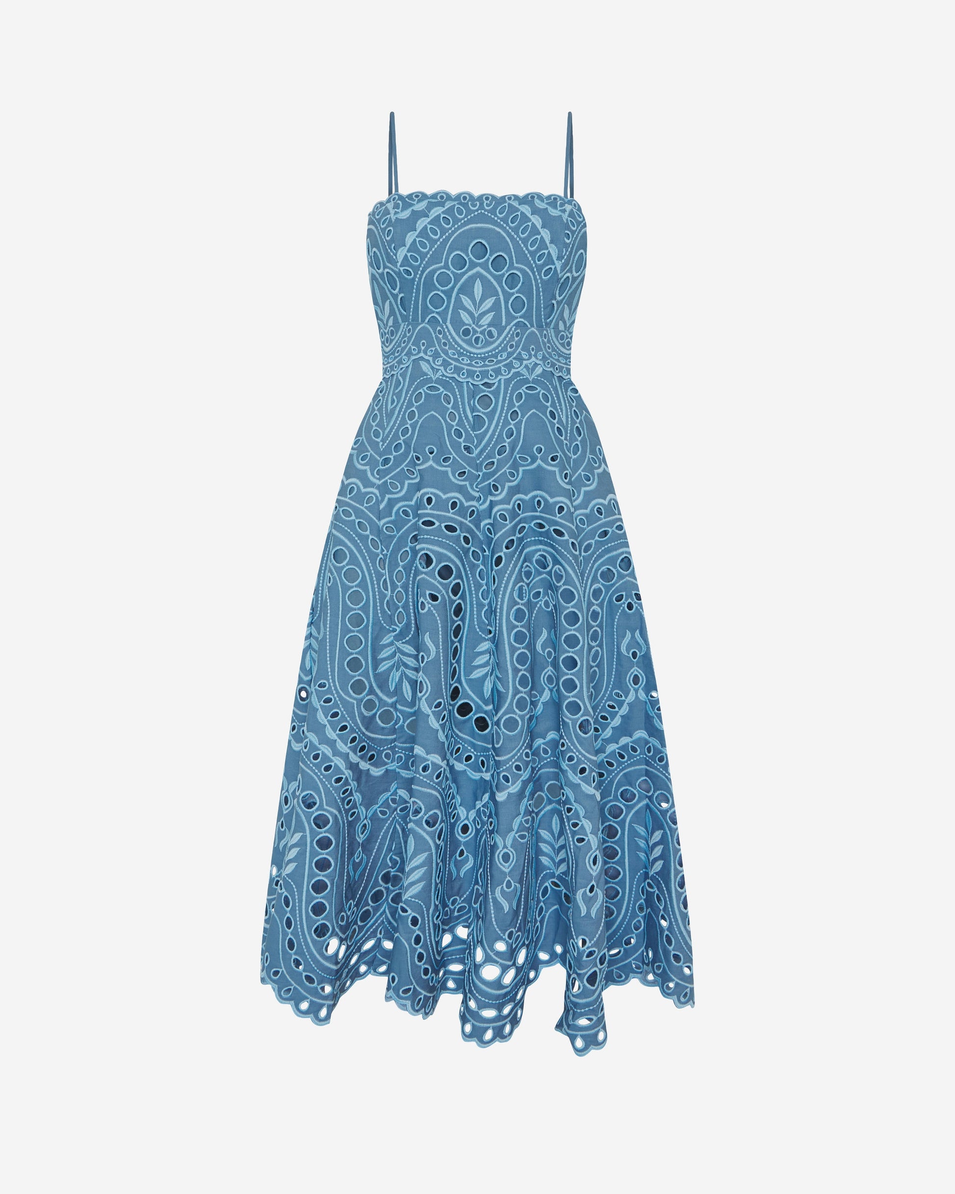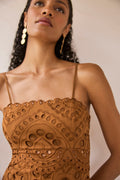 The GLIMMER dress is an ode to subtle femininity. With a straight neckline and delicate thin straps, its clean silhouette gently enhances the bust, allowing the richness of its artisanal embroidery to stand out.
