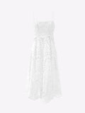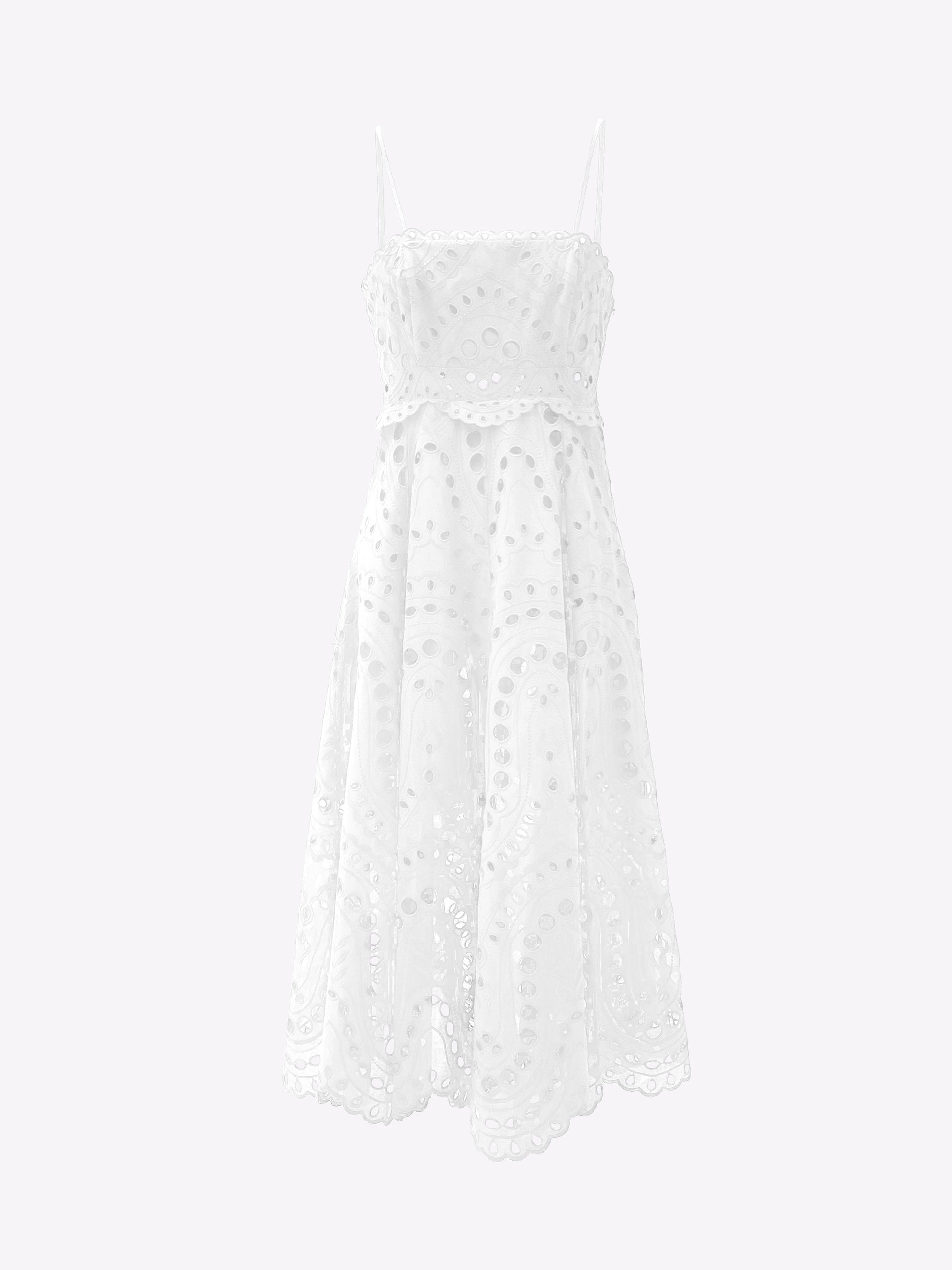 The midi-length skirt flows gracefully with every step, while the scalloped hem offers a refined, distinctive finish. A light, romantic, and timeless piece made to bring elegance to your most special moments.