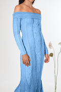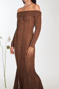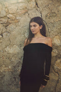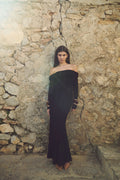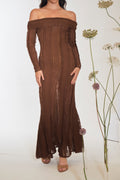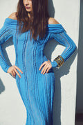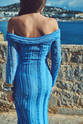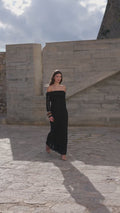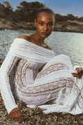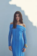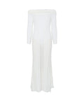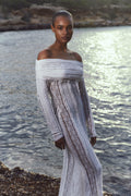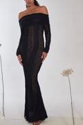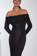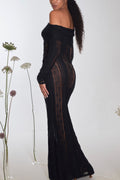 Feel spectacular in our MINERVA long dress made in mesh fabric with cotton. Its exquisite texture and finishes follow your curves, perfectly fitting your silhouette. The multi-position bardot neckline allows for flattering shoulder framing and gives way to elegant long sleeves.