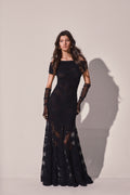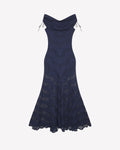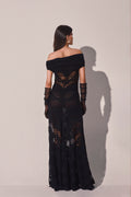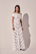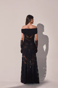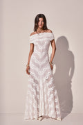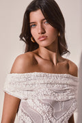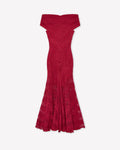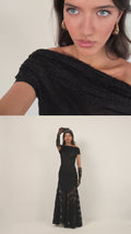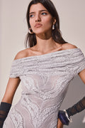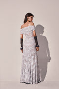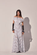 Shine in the OASIS dress, a full-length silhouette that balances structure and flow with elegance. Its draped bardot neckline frames the shoulders with sculptural strength, while the fitted mesh bodice enhances the figure with sophistication. The wide skirt adds movement and presence. A powerful piece made to stand out on special occasions.