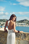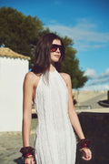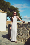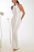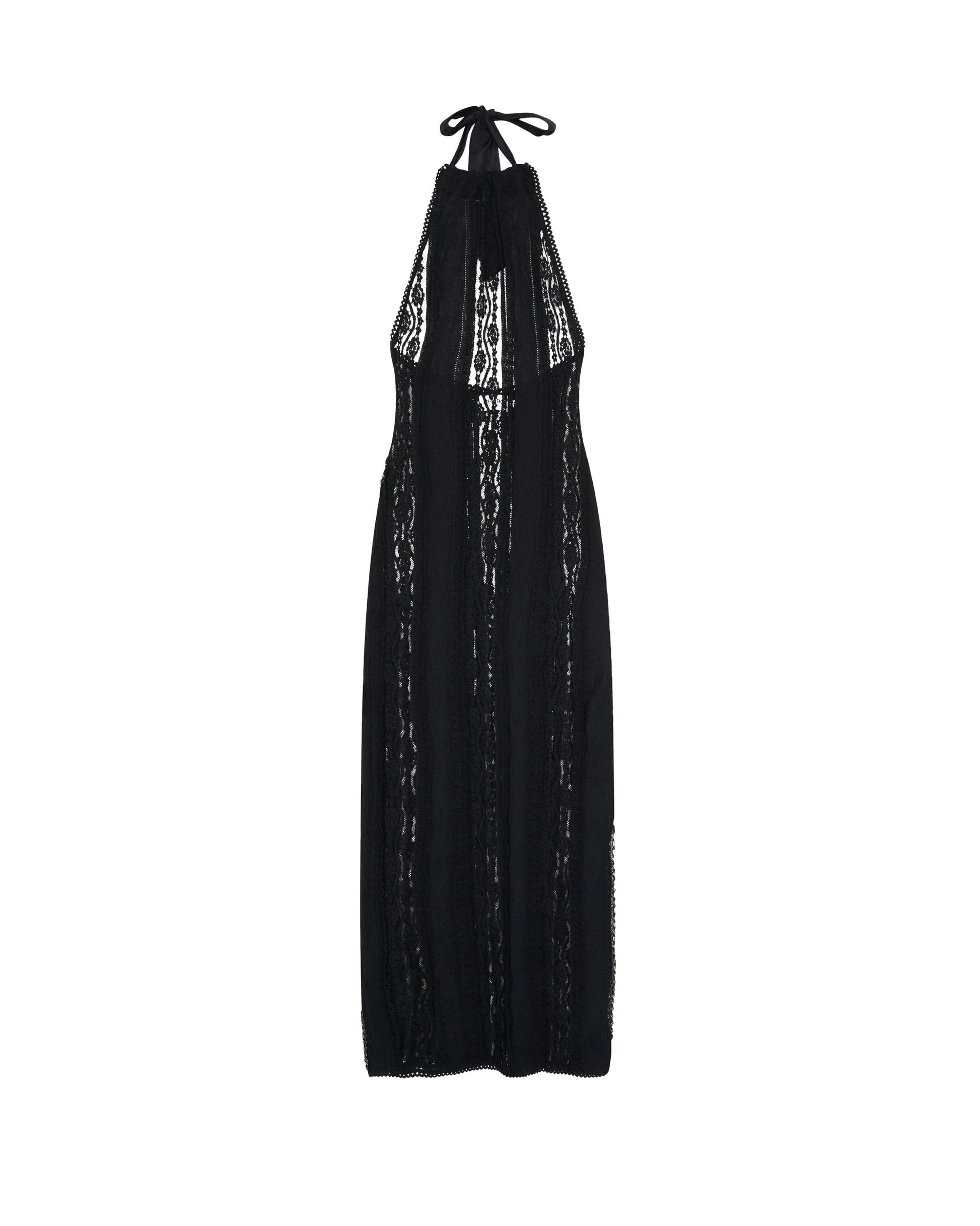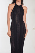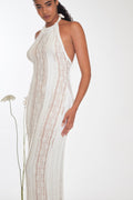 The THEIA long dress is the culmination of a feminine silhouette combined with sleek, nineties-inspired lines. Its halter neckline, which exudes sophistication, begins a fitted bodice that accentuates your silhouette and lengthens it to create a beautiful semitransparent vision of mesh fabric with cotton.
