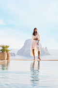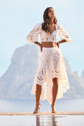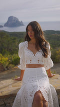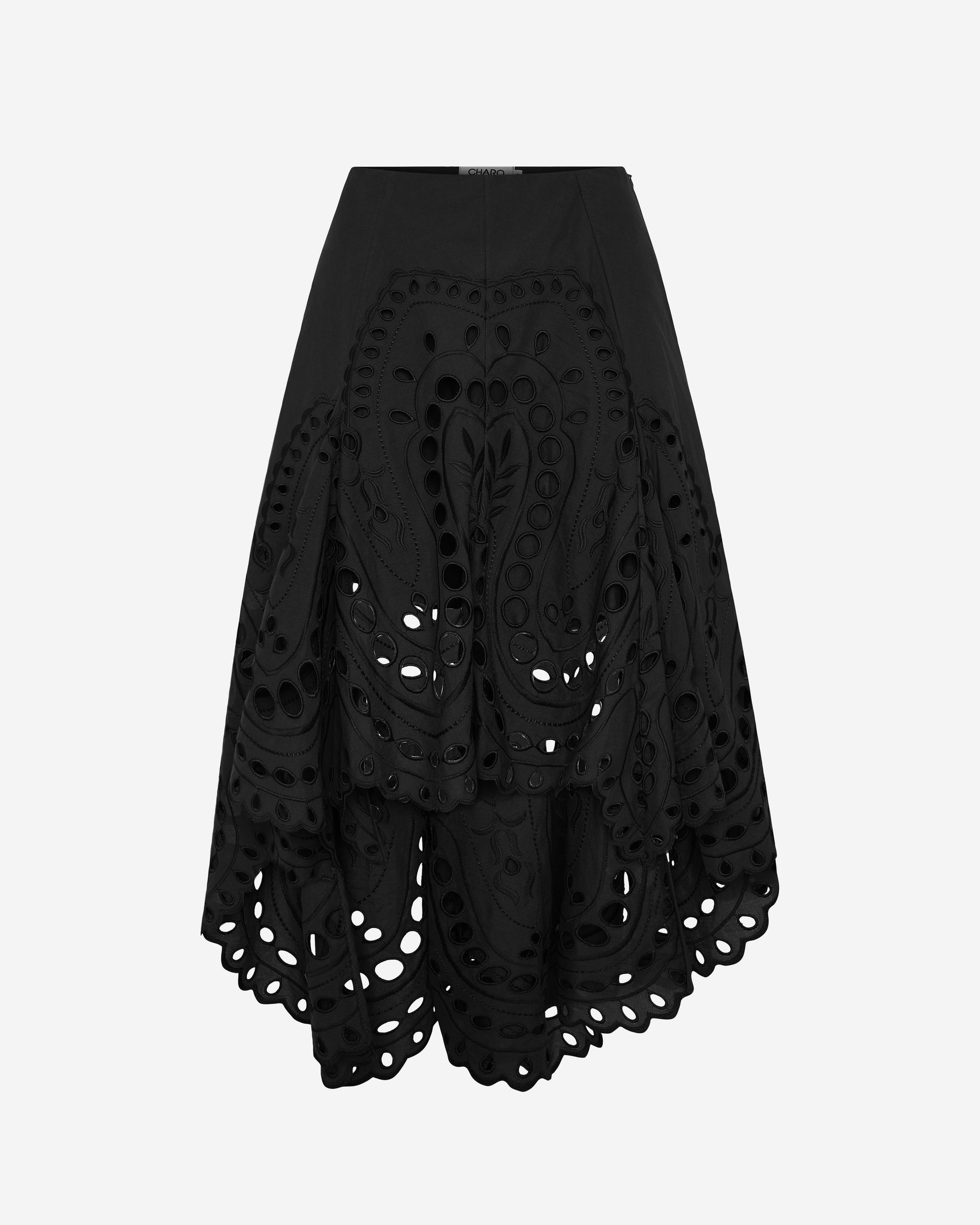 Artisanal embroidery, inspired by organic motifs, flows across the garment, creating an enveloping visual effect, while the scalloped hem — slightly shorter at the front — adds lightness, dynamism, and a distinctly feminine finish. A versatile and refined piece, perfect for special occasions.