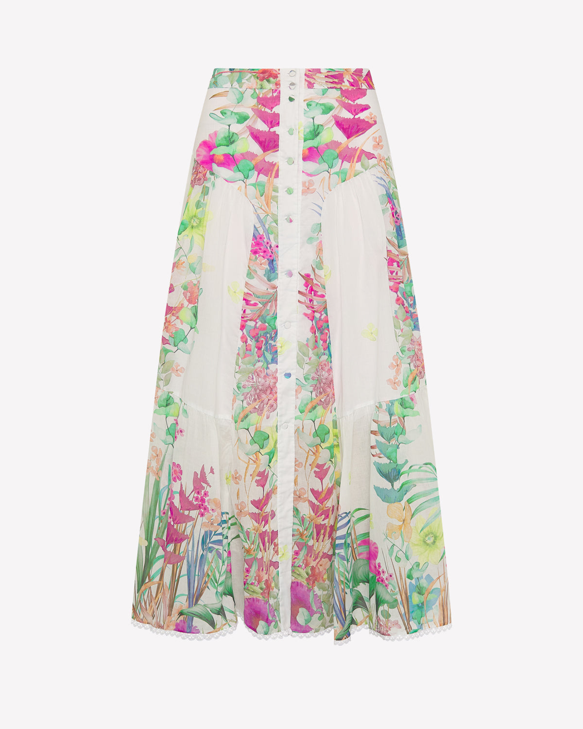 Immerse yourself in the luxury and sophistication of the ROSELLE skirt—a long, airy style in cotton voile. A high waist with shaped yoke gently frames the hips, opening to a button-front slit that elongates the silhouette. Generous panelsfall into fluid movement and finish in a lace-trim hem for an artisanal, feminine touch. Pair with bustier tops, breezy shirts or simple tanks to elevate your summer wardrobe.