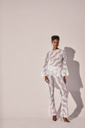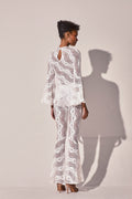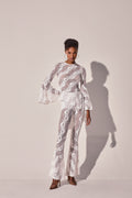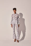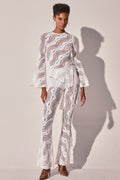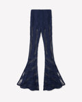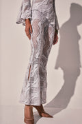 Elevate your silhouette with the HALO trousers — a flared-cut piece that brings movement and character to any look. Crafted in textured mesh with wave patterns, it gently hugs the figure down to the knees, where it flares out into a flowing hem that elongates the shape.