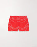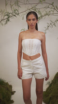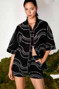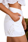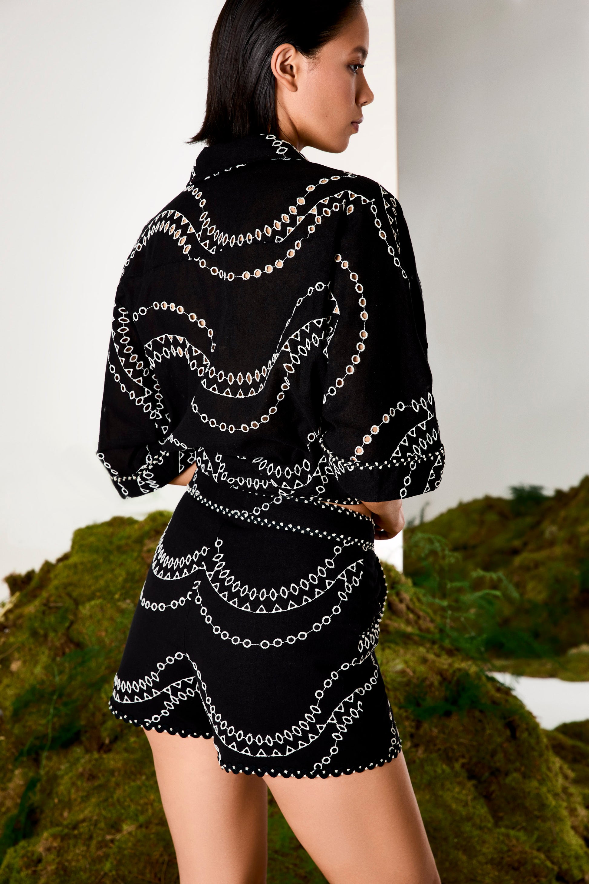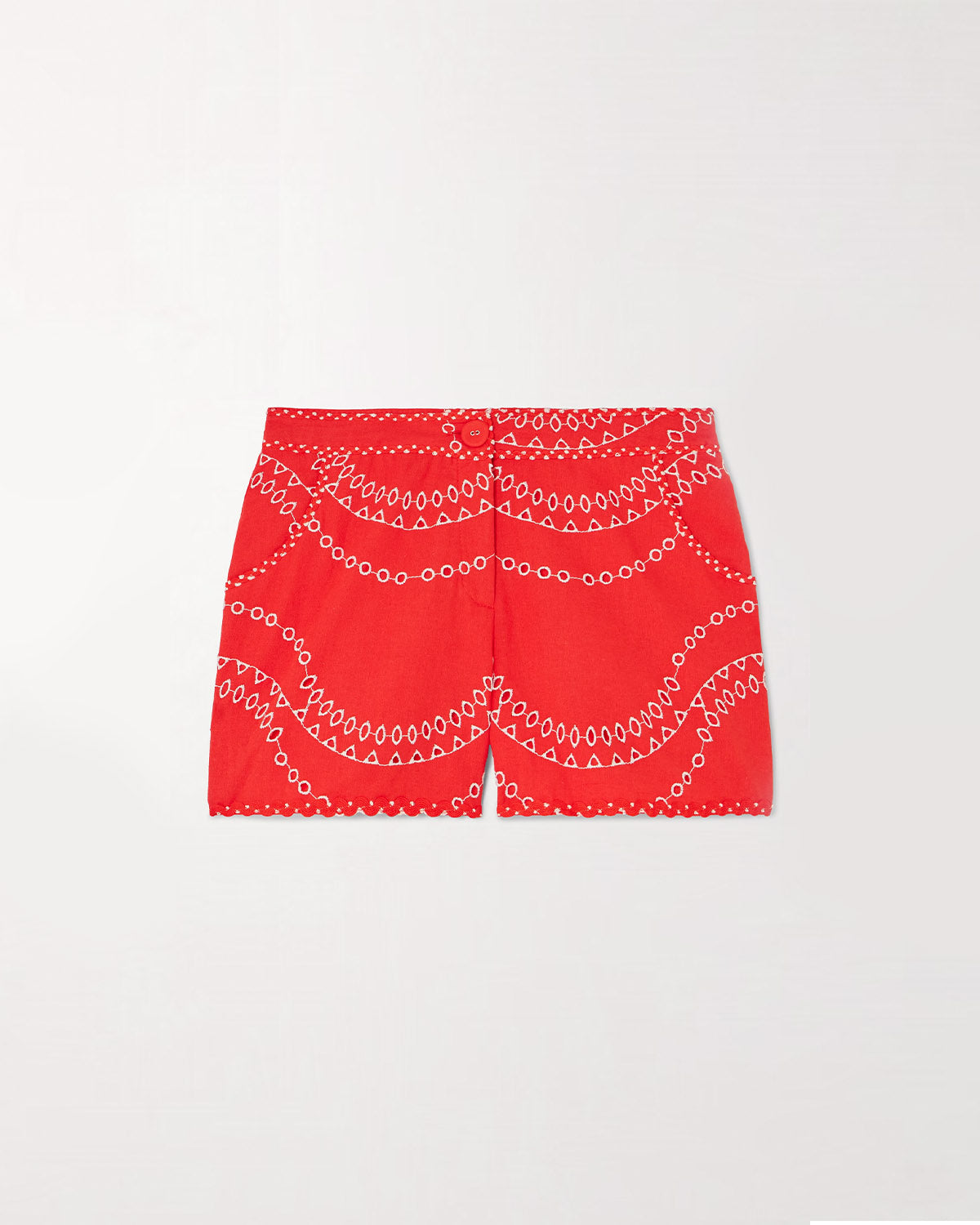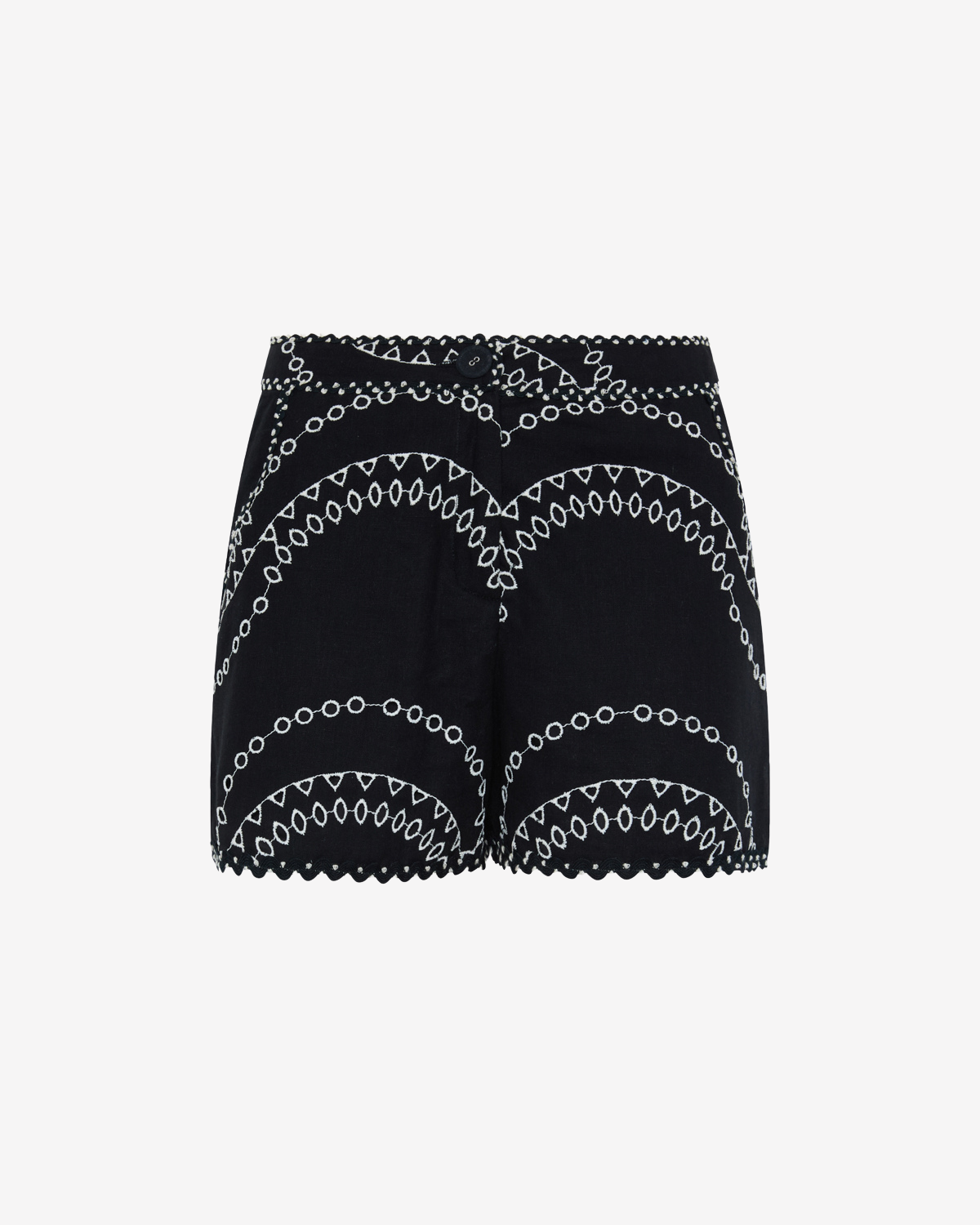 The DREA shorts, in embroidered cotton-linen blend, stylize your silhouette and make your legs look infinite. Its linen and cotton fabric is embroidered with waving motifs that bring sinuosity and evoke the movements of the tides.