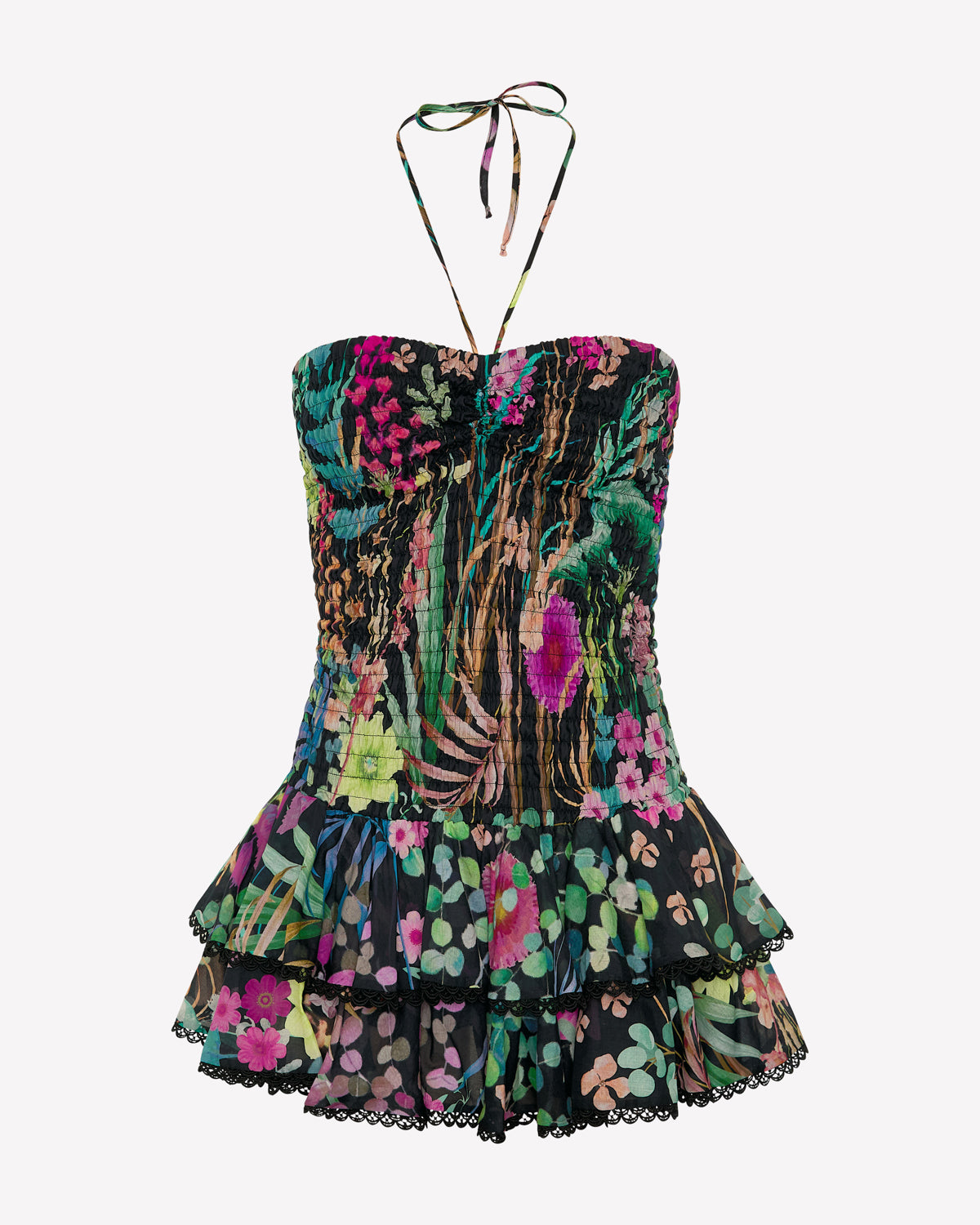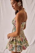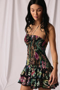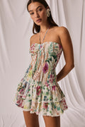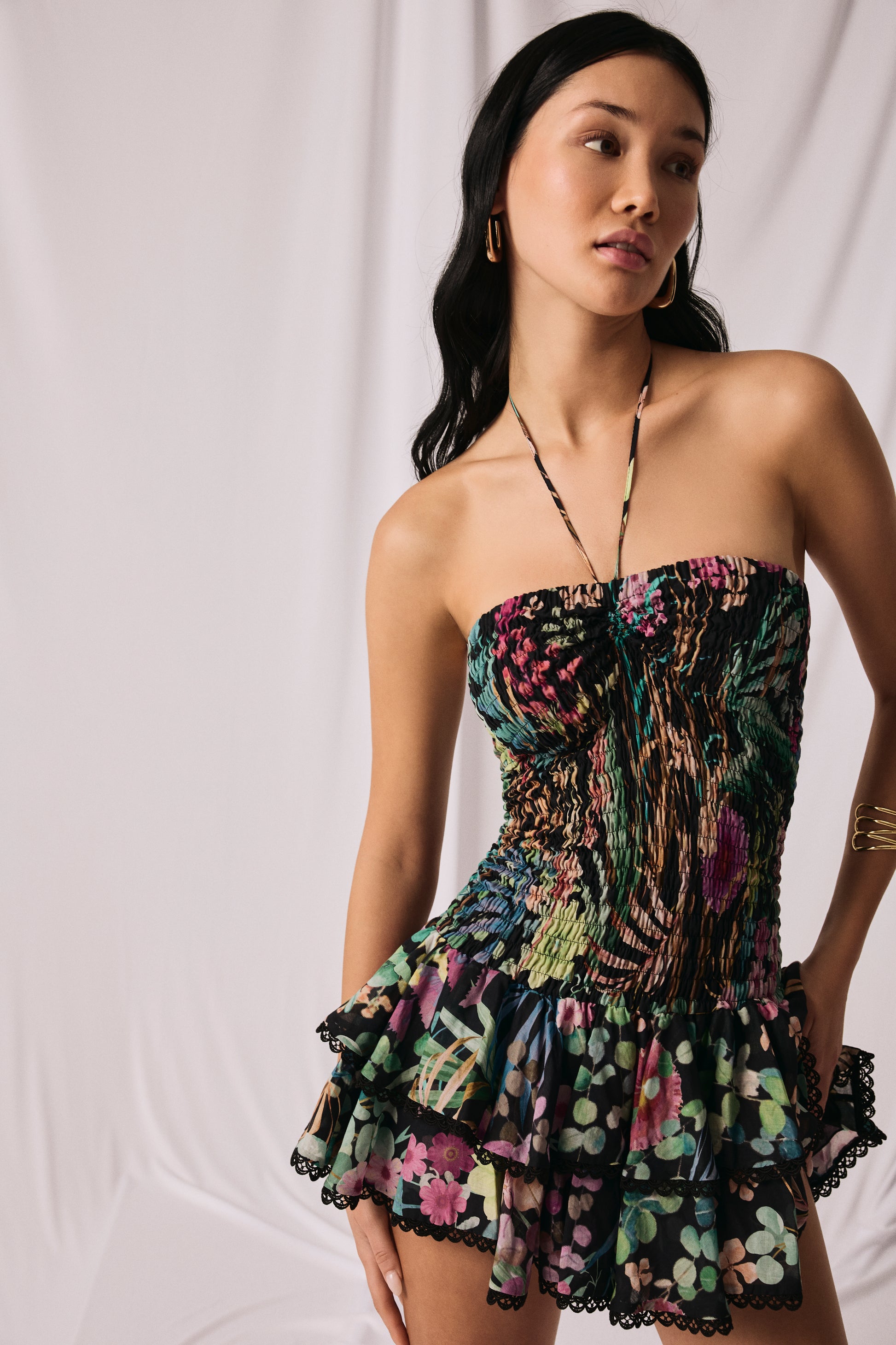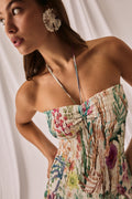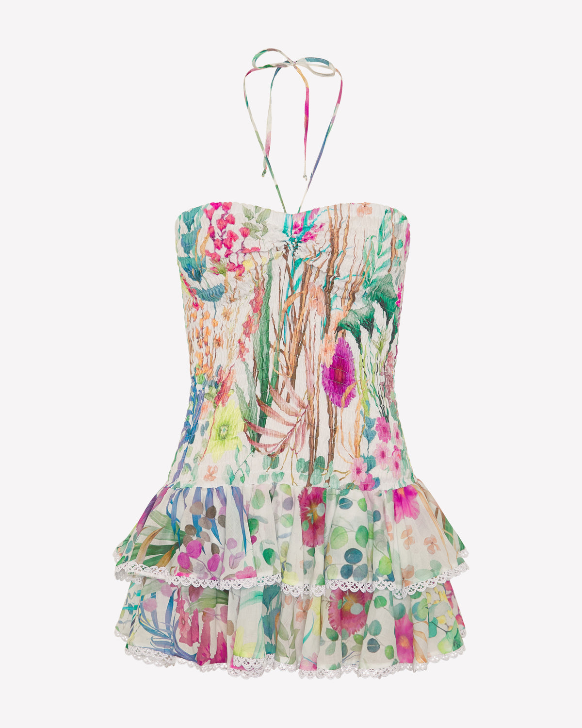 Feel beautiful in the AERIS dress—a light, movement-ready mini. Crafted in printed cotton voile, it features a smocked (elasticated) bodice that gently molds to the figure. A straight neckline is finished with slender spaghetti straps that tie at the neck for a feminine touch.