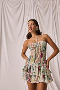 The look ends in a double ruffle skirt edged with embroidered lace, adding bounce and a soft, feminine finish. Fresh, flattering, and perfect for long summer days and warm nights.