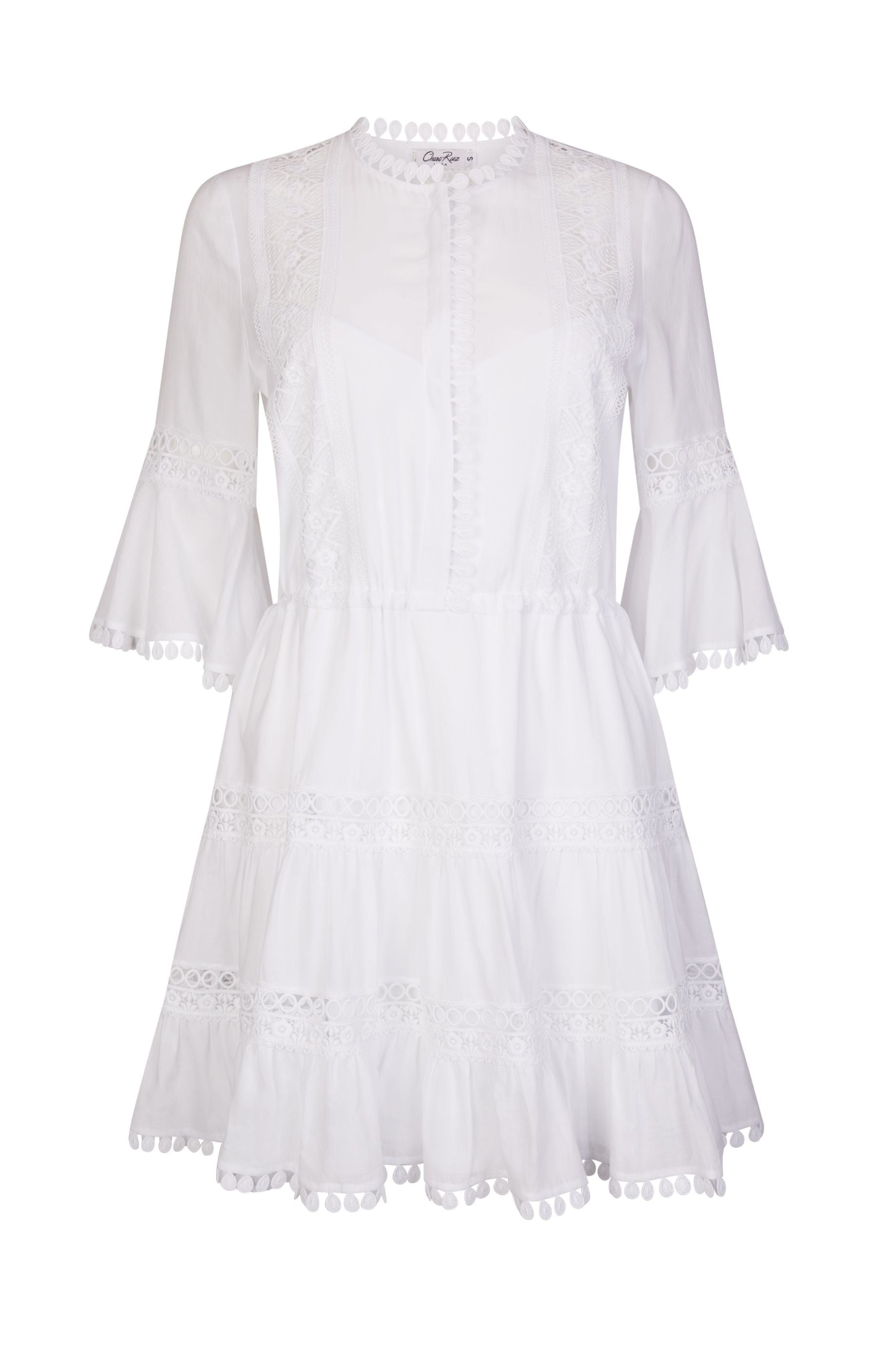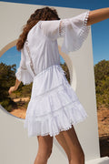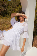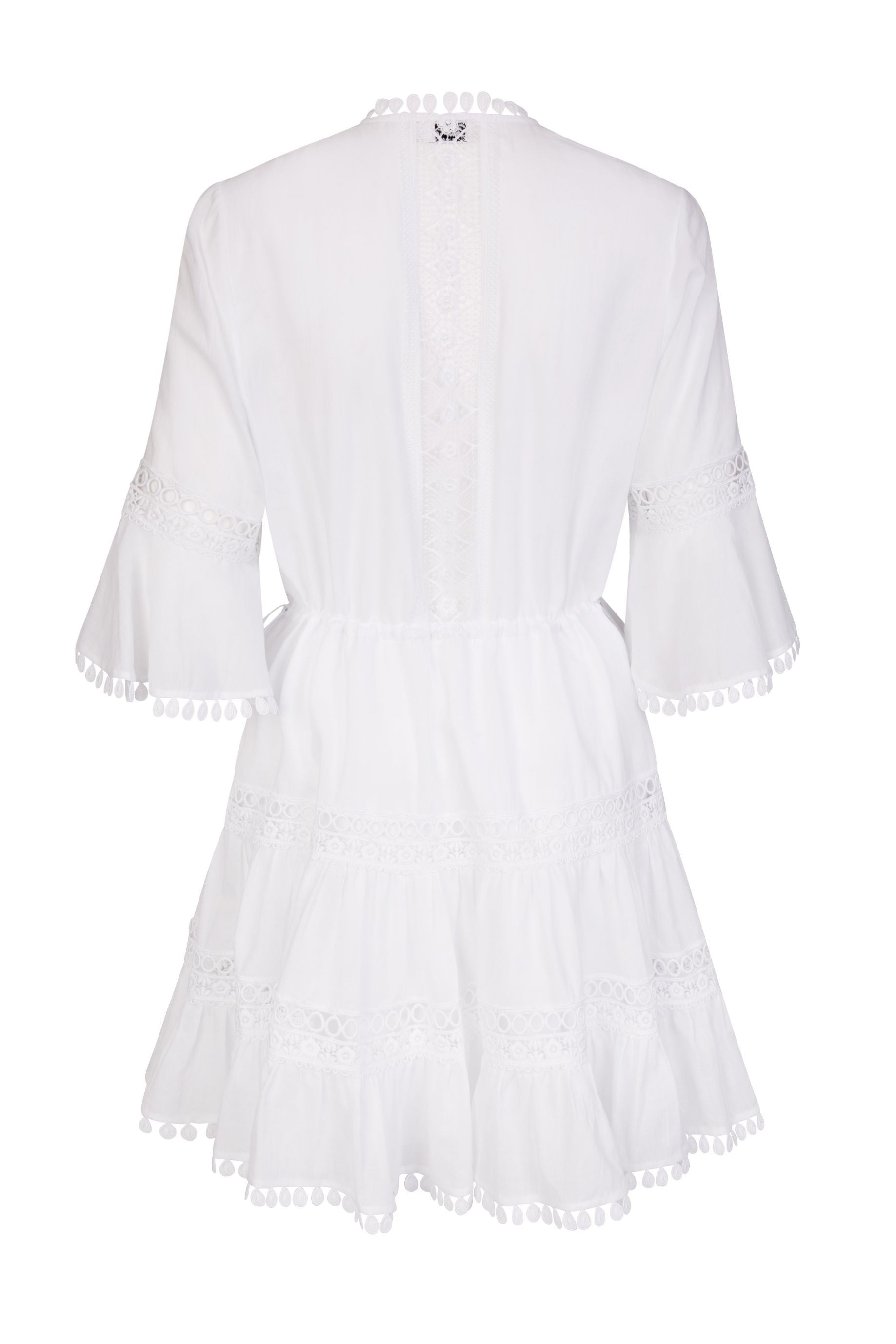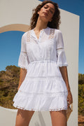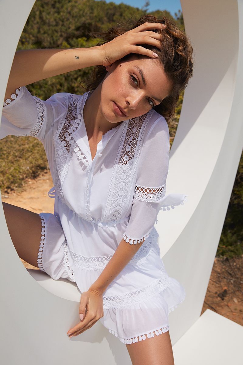 Agatha is the short shirt dress that will become a rapid staple in your summer wardrobe. Its flared sleeves and adjustable waist create a lightweight and versatile silhouette. The triple ruffle skirt made of our 100% cotton voile and adorned with beautiful guipures sways beautifully in the summer breeze.