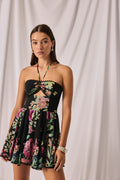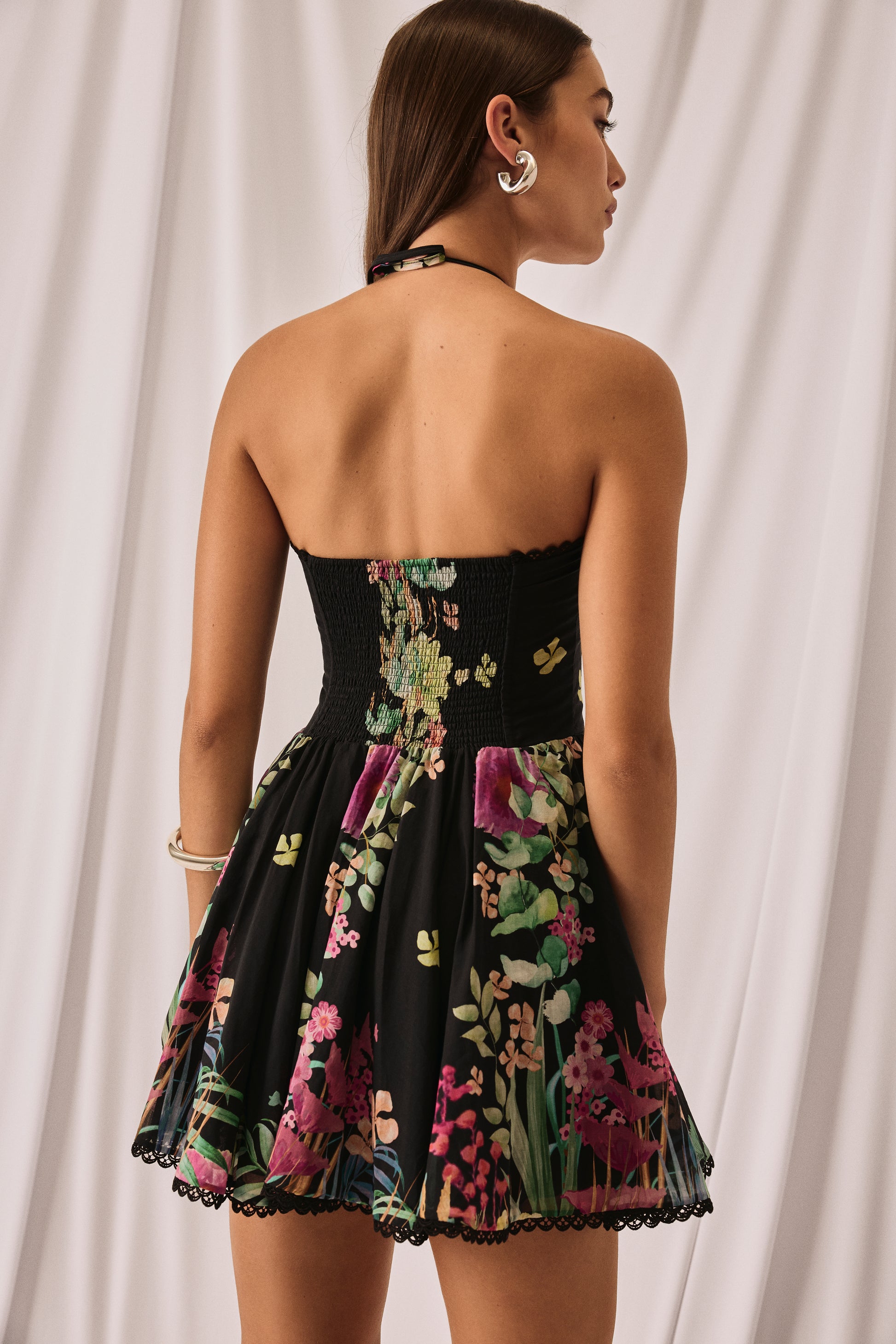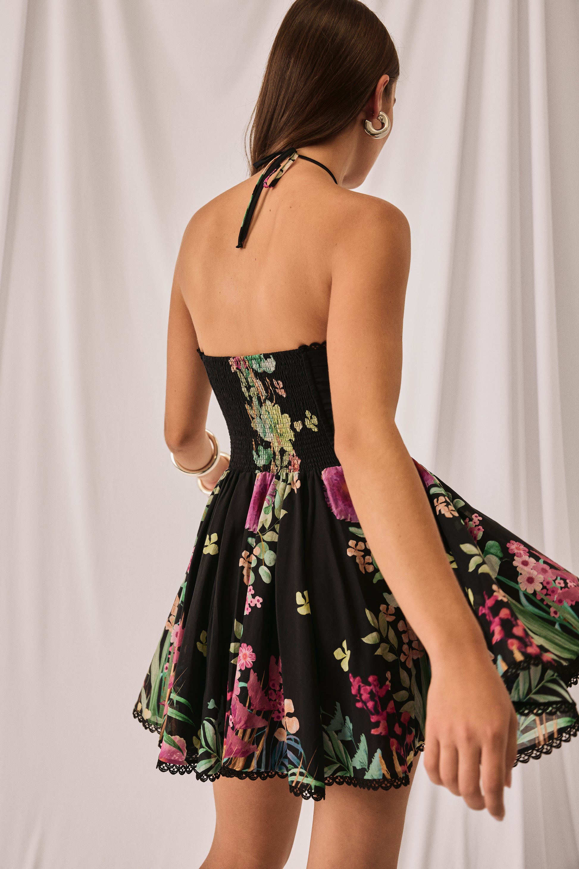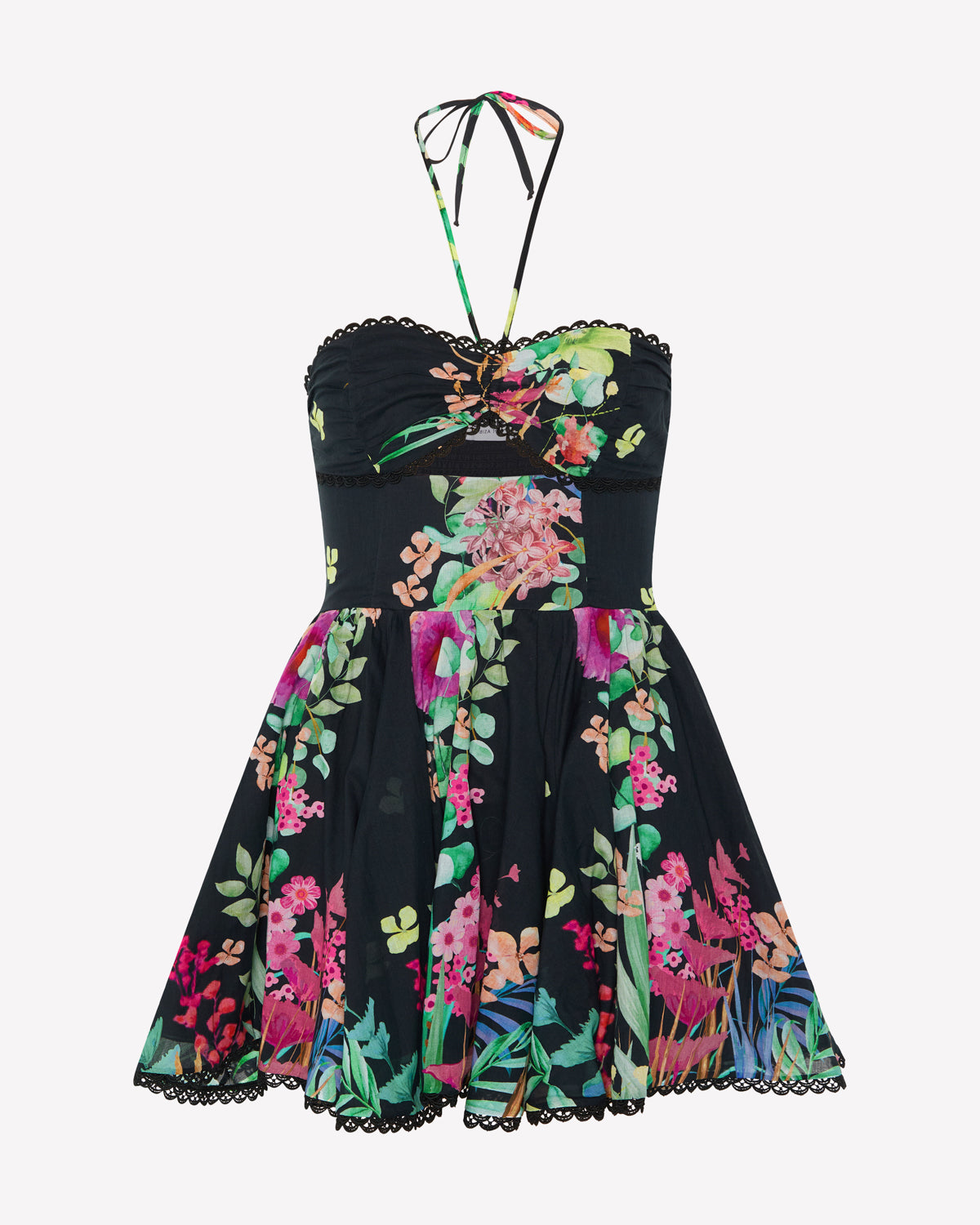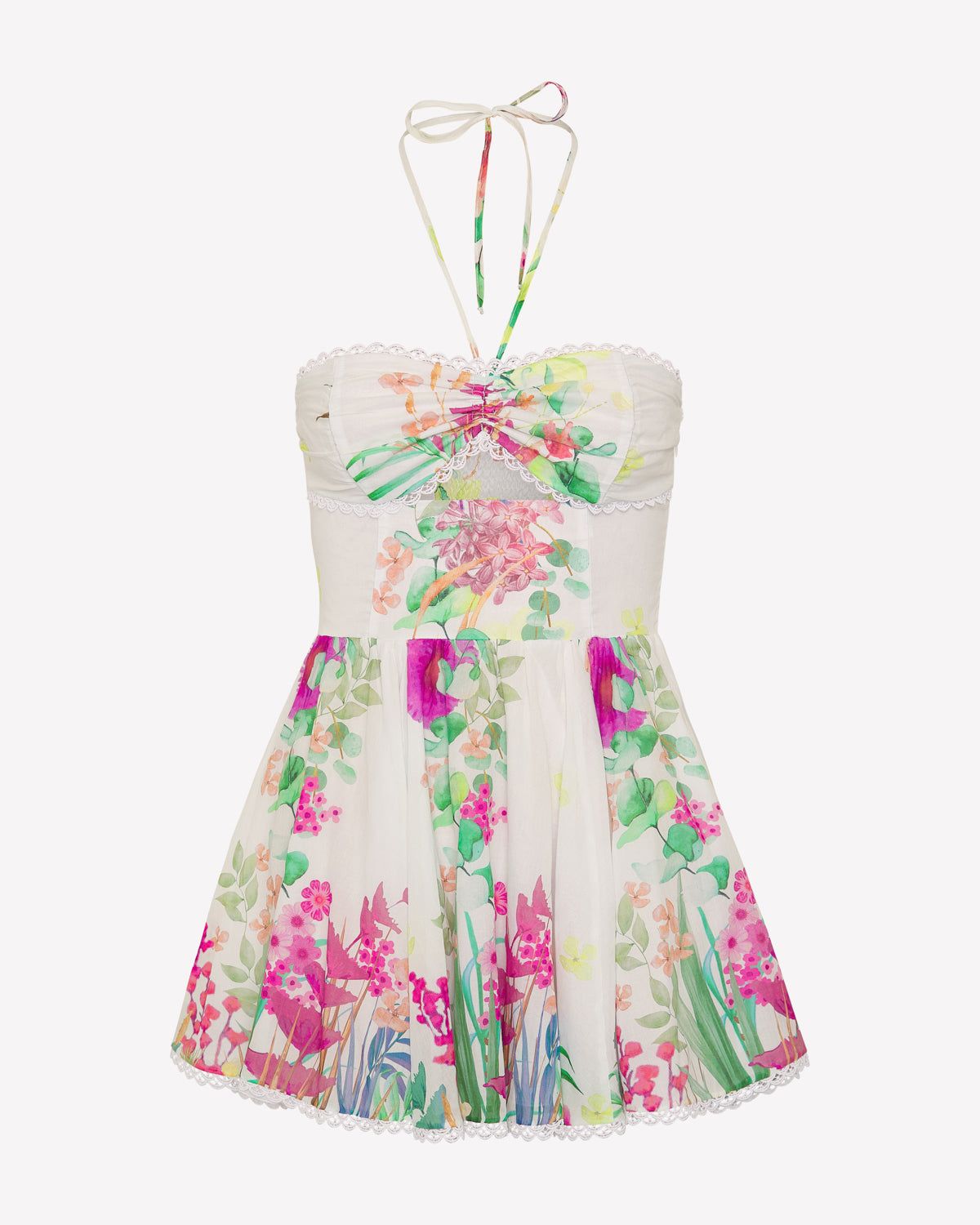 Shine in the ALHELI dress, a fresh, feminine mini made for summer. Cut in cotton voile, it features a softly ruched bust and a bandeau neckline with slender ties that fasten at the neck for a delicate finish. A small front cutout beneath the bust lightens the look and defines the waist before falling to a light, flared skirt that moves beautifully.