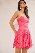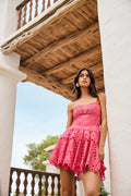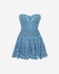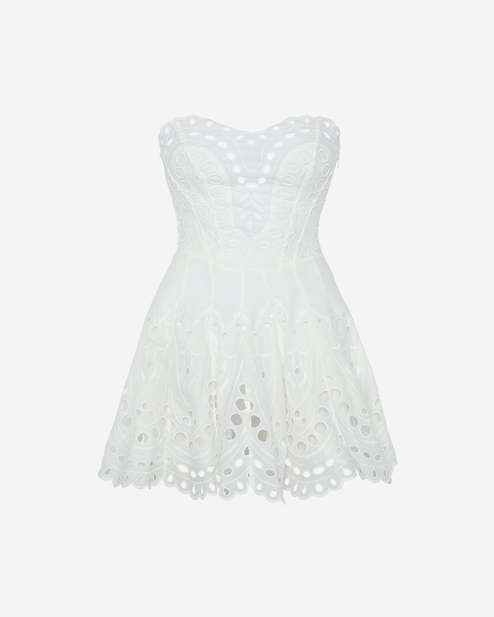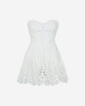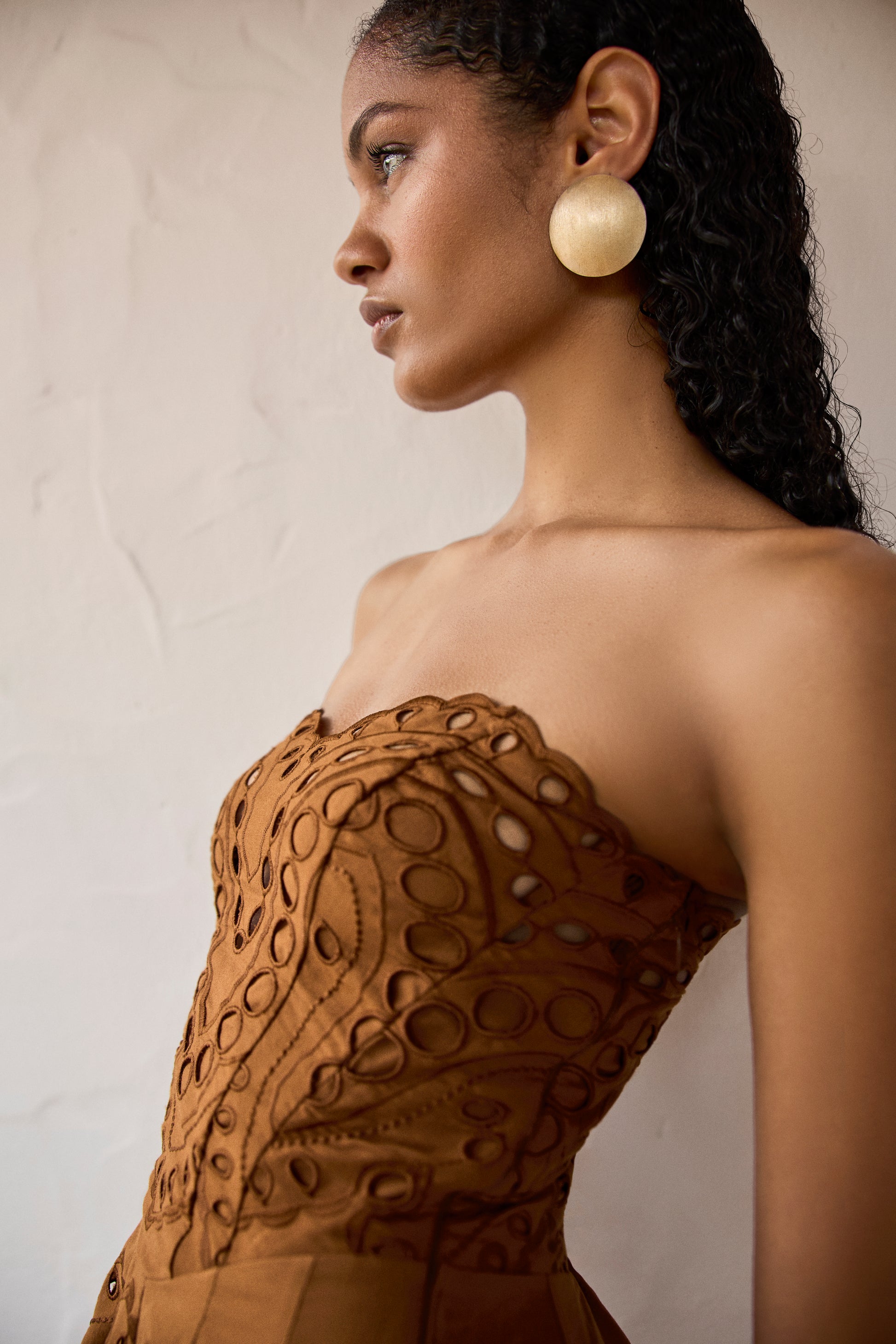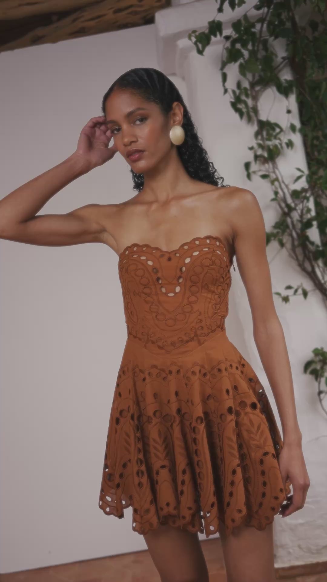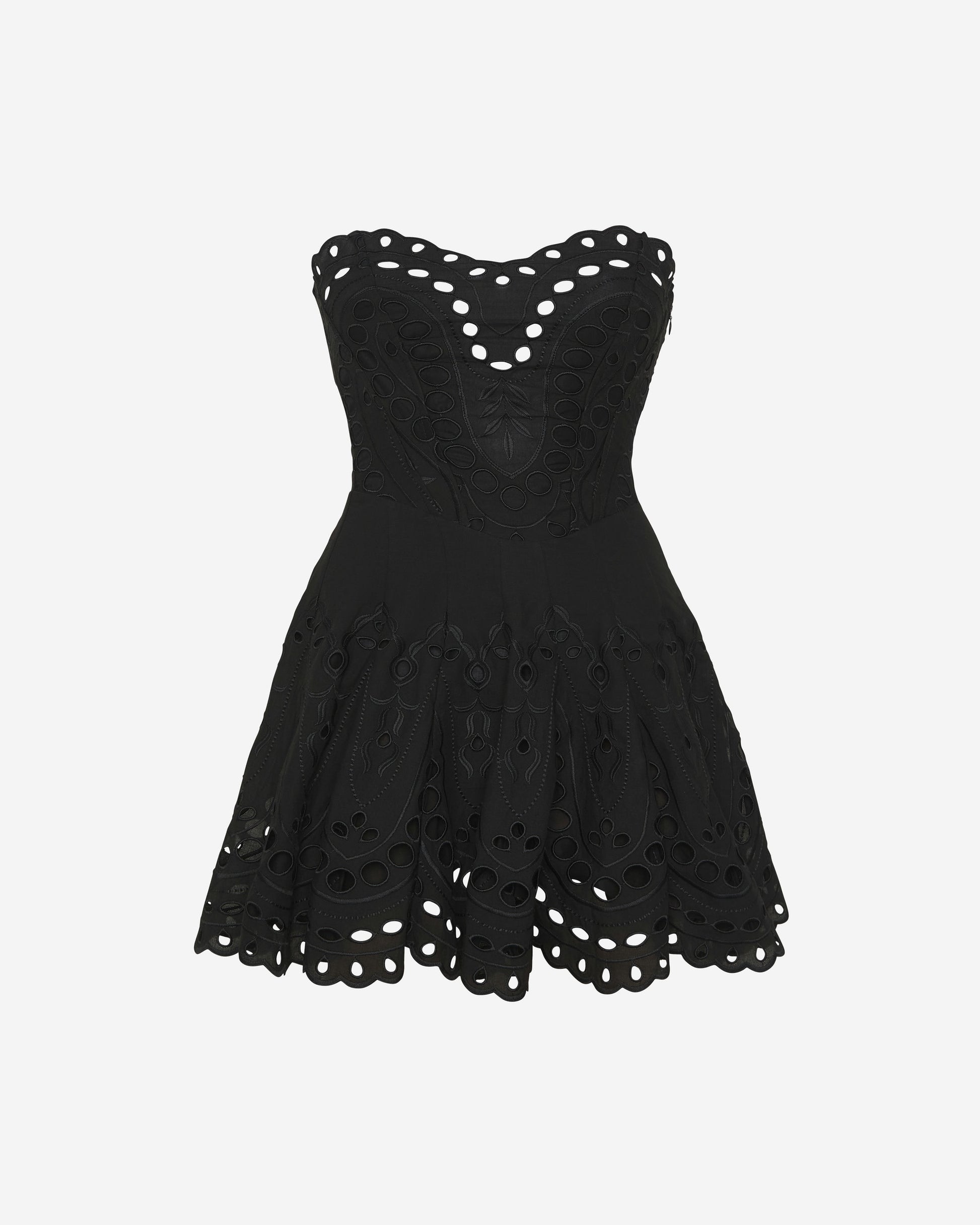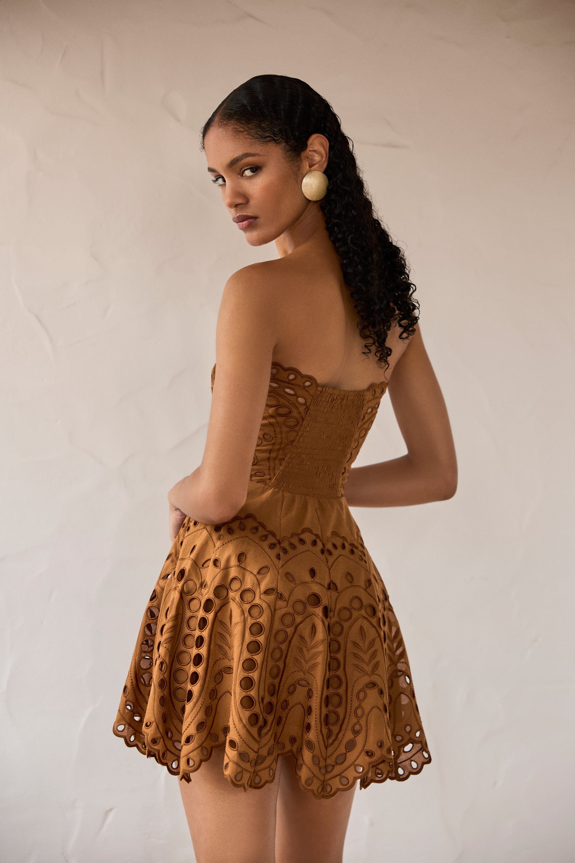 Crafted with structured panels, the full embroidered skirt flares into a dynamic A-line shape that brings volume and flow. A flattering, sensual silhouette ideal for moments when you want to stand out with grace and strength.