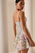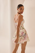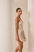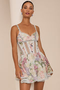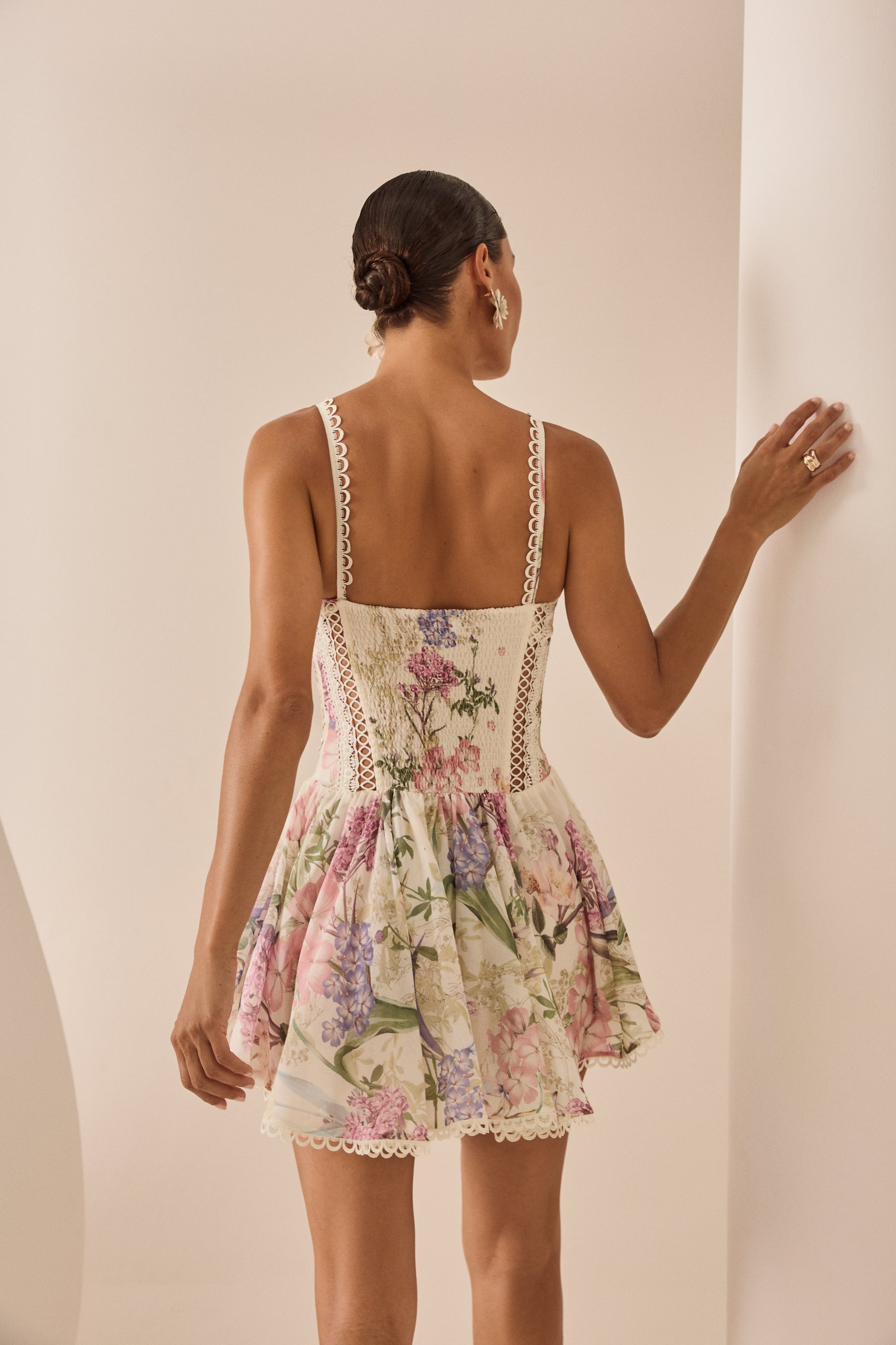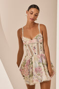 Discover the sweetness and freshness of the GARDENIA dress, a piece that perfectly blends romance and lightness. Crafted from floral-printed fabric, it features a bustier neckline enhanced with delicate embroidered lace and fine straps for a feminine touch. The fitted bodice flows into a short skirt with a soft drape, finished with a scalloped hem adorned with lace, adding movement and a youthful air. Ideal for creating summer looks full of charm and natural sophistication.