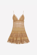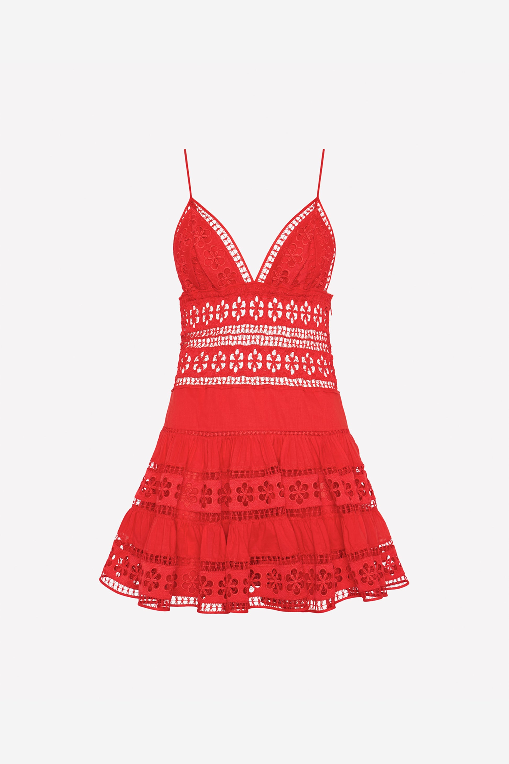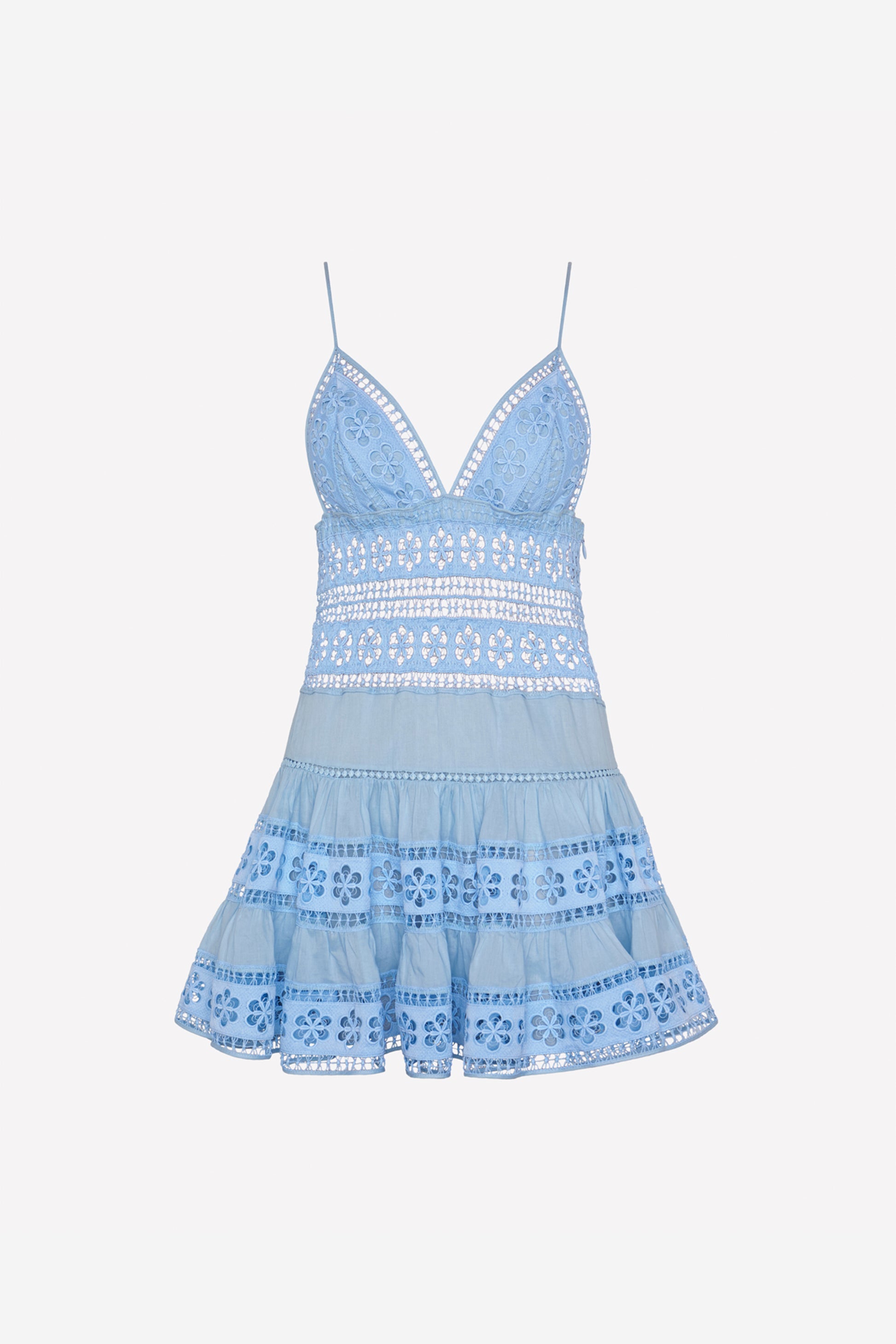 Embrace the summer lightness with the ISCA dress, a mini silhouette that blends romanticism and ease in perfect harmony. Crafted from cotton voile and floral embroidered lace, it features a deep V-neckline with triangular cups that delicately enhance the bust.