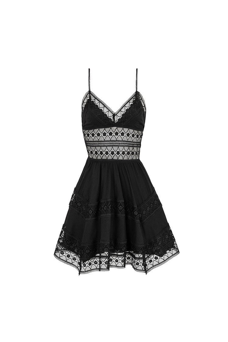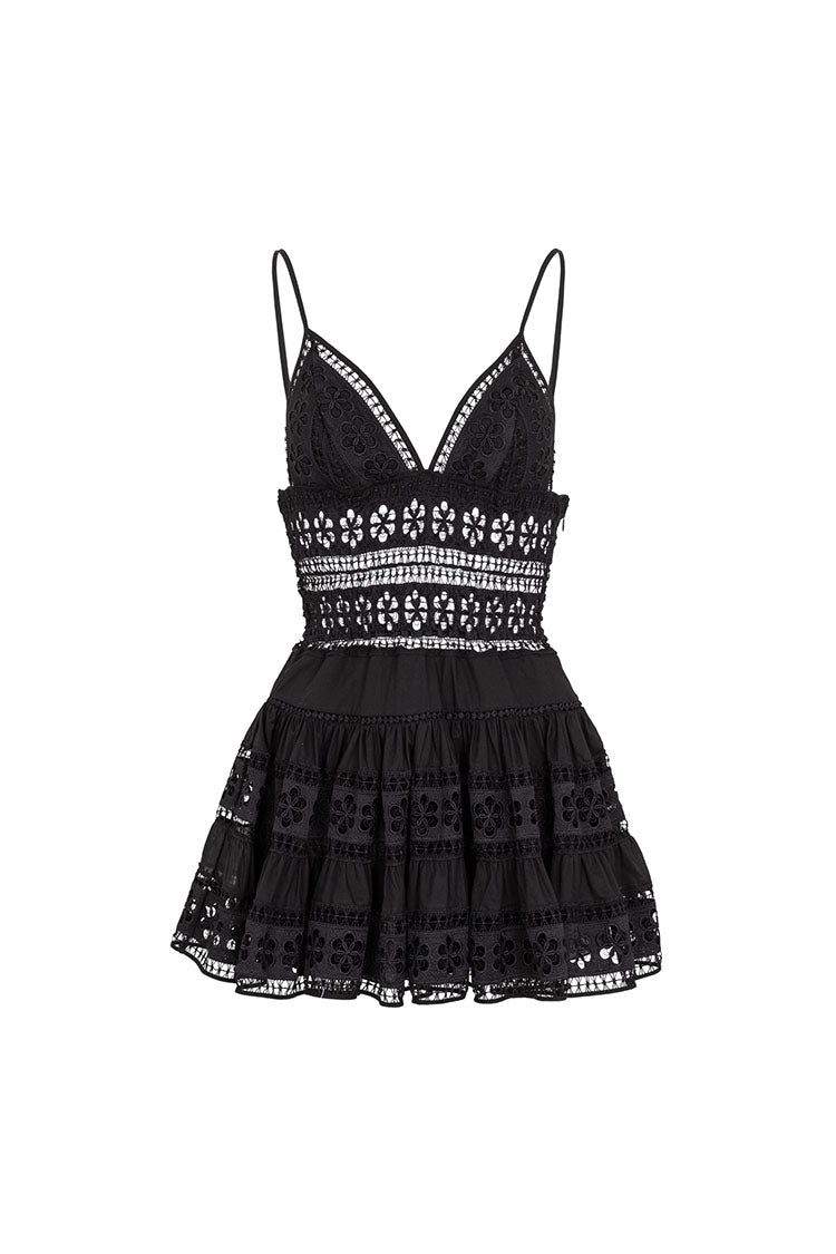 Isca is our mini princess dress. The bodice partially lined to highlight the intricacy of the guipure nips in at the waist and falls to a breezy cotton-blend poplin skirt. The pretty V-neckline is adorned with pretty guipure straps and scalloped detailing accentuating the flare of the skirt.