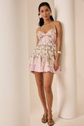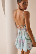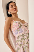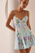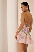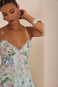 Discover the feminine charm of the MARLENE dress, a piece that blends freshness and elegance in a halter-neck design with a tie closure. Crafted from floral-printed fabric, its sweetheart neckline enhances the silhouette while the fitted bodice subtly flatters the figure. The flared skirt with godets adds movement and dynamism, finished with delicate embroidered lace that highlights its artisanal touch. Perfect for a summer look with a romantic and sophisticated feel.