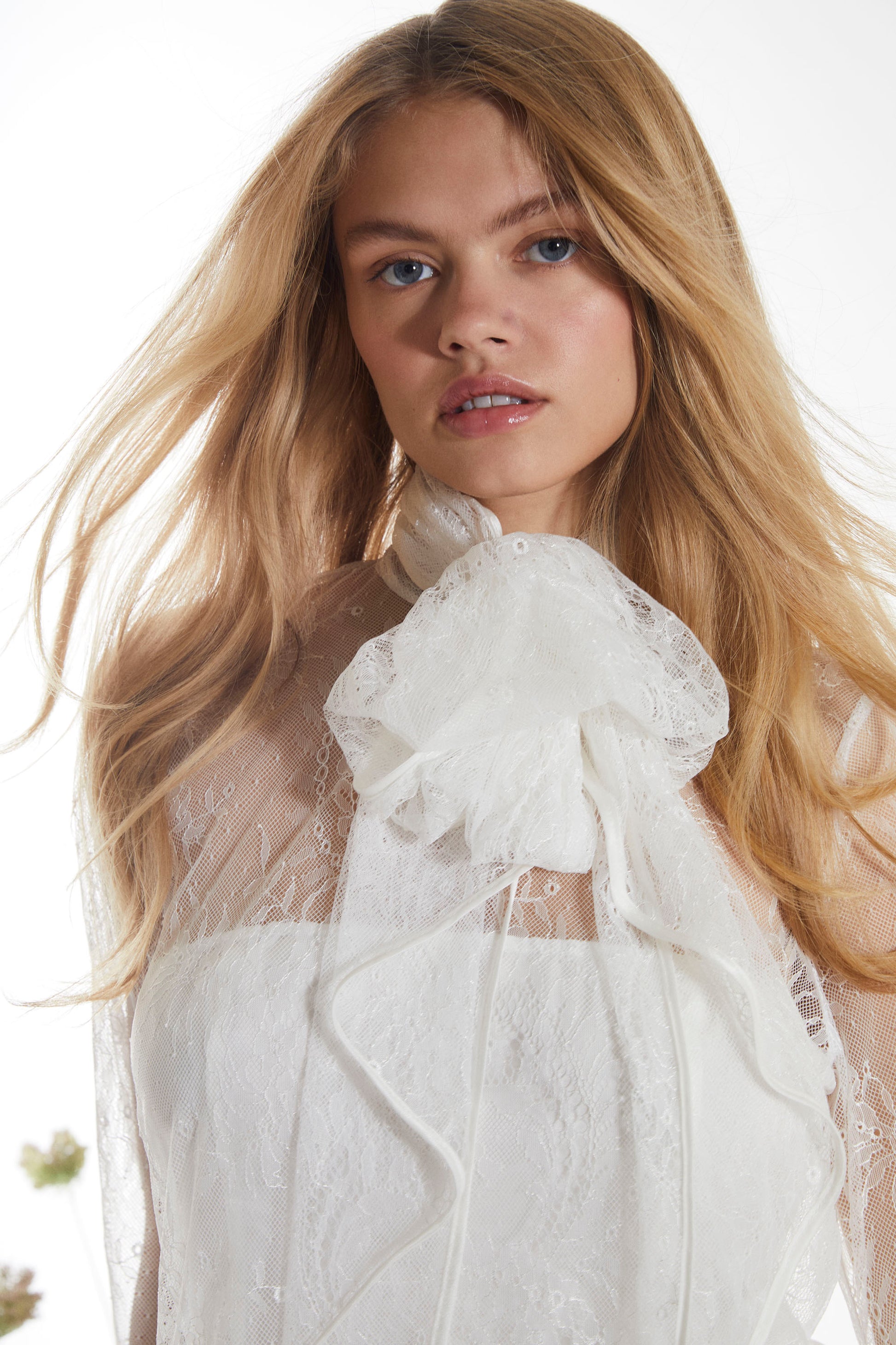 Introducing the MISELLE mini dress, a versatile and elegant piece designed to make you feel beautiful. This dress is composed of two separate pieces. The mini underdress is made of a luxurious silk and cotton blend, enhancing your curves with its silhouette and featuring a straight neckline that frames the bust line. The outer part is a mini-shirt dress with exquisite lace, scalloped finishes, and the ability to create a tie at the neck, adding an elegant finish to the dress.