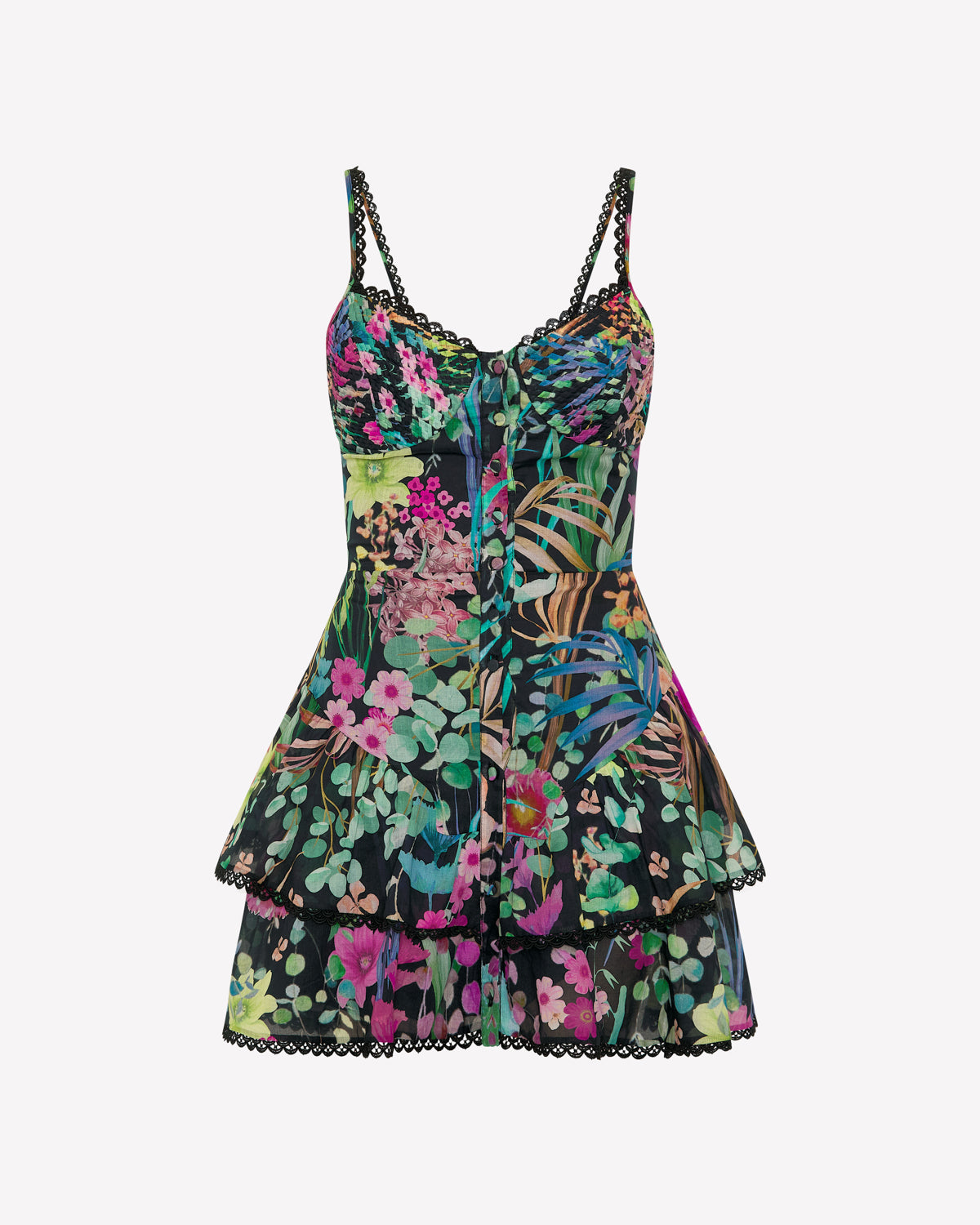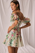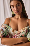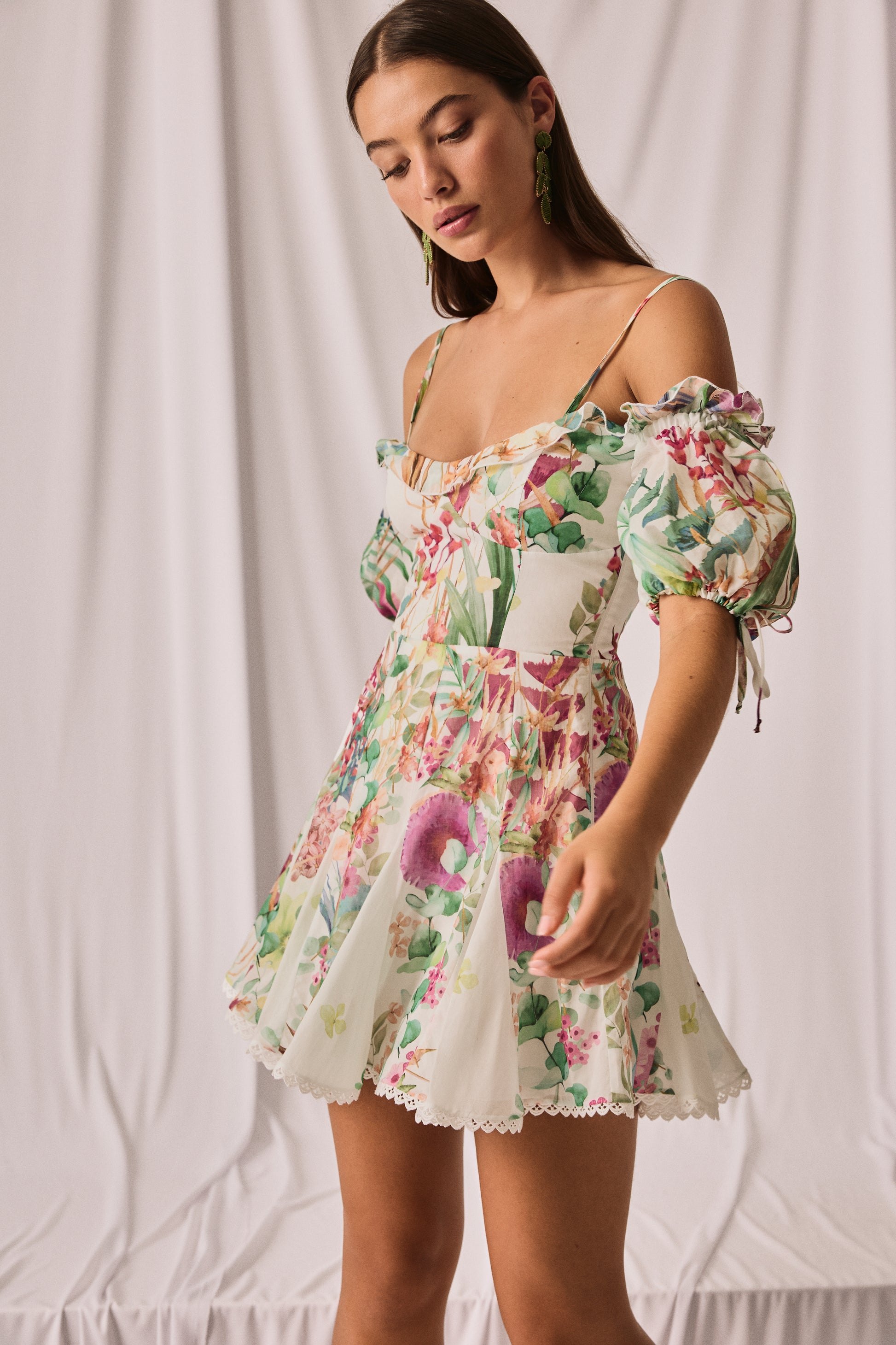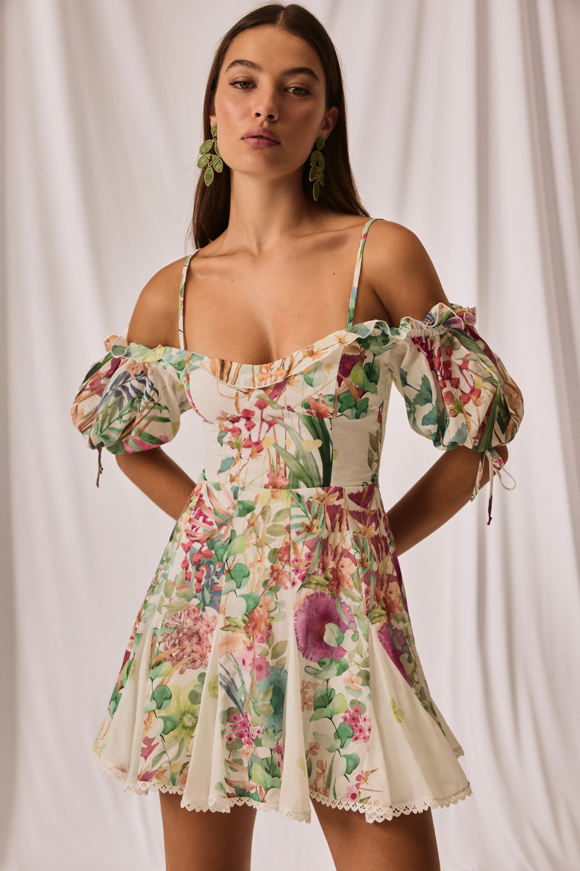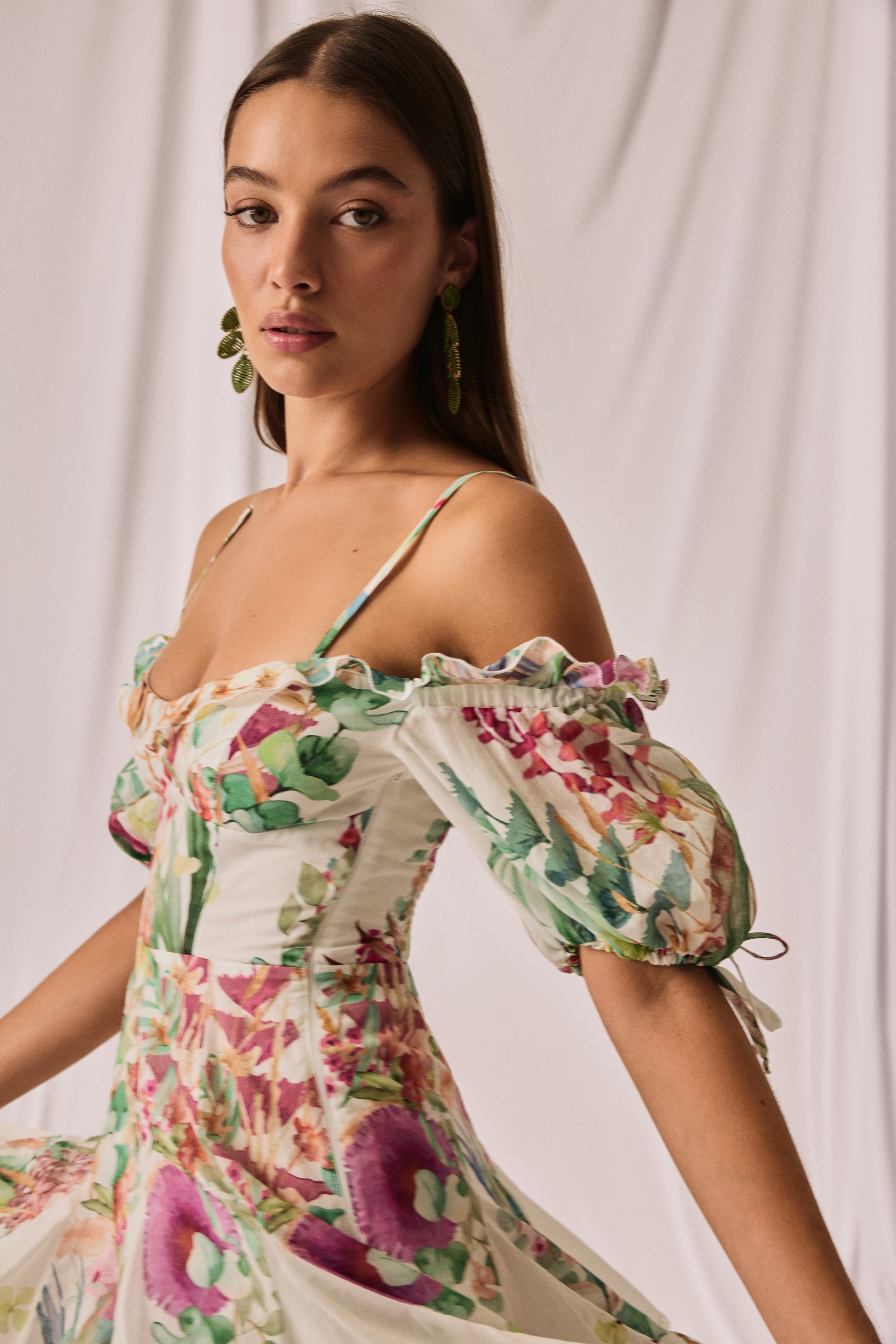 Designed to captivate, the SERIS dress is a romantic statement piece. In botanical printed cotton voile, it pairs a wide ruffled neckline that skims the shoulders with slender spaghetti straps for light support. Off-the-shoulder puff sleeves with tiny ties bring soft volume and feminine charm.
