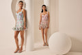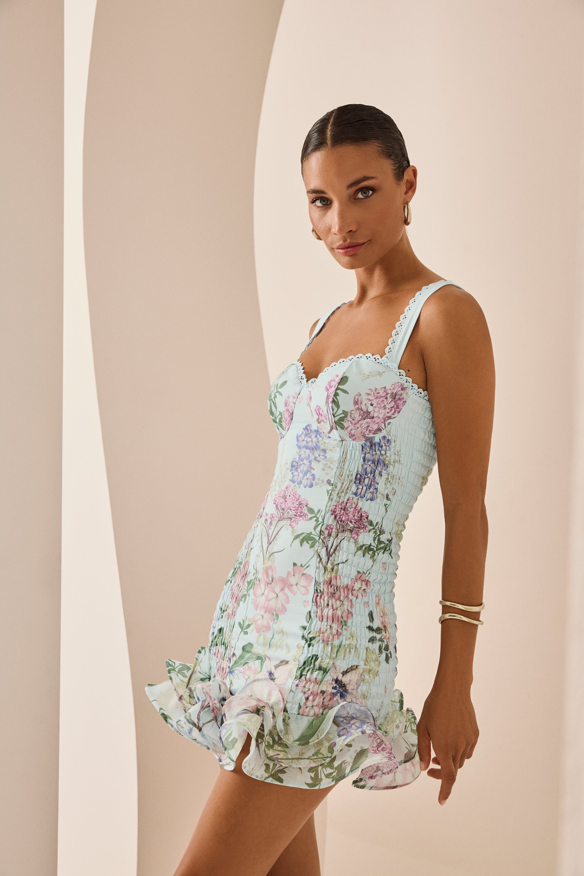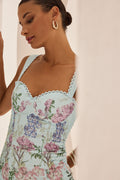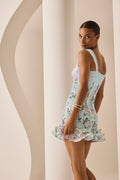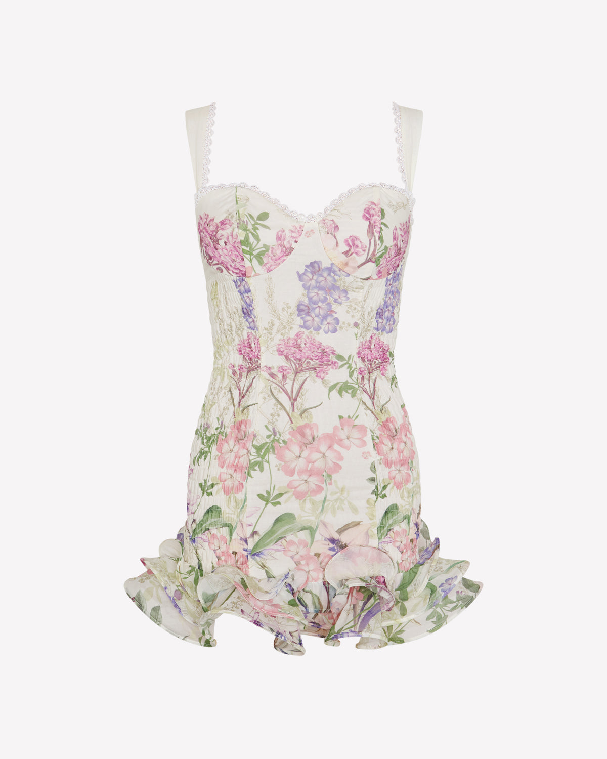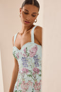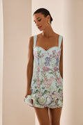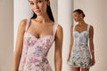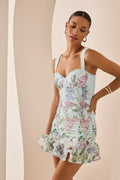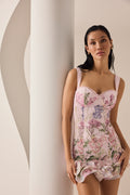 Discover the charm of the SUNIL dress, a design that blends femininity and structure with a fresh, sophisticated touch. Crafted in floral printed fabric, it features a bustier neckline that delicately enhances the bust, while the fitted bodice creates a streamlined silhouette. The flounced hem adds movement and a playful accent, making it the perfect piece for summer events where elegance meets freshness.