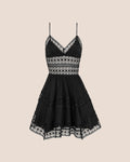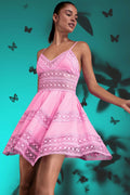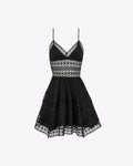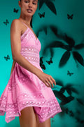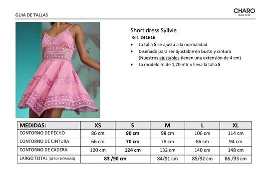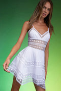 The Syilvie mini dress combines all the elements that make up the perfect summer piece. Its feminine embellished neckline and straps are joined by a delicate guipure bodice to finish with a light skirt with asymmetrical ends that give the creation a precious movement.