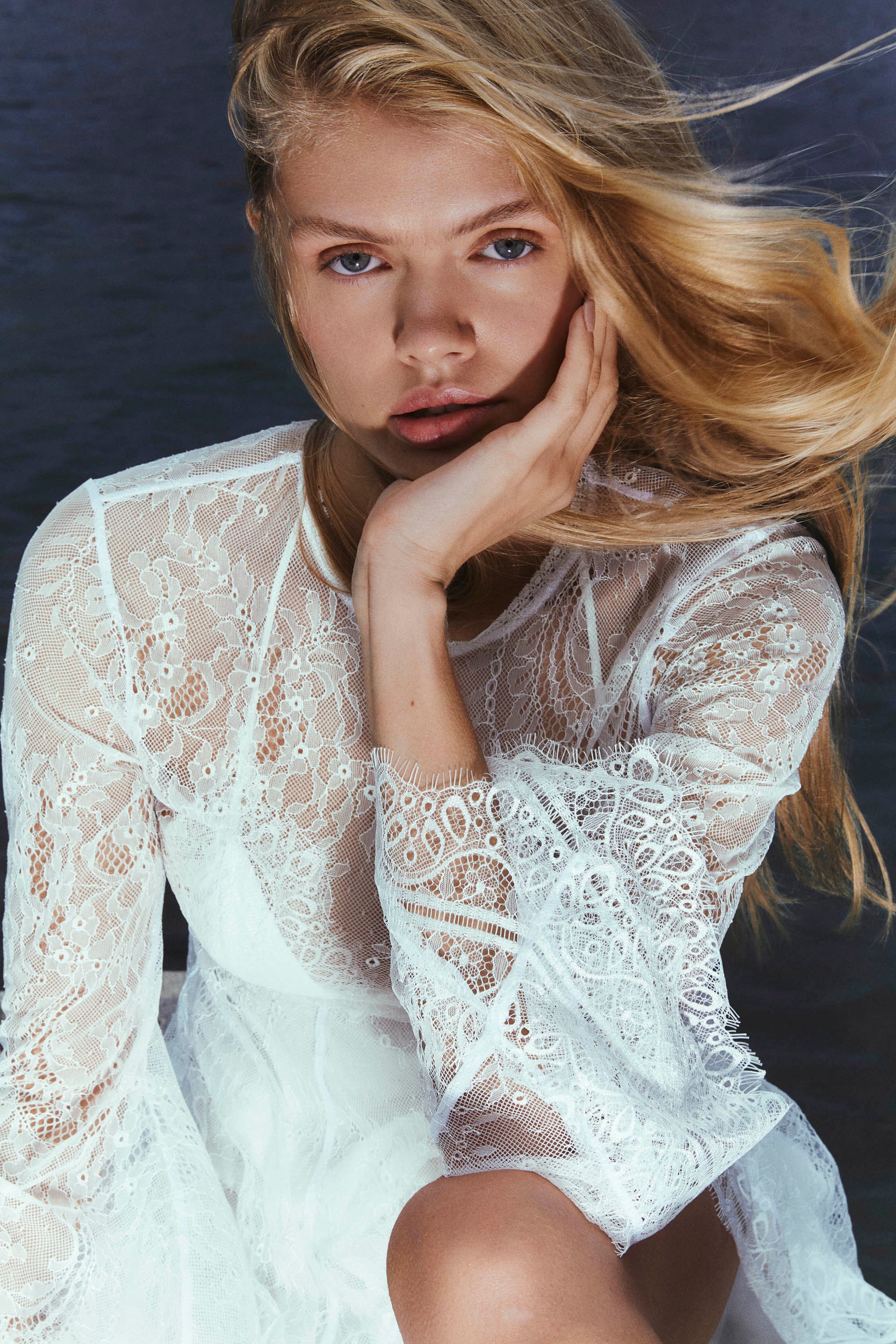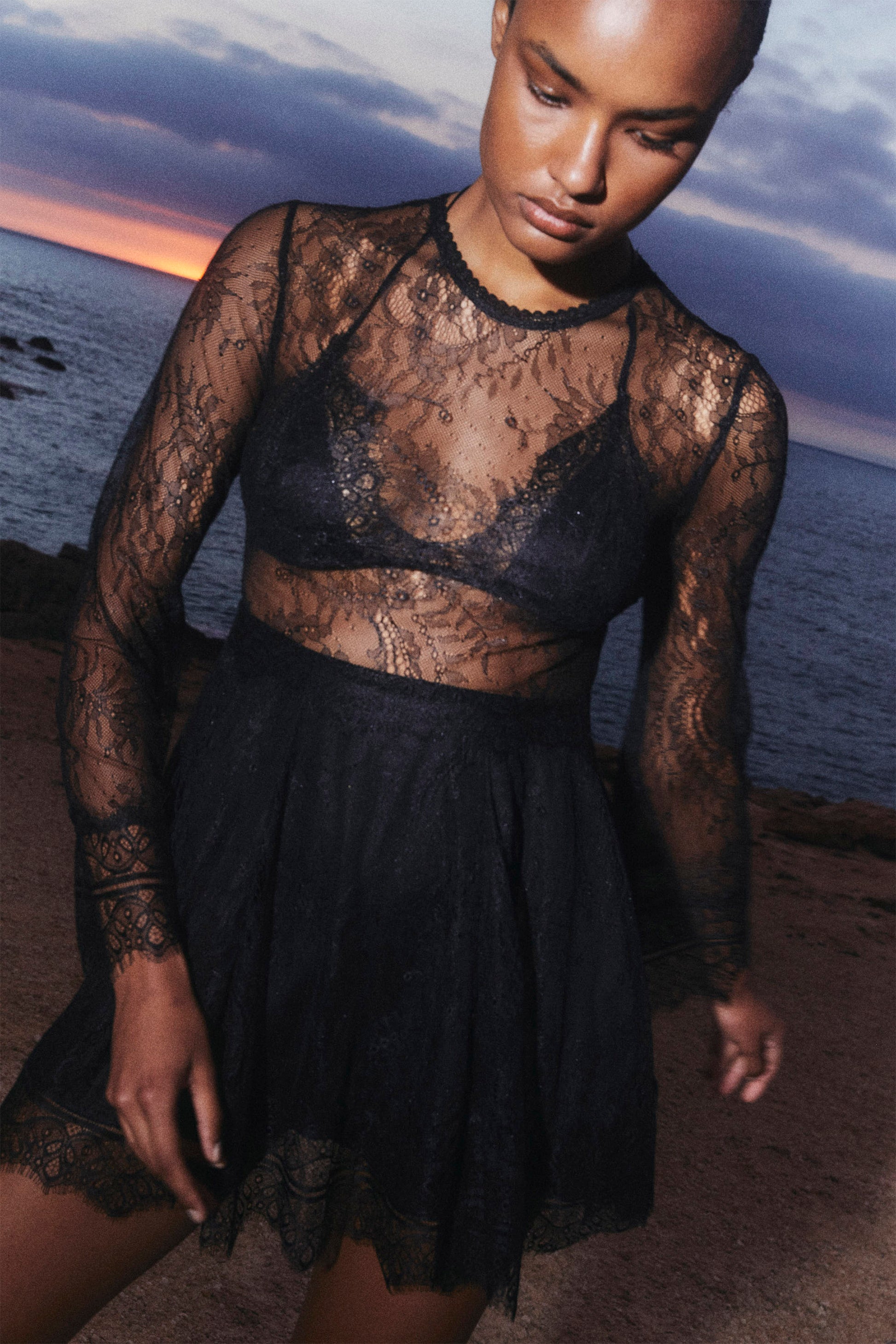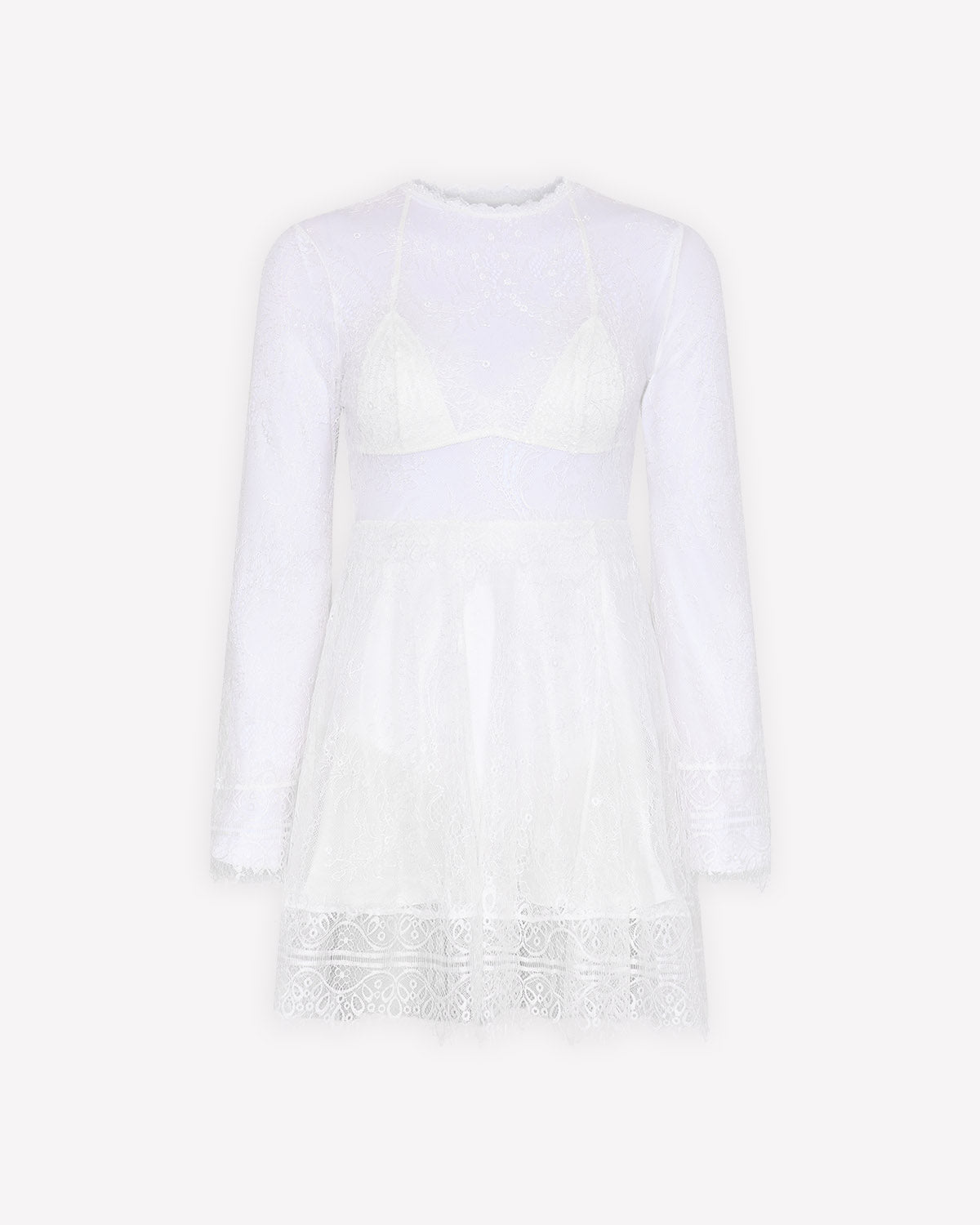 Our THONE mini dress, made with delicate lace, features a skater cut that highlights the waist and creates a flattering silhouette. Its scalloped ends and separate lingerie-like top that covers the bust make this a completely elevated and exquisite garment.