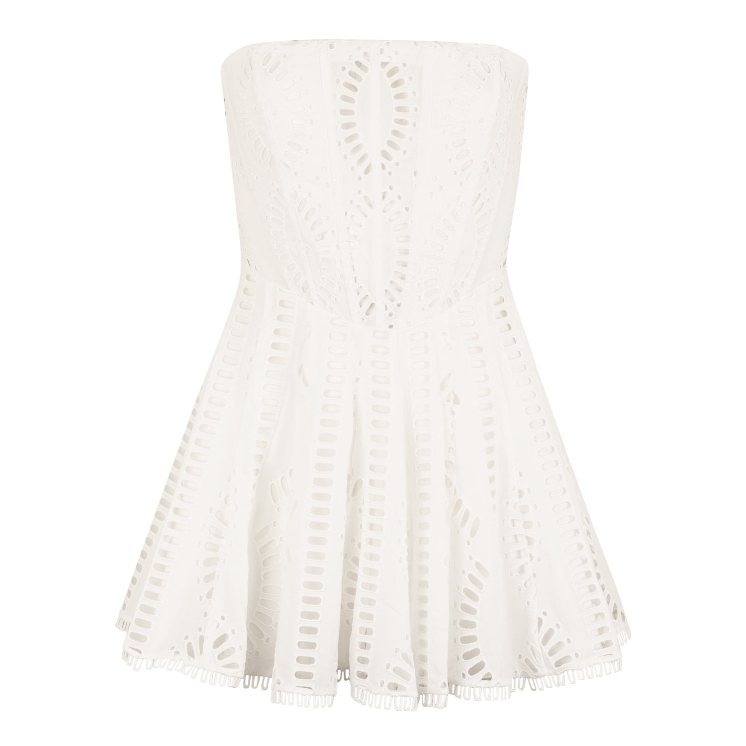 The Zannick dress, with its strapless neckline and cinched body, is perfect to feel gorgeous and comfortable. Its delicate structure made of embroidered fabric creates a feminine silhouette full of movement. The disposition of the chest panels create dimension and depth.