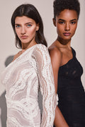 The asymmetric neckline frames the bust with a flowing wave pattern that adds rhythm and movement, while the long sleeve brings balance and poise. A bold yet delicate piece that turns any look into a style statement.
