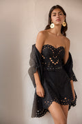 The scalloped hem, adorned with organic-inspired embroidery, brings texture and visual charm. A matching belt defines the waist and adds a touch of character. A versatile and refined piece, ideal for elevating any daytime look.
