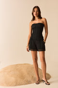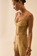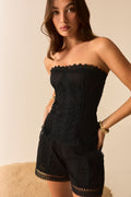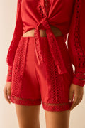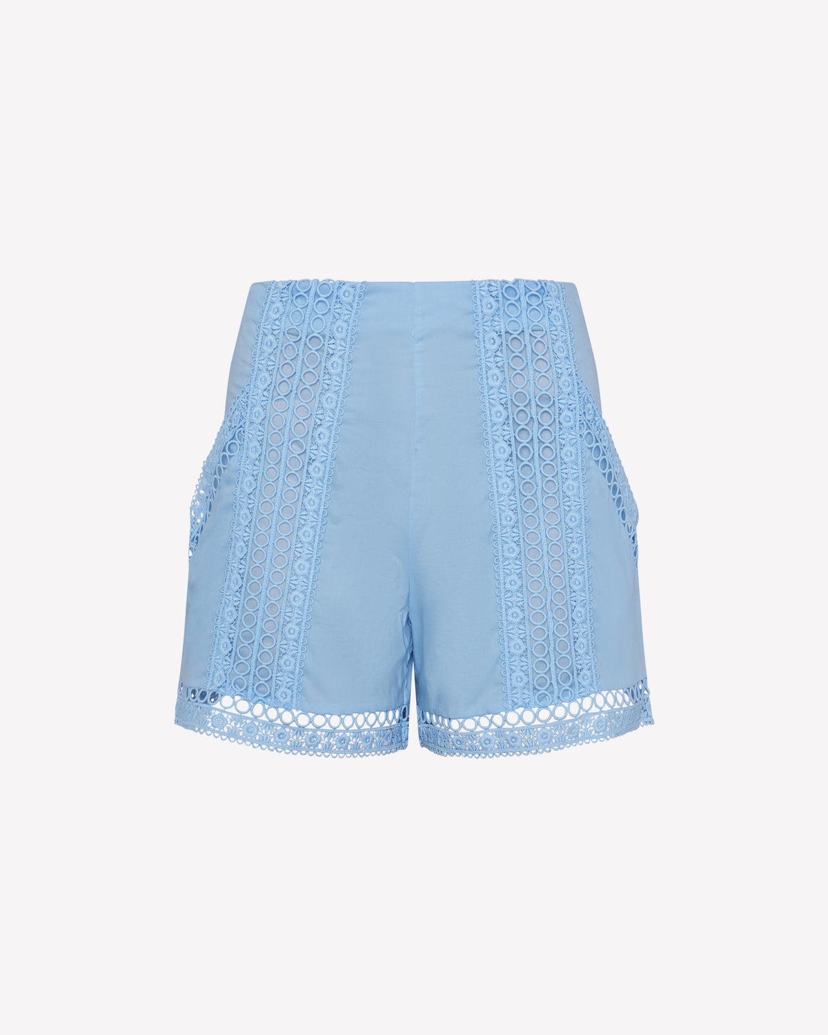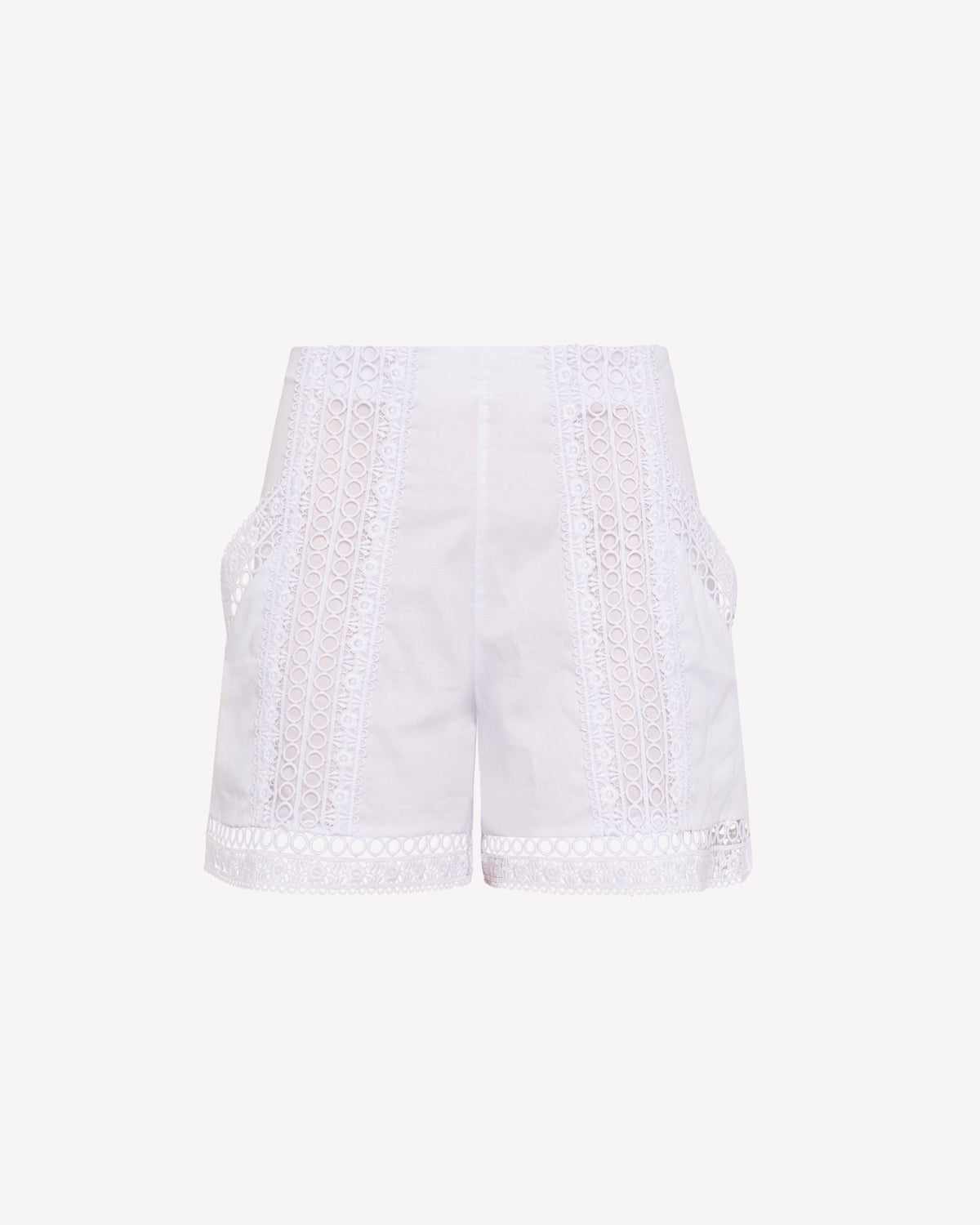 The ORALIA shorts are a versatile piece that combines freshness with sophistication. Crafted from cotton, they feature a high-waisted silhouette that flatters the figure, enhanced with embroidered lace running vertically along the design and framing the side pockets. The hem is also finished with lace, adding an artisanal and feminine touch. A perfect garment for creating relaxed yet feminine summer looks, ideal for both day and evening wear.