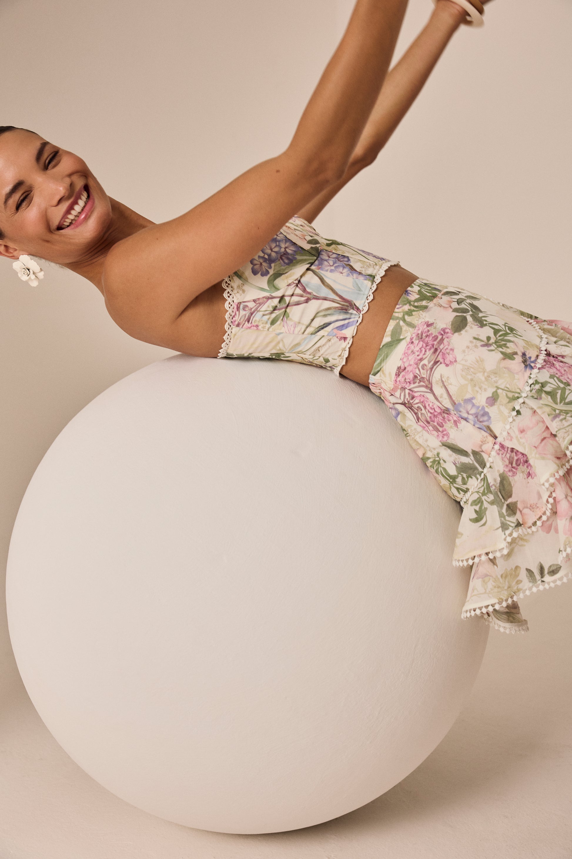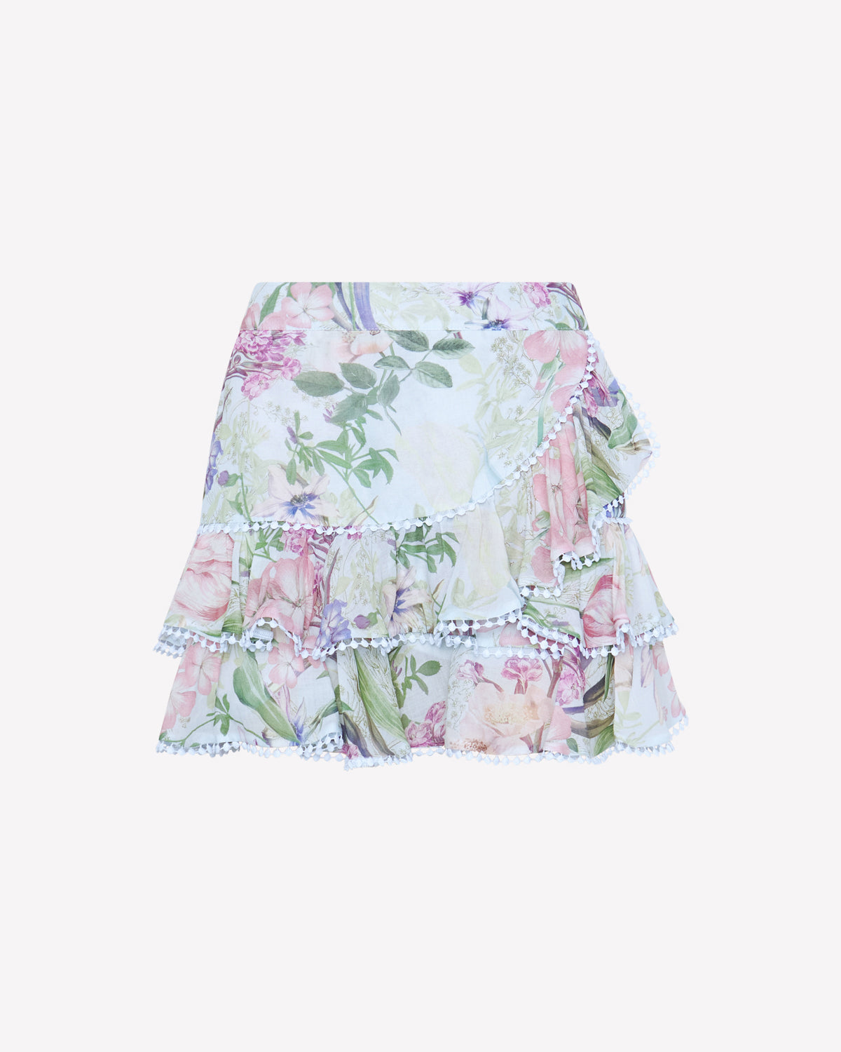 Fall in love with our FERA skirt, a piece that blends movement, delicacy, and unmistakable feminine charm. Crafted from soft floral-printed fabric, its layered ruffle design is enhanced with embroidered lace trims that add an artisanal and sophisticated touch. The fitted waistband defines the silhouette, while the asymmetric, flowing hem brings dynamism to every step. Perfect for summer looks that embrace freshness, style, and a romantic feel.