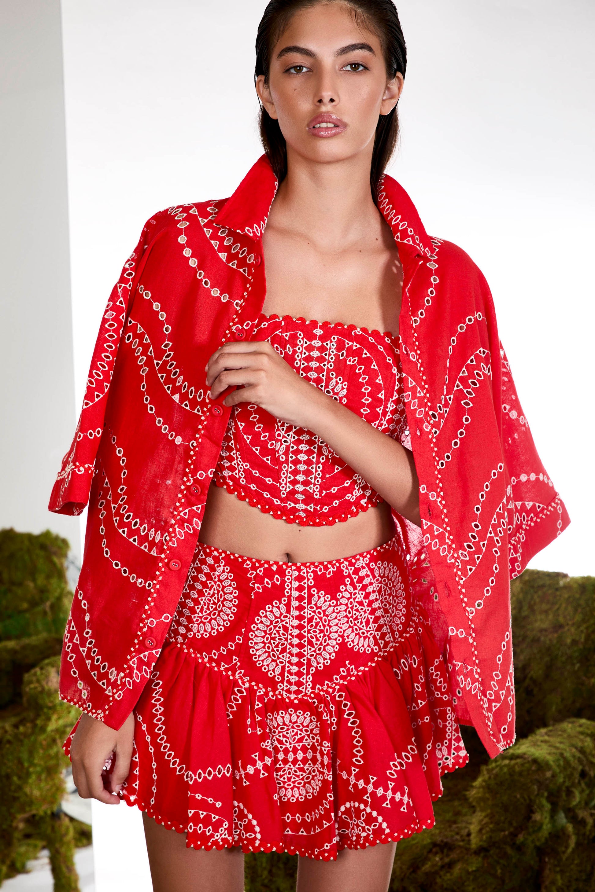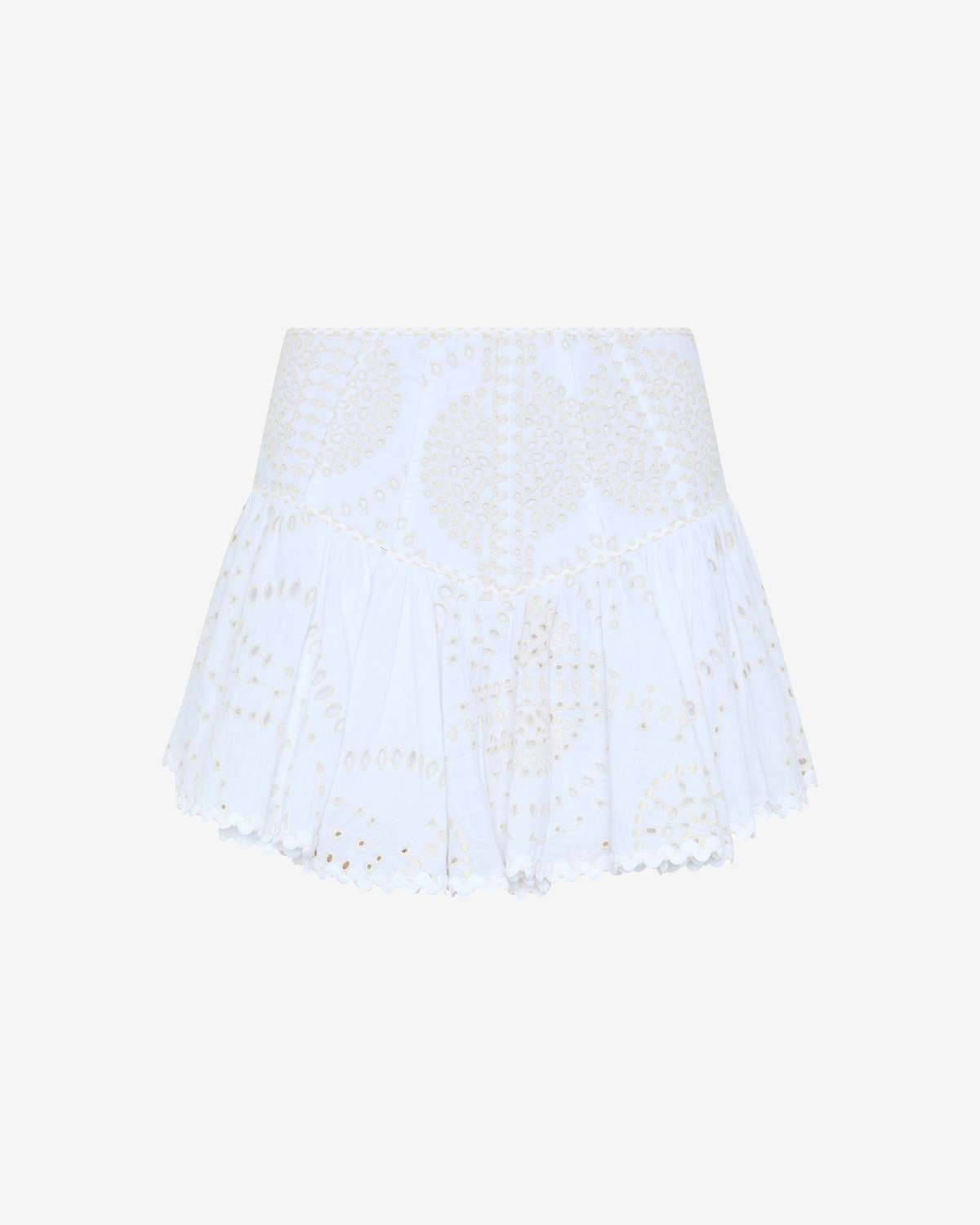 The MARLI mini skirt, crafted in embroidered cotton-linen blend, has a super feminine shape thanks to its embroidered yoke and its flounced skirt. The finishes of the piece are combined with its pattern to form a fresh, comfortable and delicate creation.