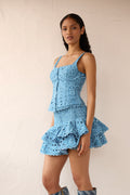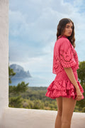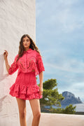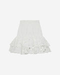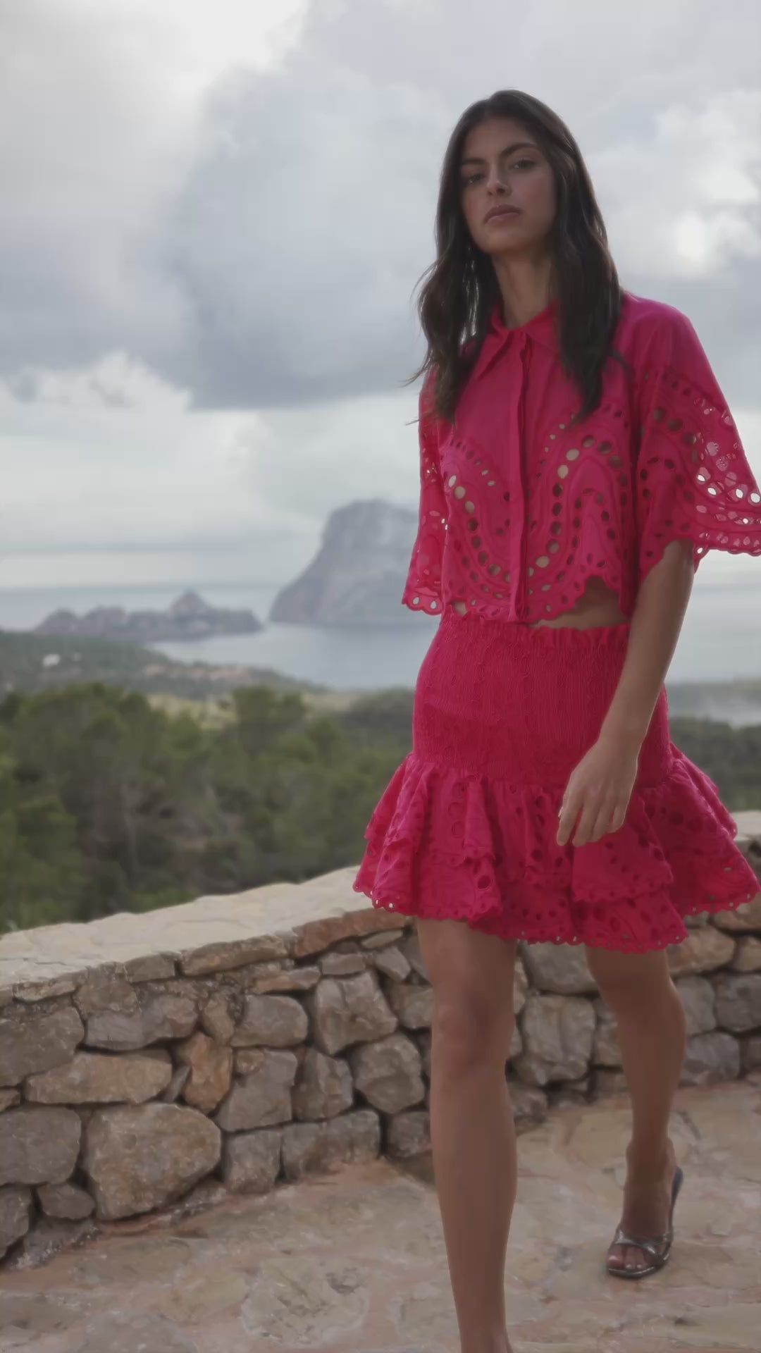 The design finishes with a double ruffled hem, adorned with artisanal embroidery and scalloped detailing, adding volume, rhythm, and playful charm. Perfect for light, feminine looks that invite you to embrace summer with natural elegance.