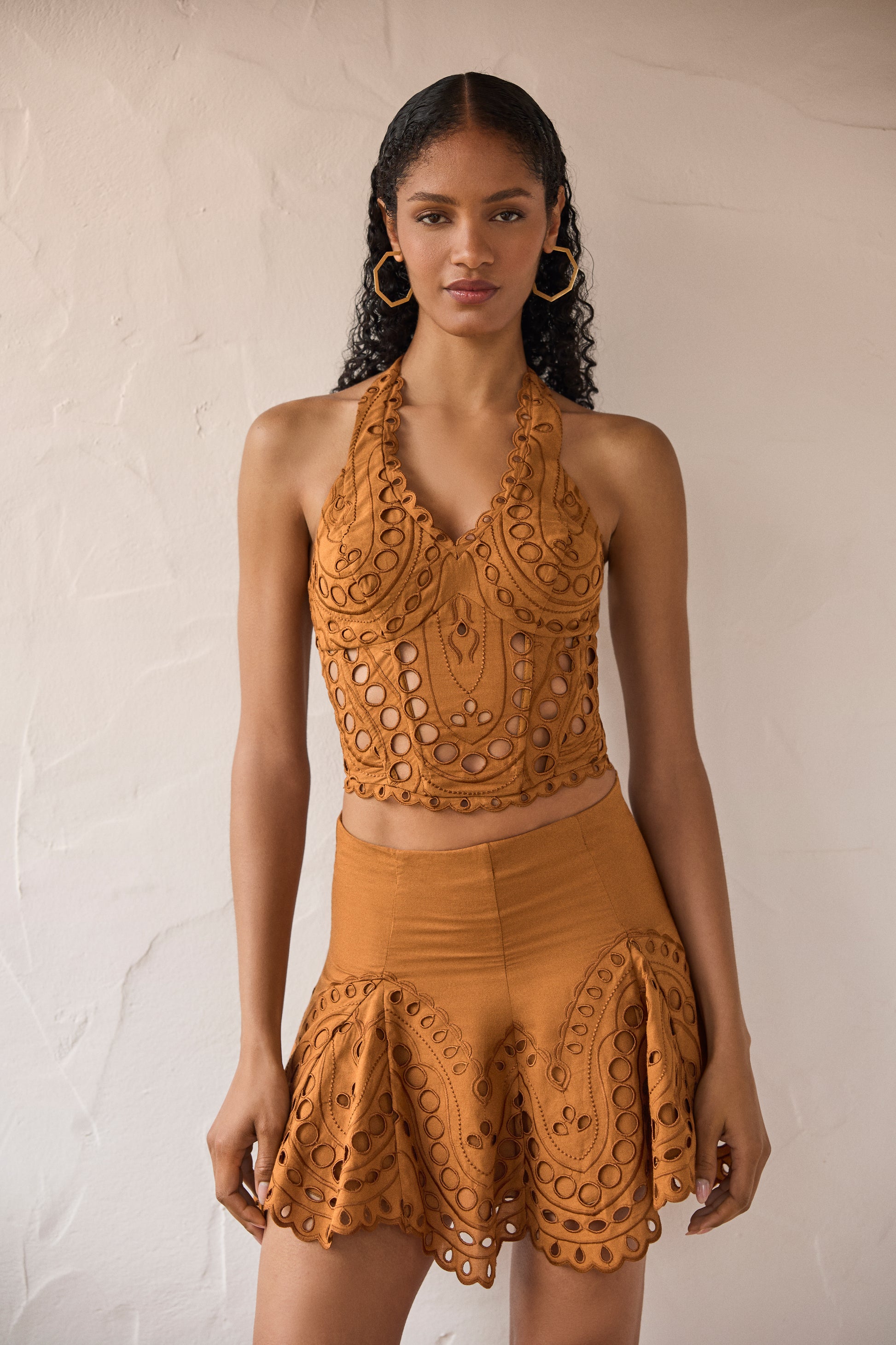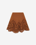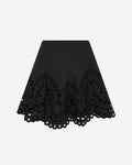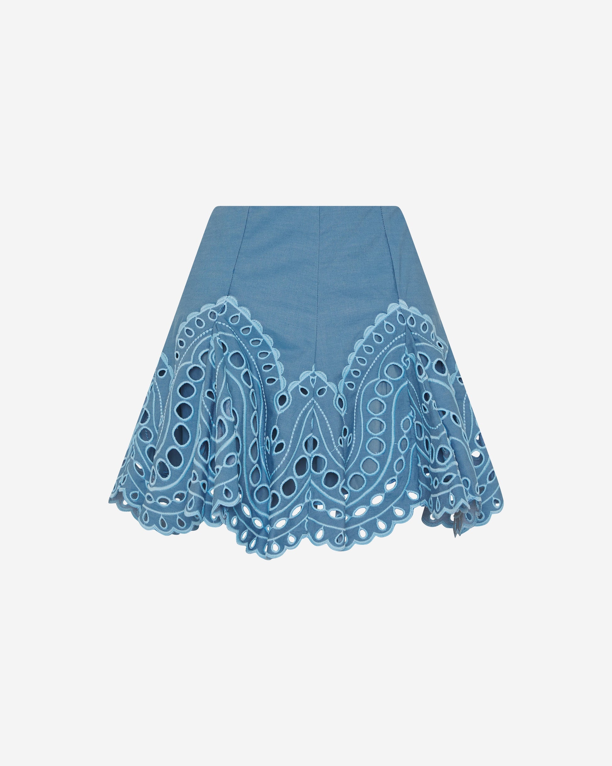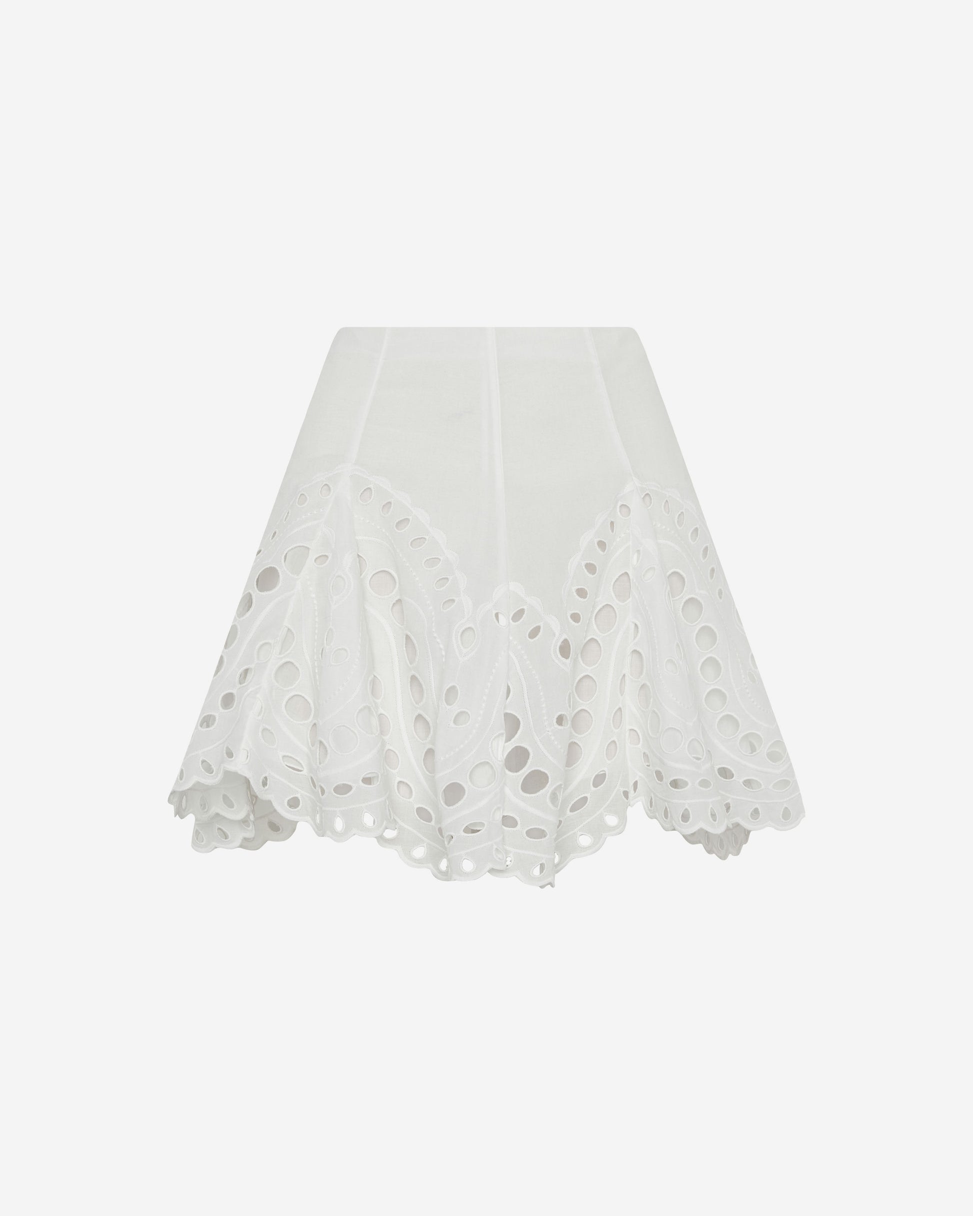 Artisanal embroidery and the scalloped finish at the hem add texture and visual charm, elevating the garment to a sophisticated level. Perfect to pair with structured tops or airy blouses, it’s a versatile piece with a romantic soul.