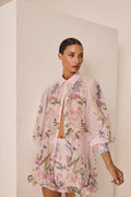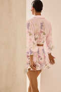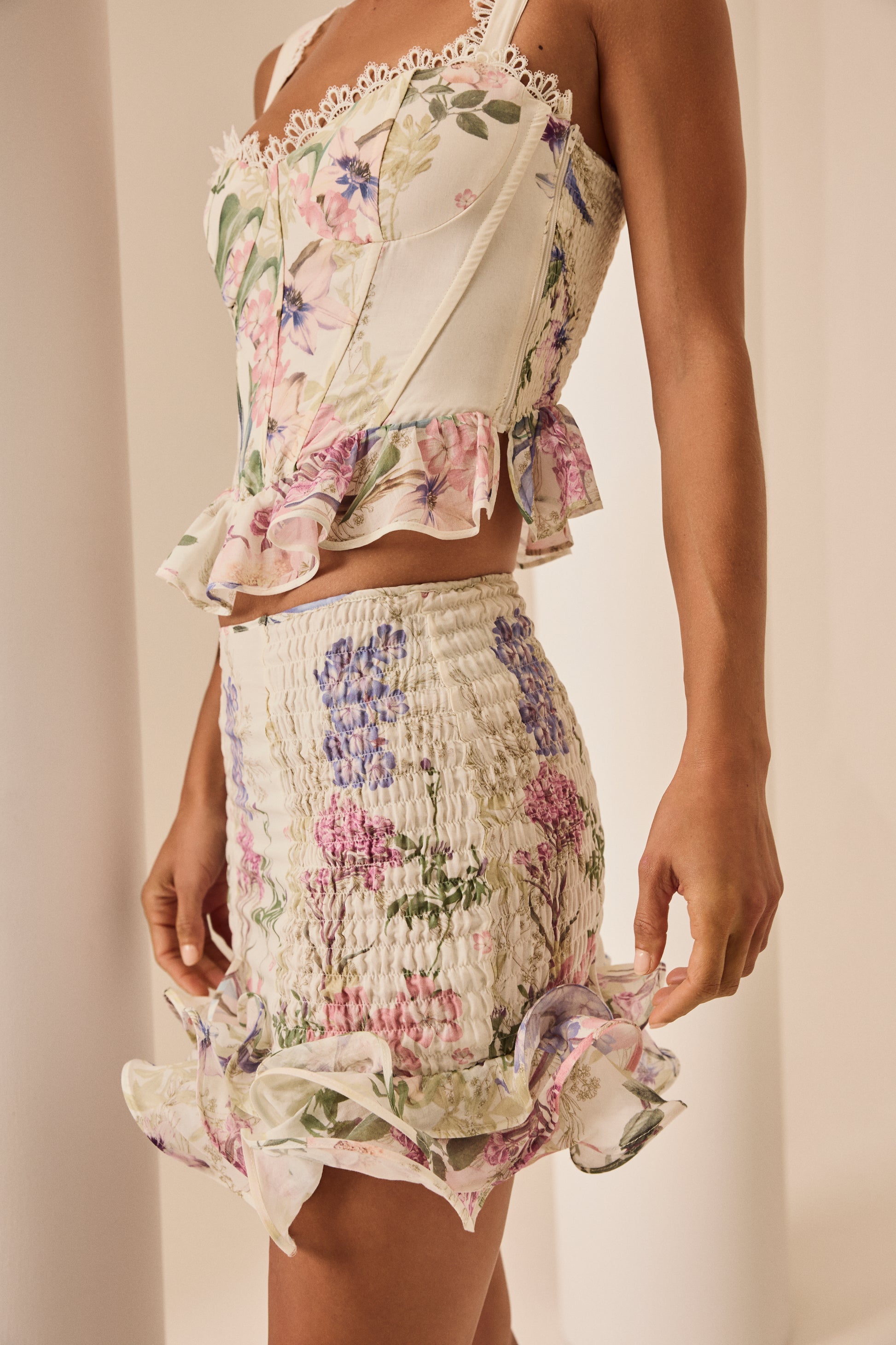 The TURMA skirt stands out for its delicate, feminine charm, combining a flattering silhouette with natural movement. Crafted from cotton with a floral print, it features a subtly flared cut that elongates the figure. The ruffled hem adds volume and dynamism, while the meticulous construction highlights every detail of the design. A versatile and radiant piece, perfect for creating summer looks full of freshness and romance.