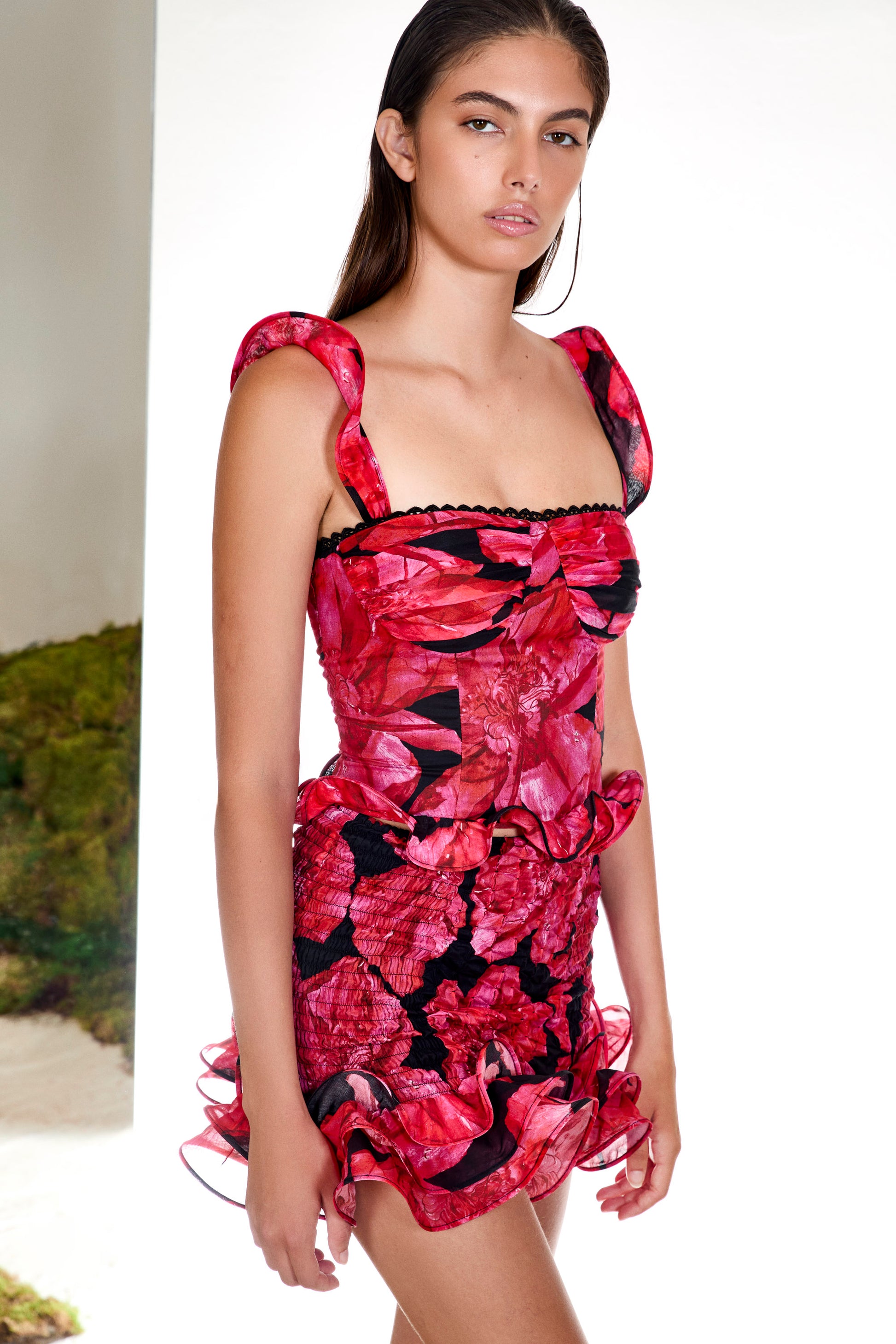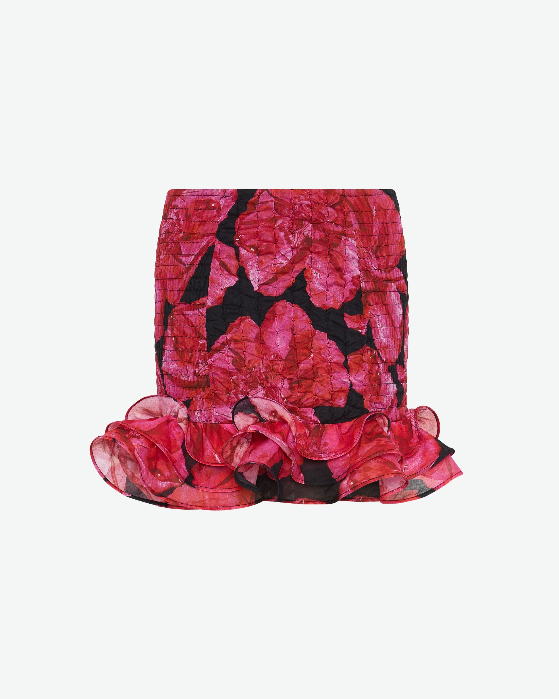The TURMA skirt, in cotton voile, is perfect to enhance your silhouette and lengthen your legs infinitely. Its 3D embroidery combines perfectly with our summer floral print, making an exquisite piece finished in sculptural ruffles.