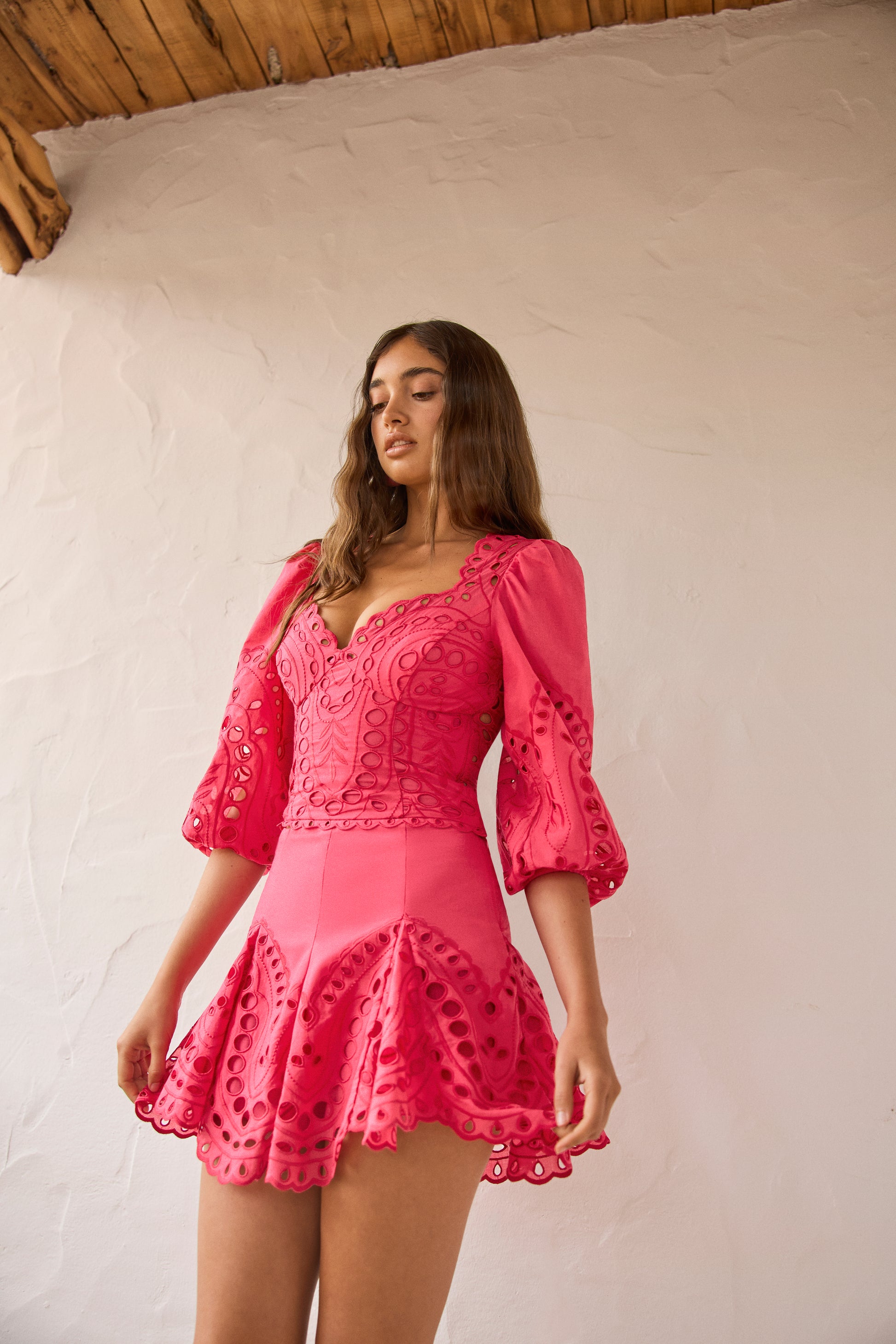 Long, voluminous sleeves add character and poetry to the design, blending strength with romantic flair. A discreet side zipper allows for easy wear while preserving its impeccable structure.